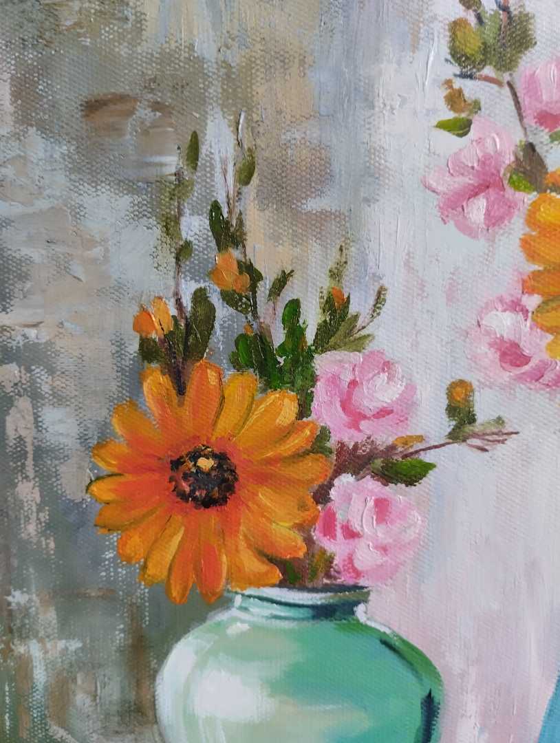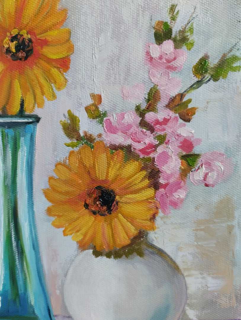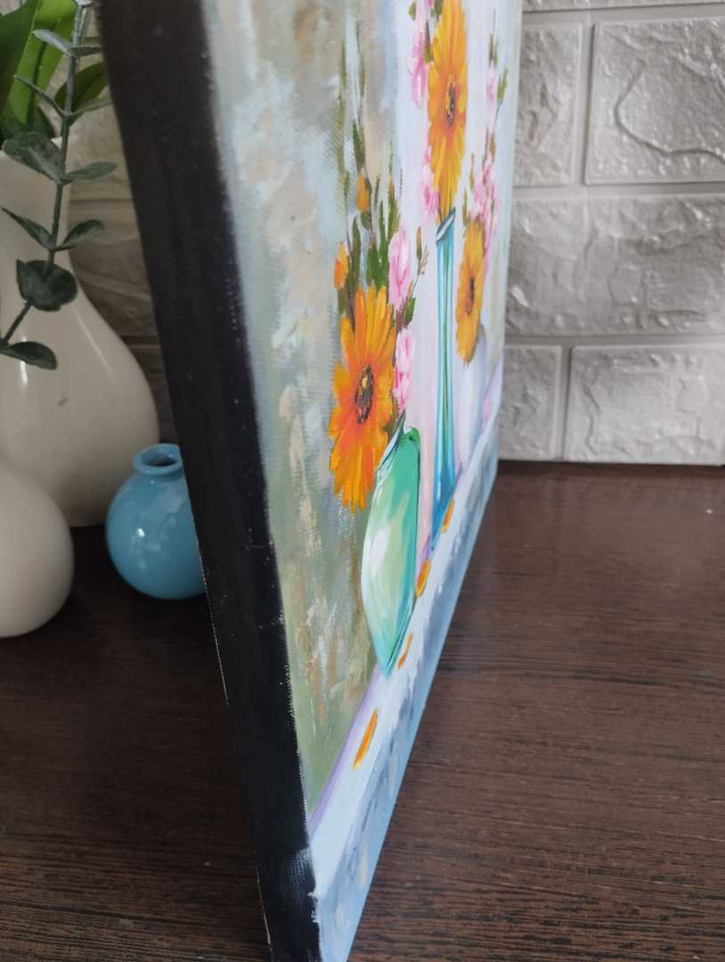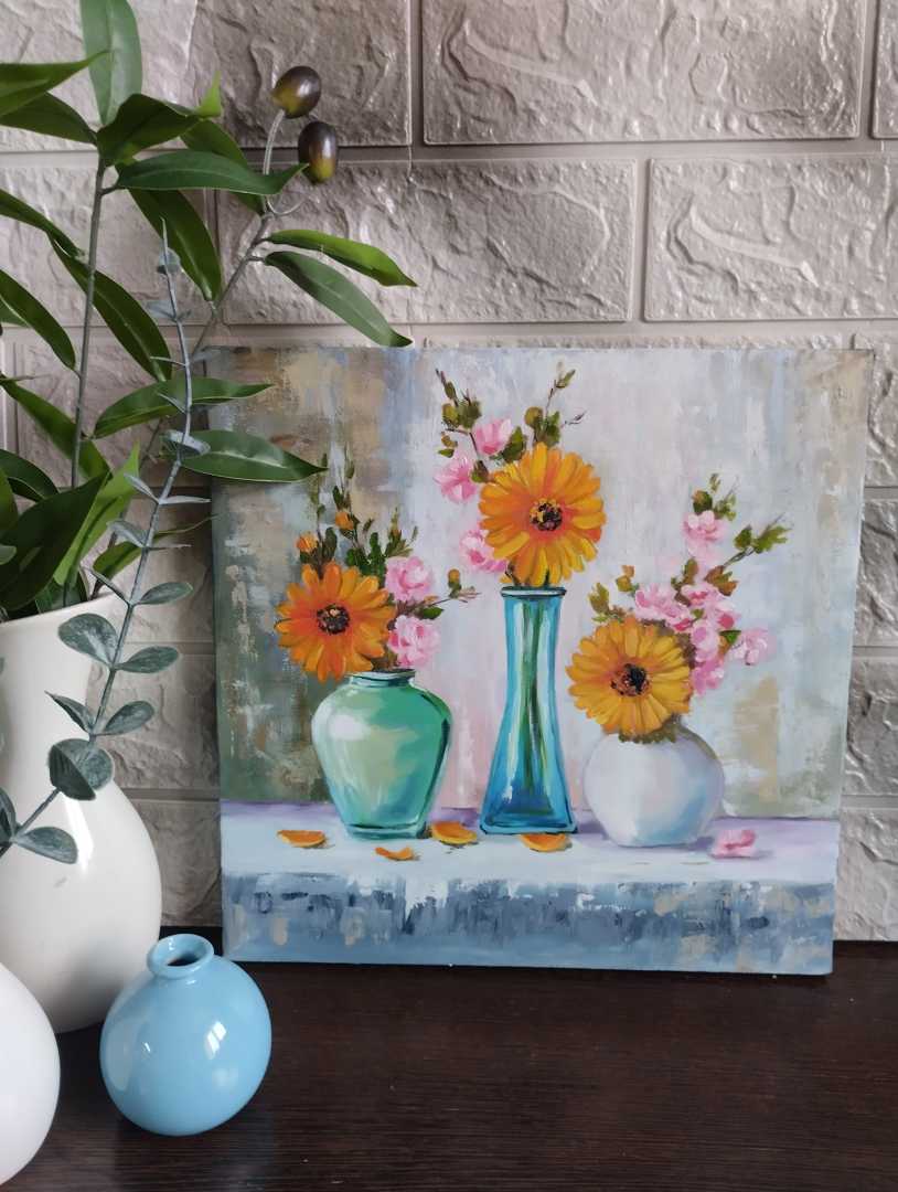Натюрморт маслом на холсте (30×30 см) — идеальный акцент для дома или офиса. Яркие герберы, нежные розы, три изящные вазы — композиция наполнена светом и гармонией.