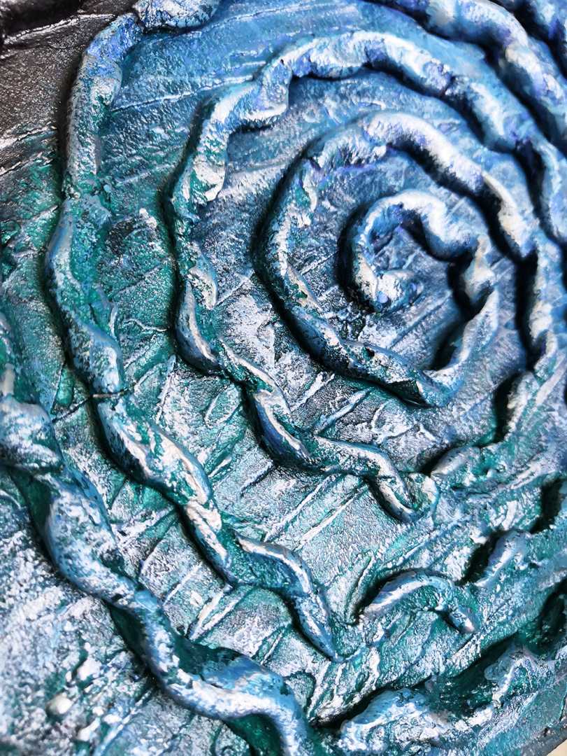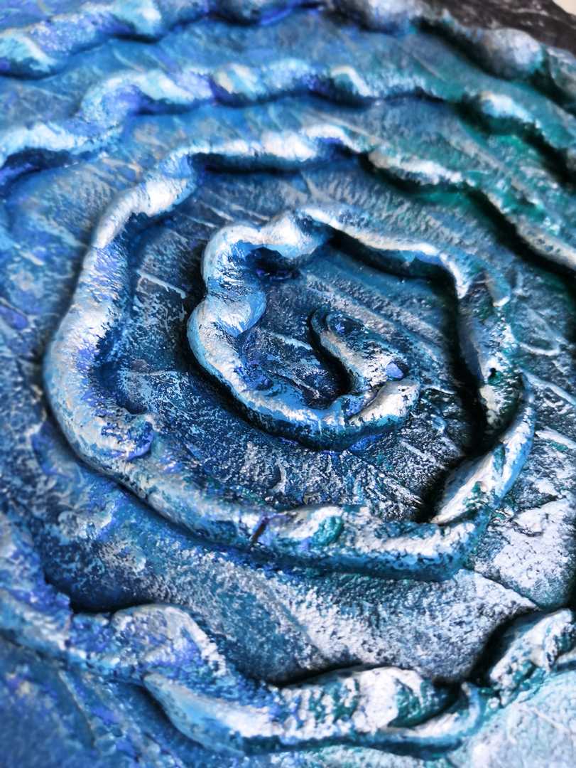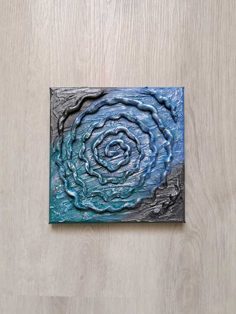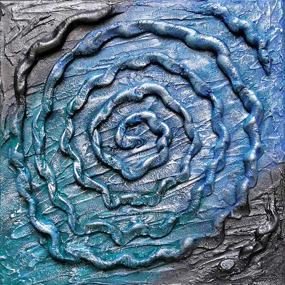 На этой картине изображена спираль, уходящая в темную глубину. Текстурированные линии, выполненные в синих и темно-серых тонах, создают ощущение движения и погружения. Синий цвет символизирует спокойствие и размышление, а темно-серые участки – загадочность и неизведанные уголки внутреннего мира. Кар