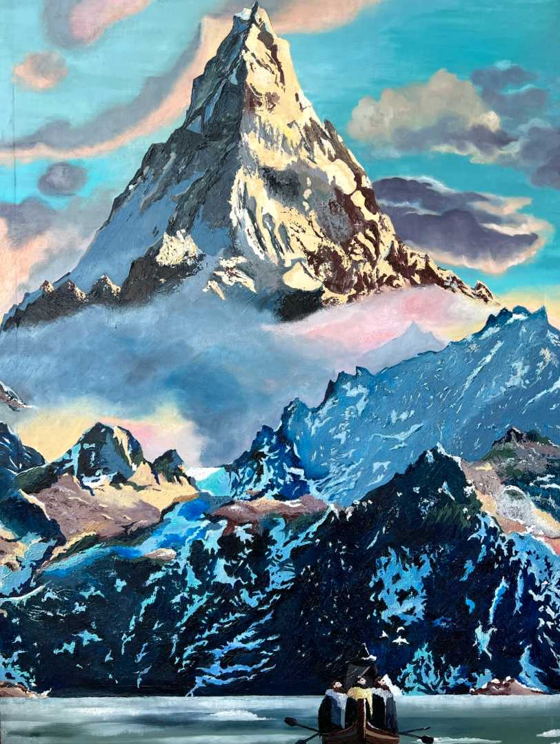 Большая картина маслом на холсте 147×104 см с изображением горы Эребор («Одинокой горы») по мотивам вселенной Толкина. Детализированный фэнтези-пейзаж с ледяными вершинами и лодкой у подножия горы станет эффектным акцентом интерьера и исправлен подарком сторонникам «Хоббита» и мира Средиземь