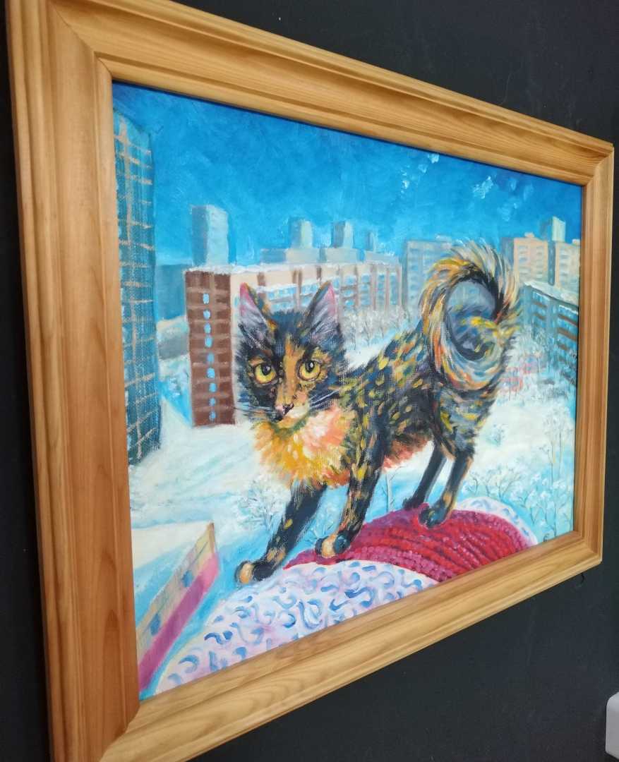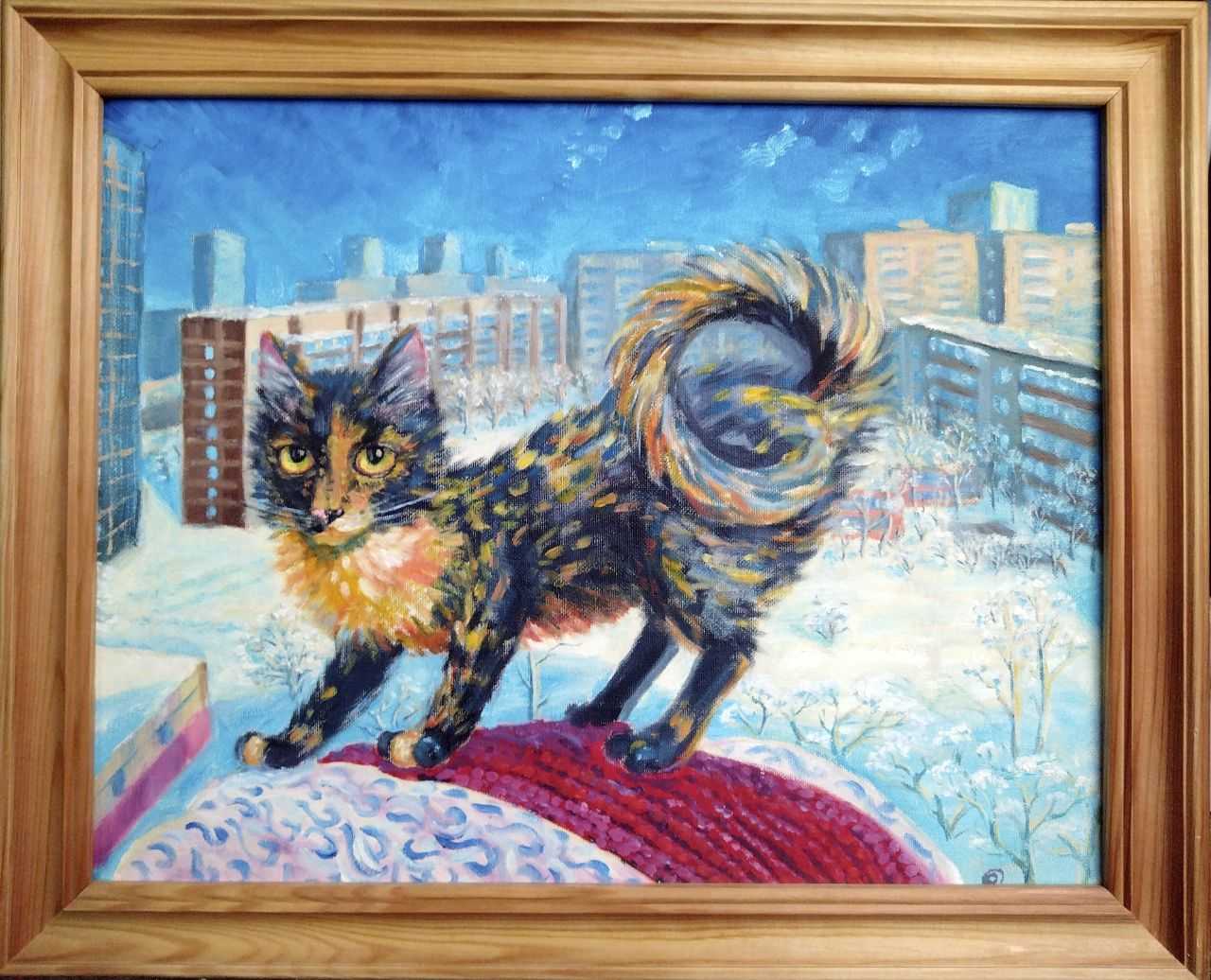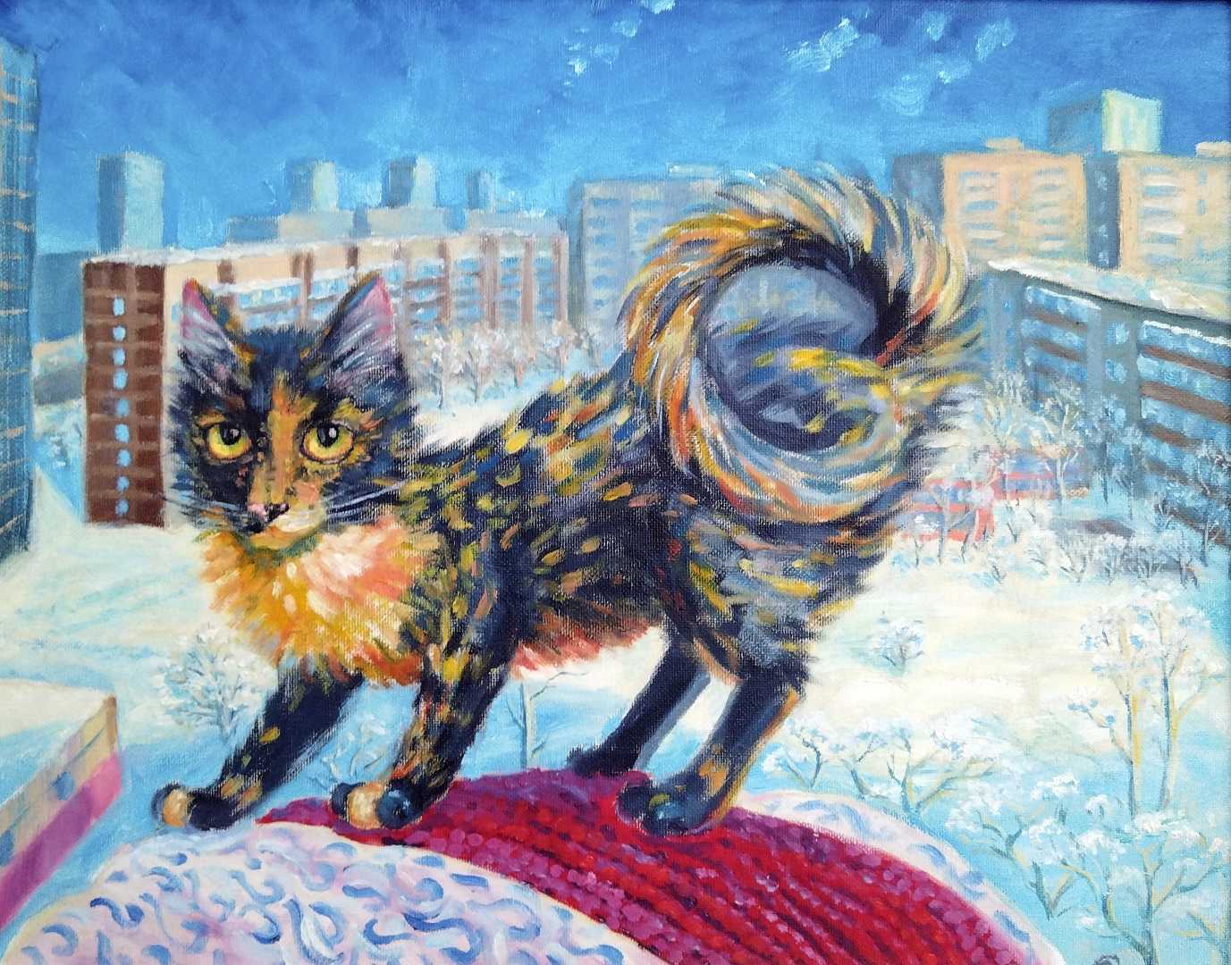 Портрет кошки на фоне городского пейзажа. И если вам кажется, что у неё хвост как у собаки, то вам не кажется.