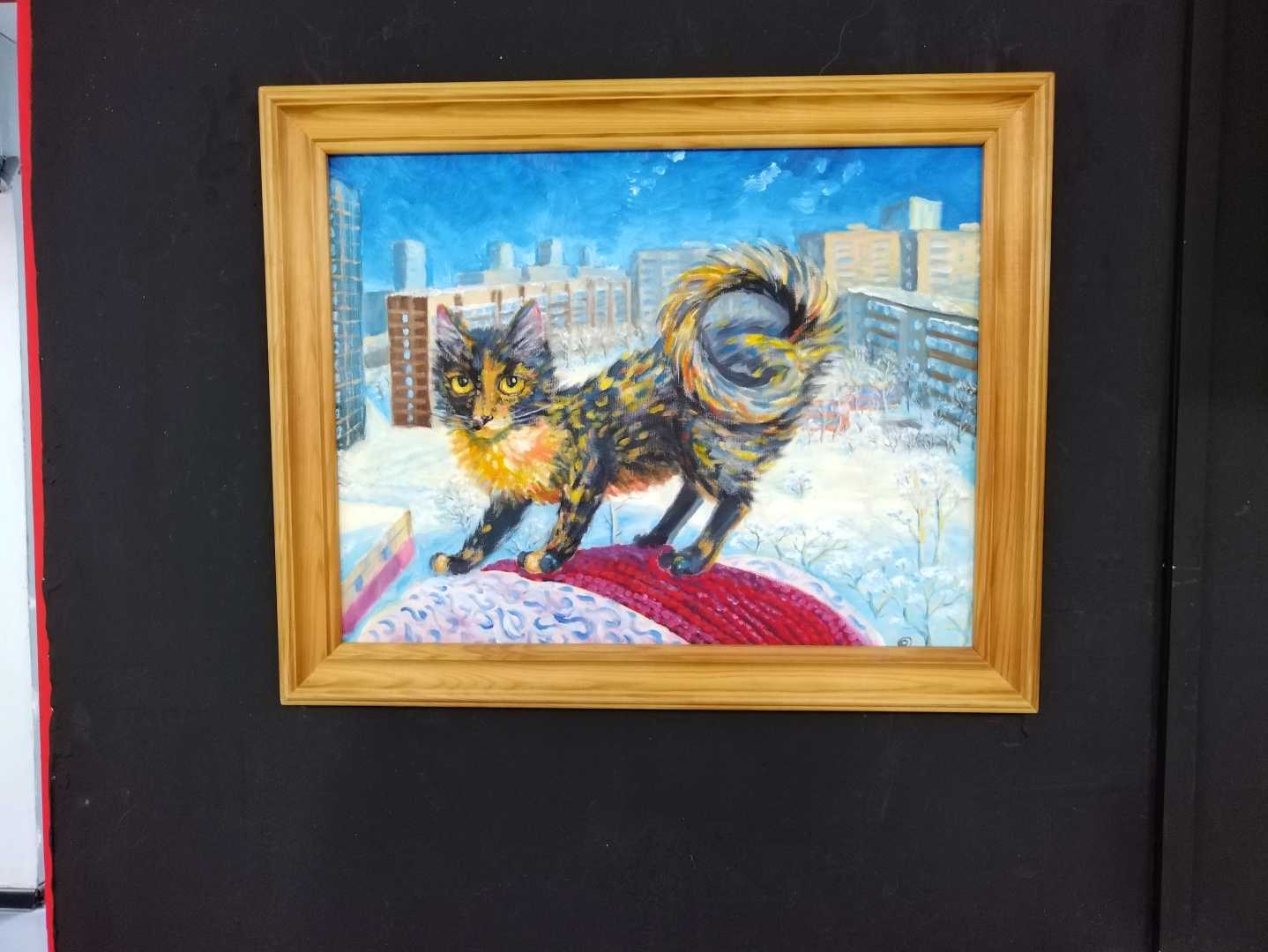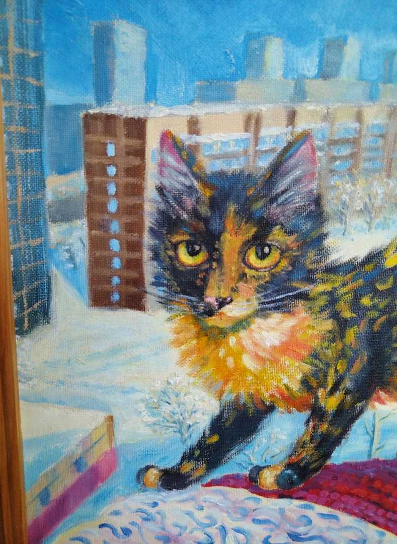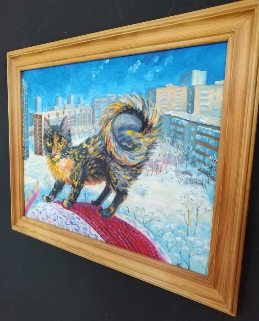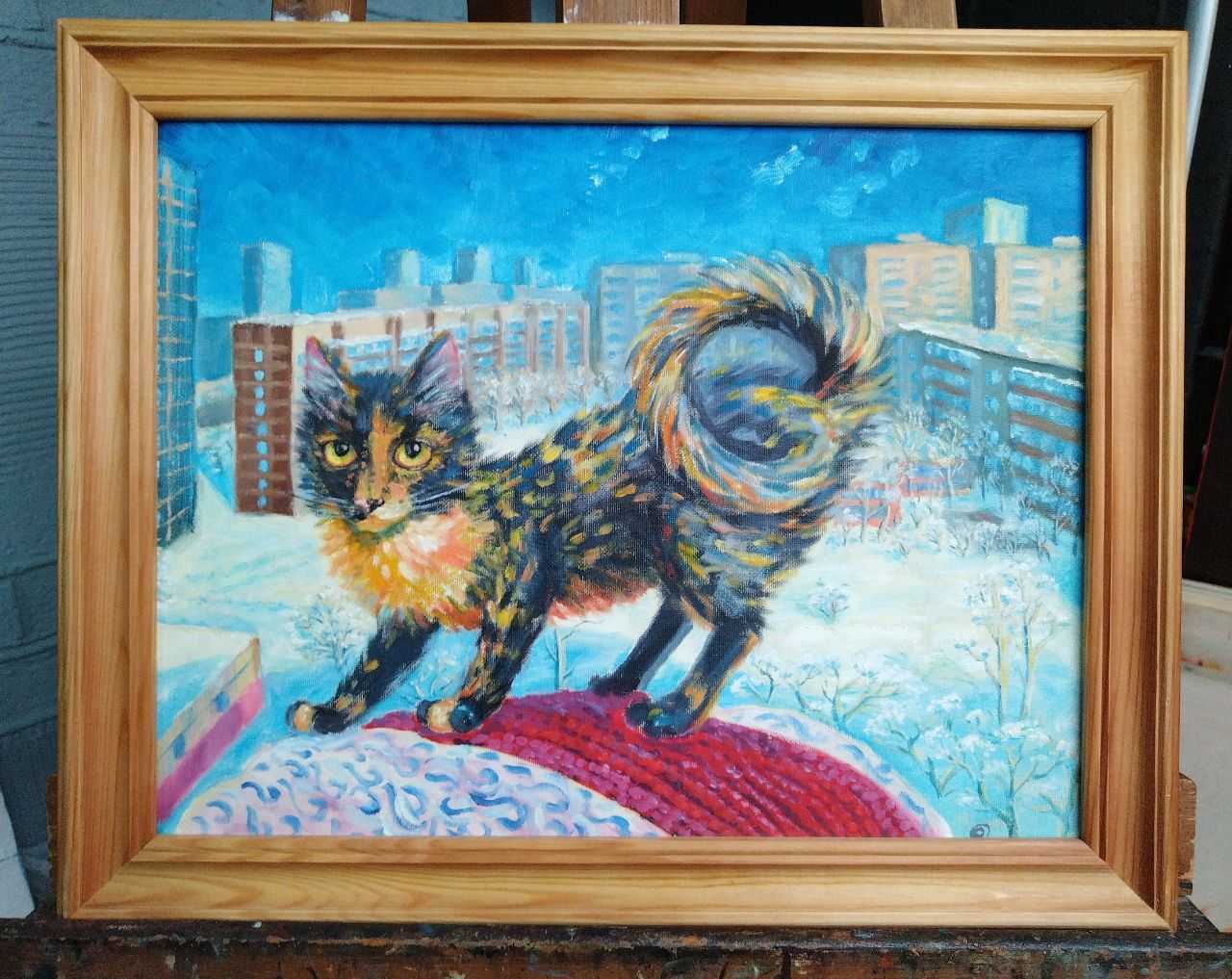 Портрет кошки на фоне городского пейзажа. И если вам кажется, что у неё хвост как у собаки, то вам не кажется.