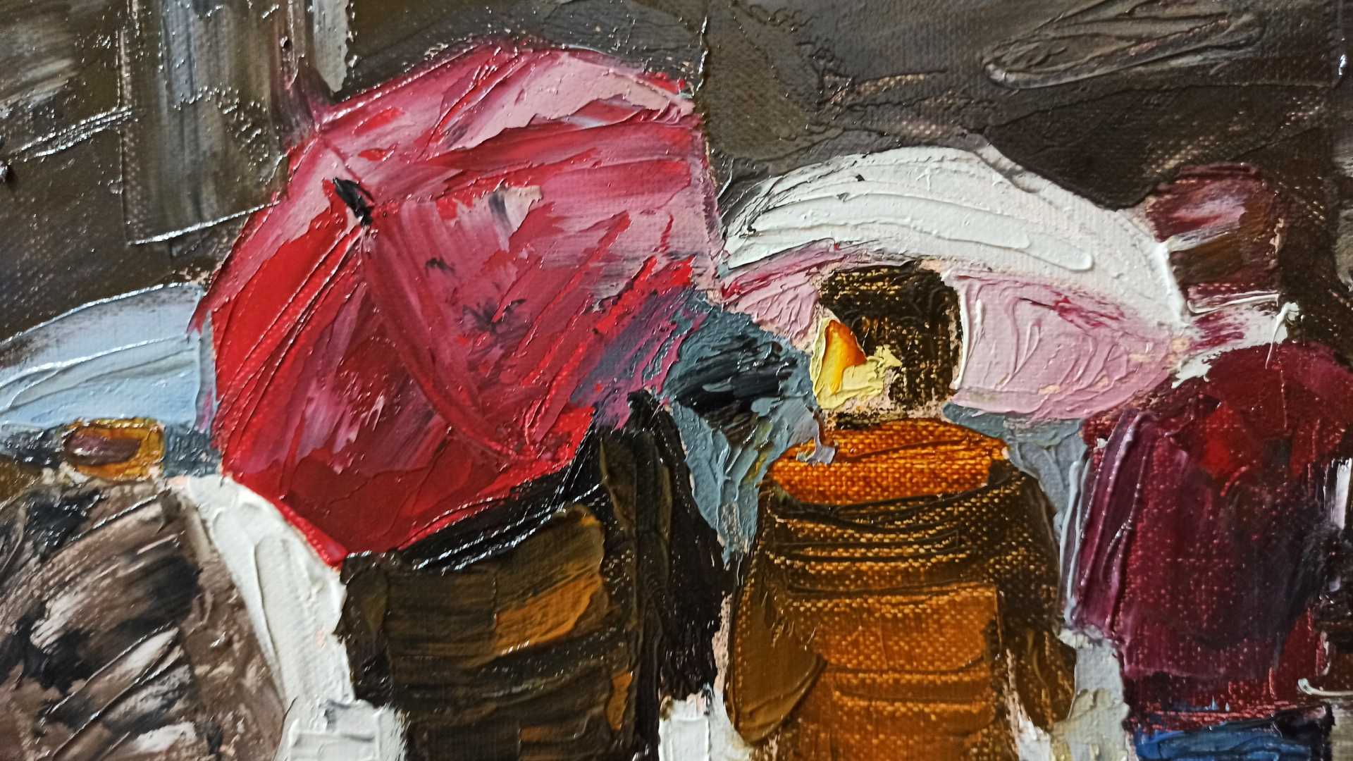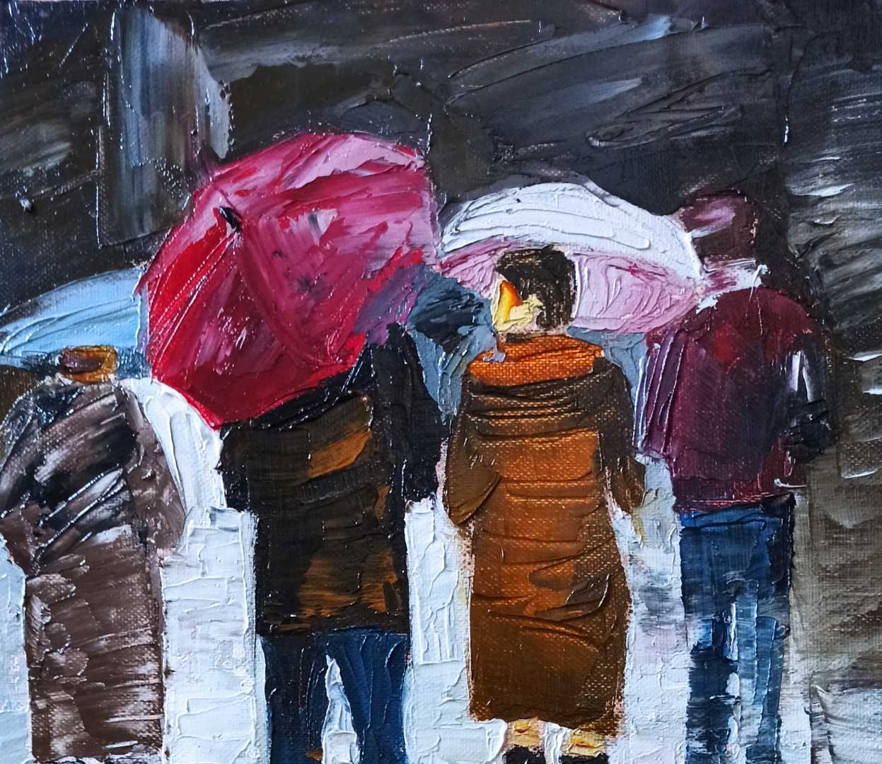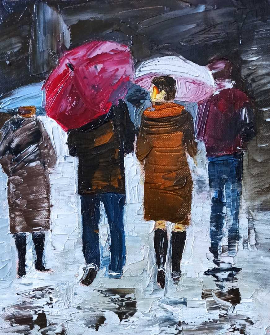 Картина Городской мотив Беседа под дождем написана масляными крсками, мастихином на холсте, в стиле импрессионизм.