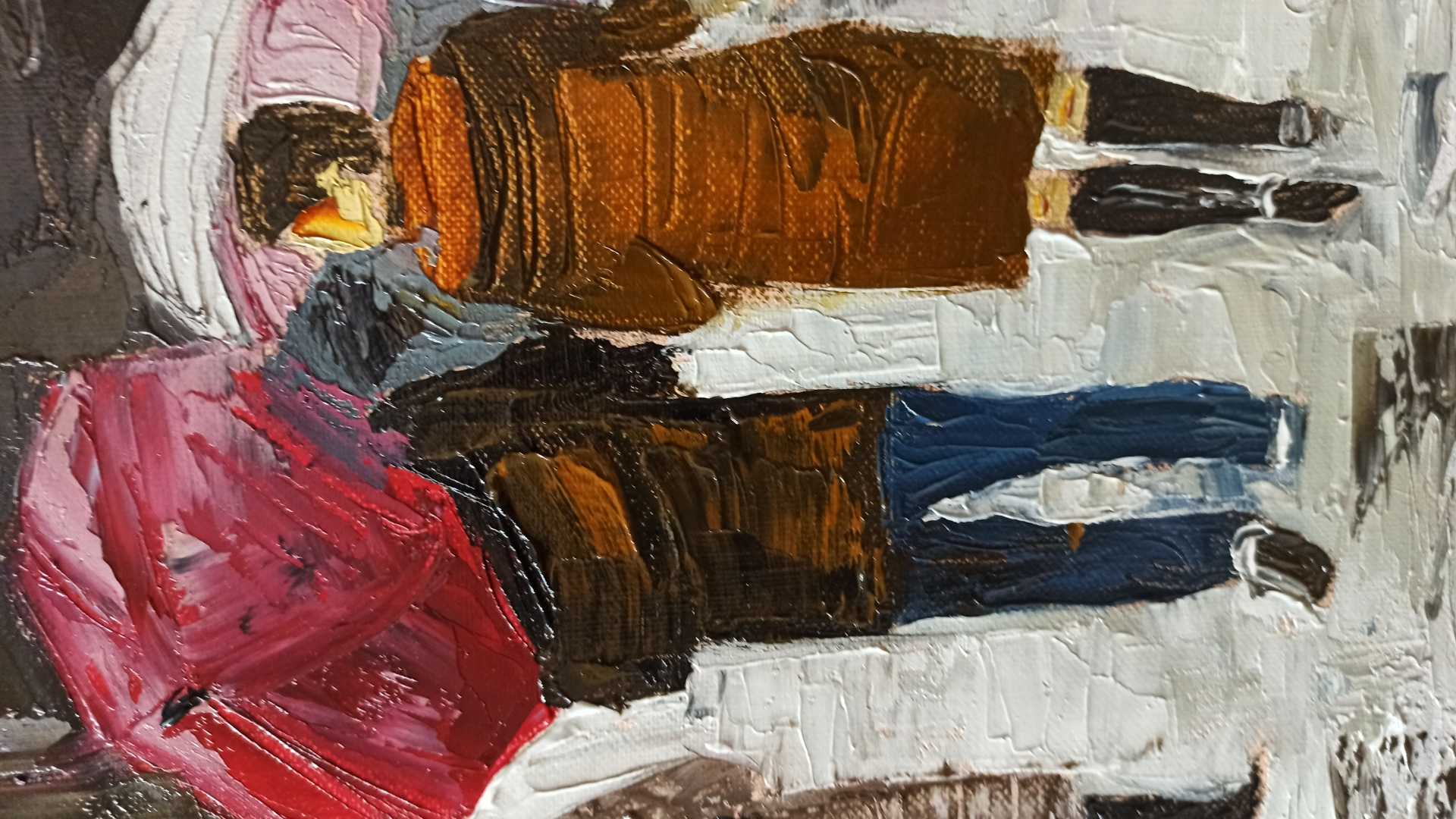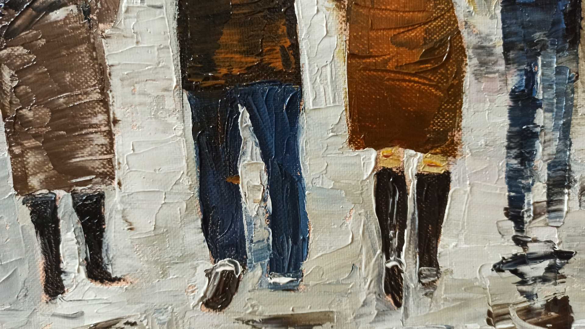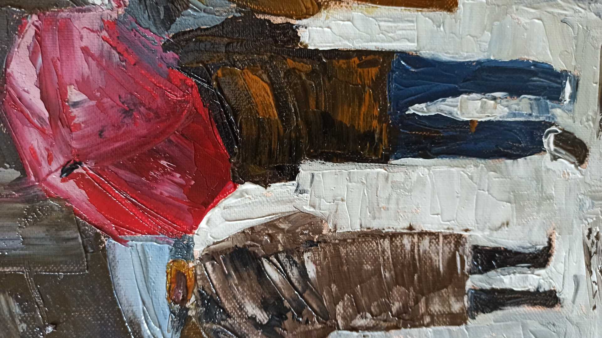 Картина Городской мотив Беседа под дождем написана масляными крсками, мастихином на холсте, в стиле импрессионизм.