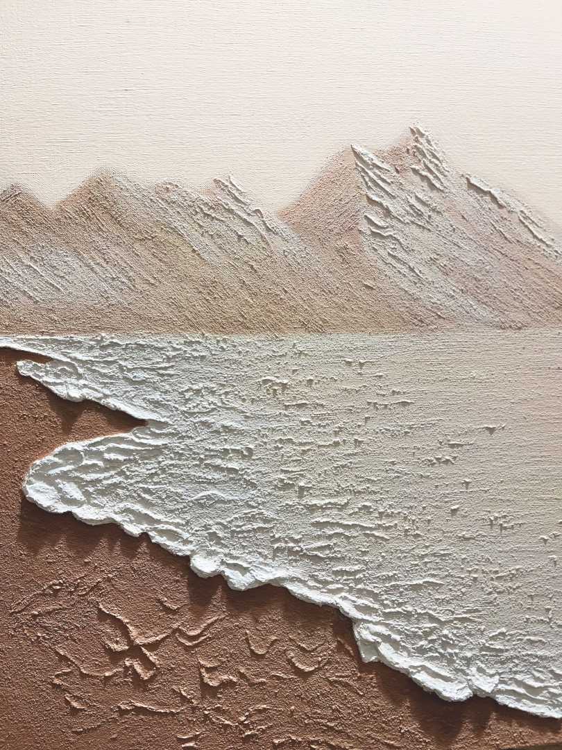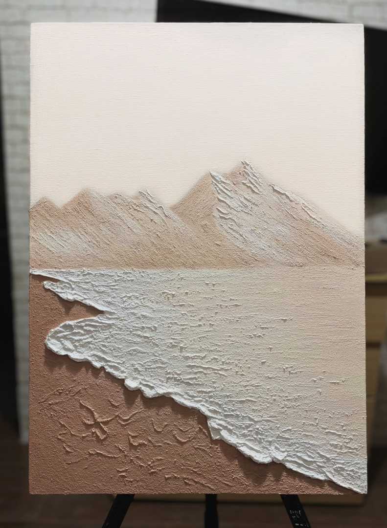 ися волнами, которые создают эффект трёхмерности и ощущение движения. Всё выполнено в пастельных, нежных тонах бежевого, кремового и белого, создающих спокойную и умиротворяющую атмосферу. Картина сочетает текстурирование и рельефные элементы, подчеркивающие природные детали гор и воды