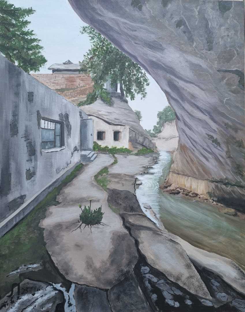Работа выполнена по авторской фотографии, сделанной в районе Бойсун, Узбекистан. Изображён легендарный поселок Омонхона, упомянутый в древних преданиях: по легенде, здесь на живительных источниках Александр Македонский оставил на излечение своих солдат во время похода в Инд