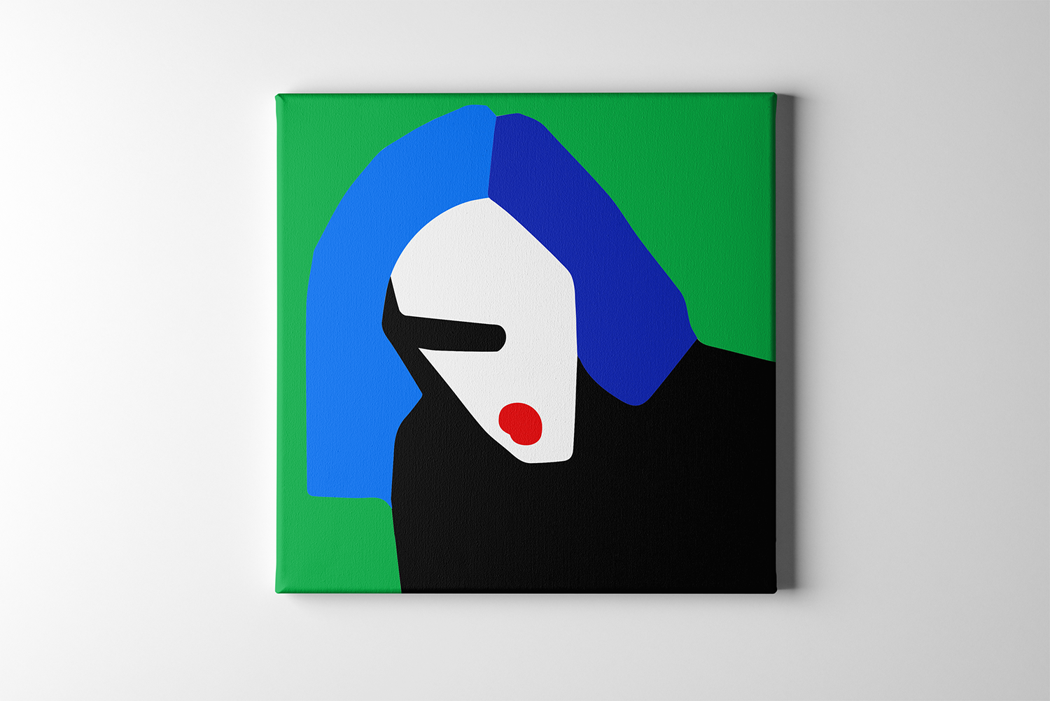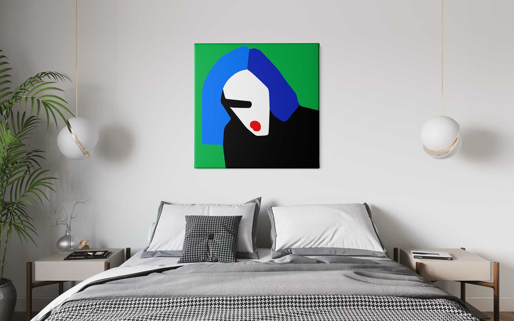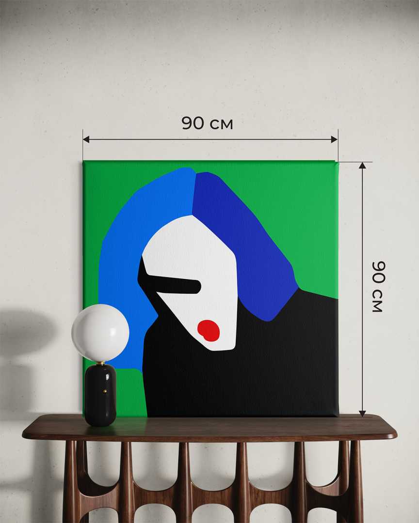 Картина «Грусть» — это фигуративный портрет девушки, выполненный в минималистичной, но выразительной манере. Упрощенные стилизованные черты лица передают состояние задумчивости и легкой печали. Цветовая палитра — зеленый, синий, белый и черный — сбалансированы в общей композиции, яркий красный акцен