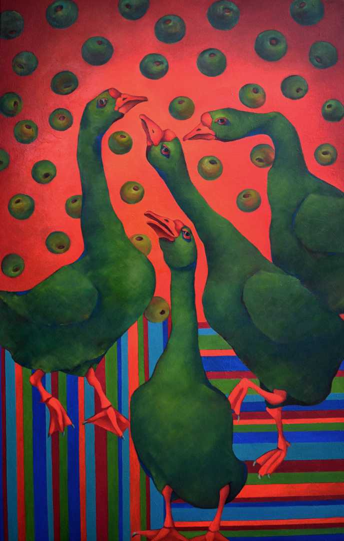 «Гуси в яблоках» — это манифест цвета, иронии и внутренней свободы. Картина написана маслом на холсте в формате 100×70 см и сразу заявляет о себе как о смелом акценте в пространстве. Я сознательно отказалась от реалистичной палитры и создала гусей насыщенного зелёного цвета, потому что для меня зелё