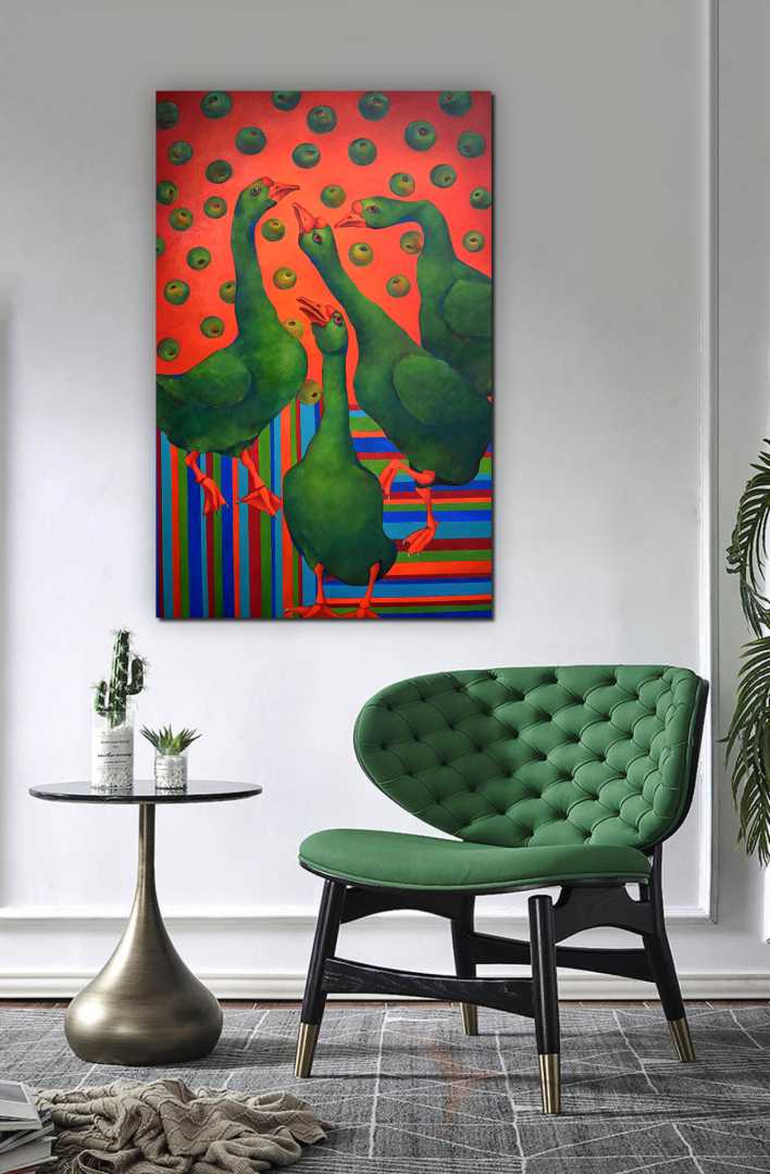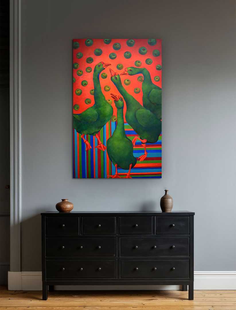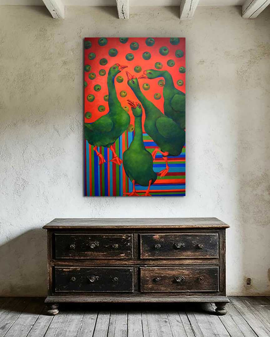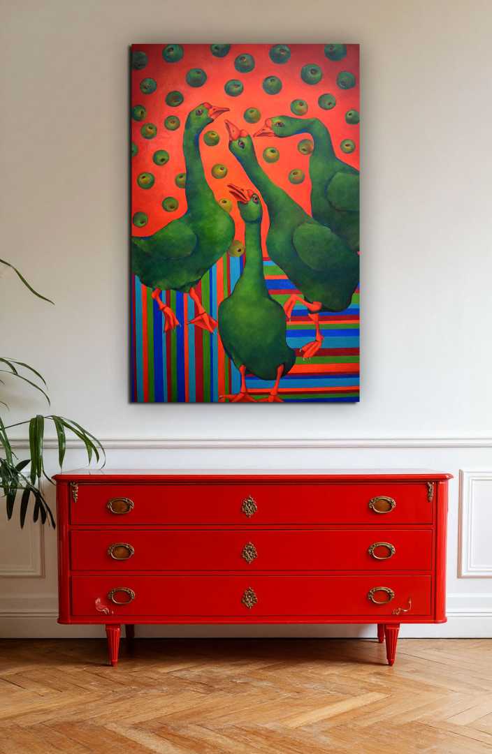 «Гуси в яблоках» идеально подойдёт для интерьера, который ценит индивидуальность: современная квартира, арт-пространство, смелый ресторан или креативный офис. Это картина, которая собирает взгляды и запускает разговоры. Она не просто украшает стену — она формирует атмосферу. И если вы ищете произведение, способное стать центром притяжения и отражением яркого характера владельца, вы его нашли.
