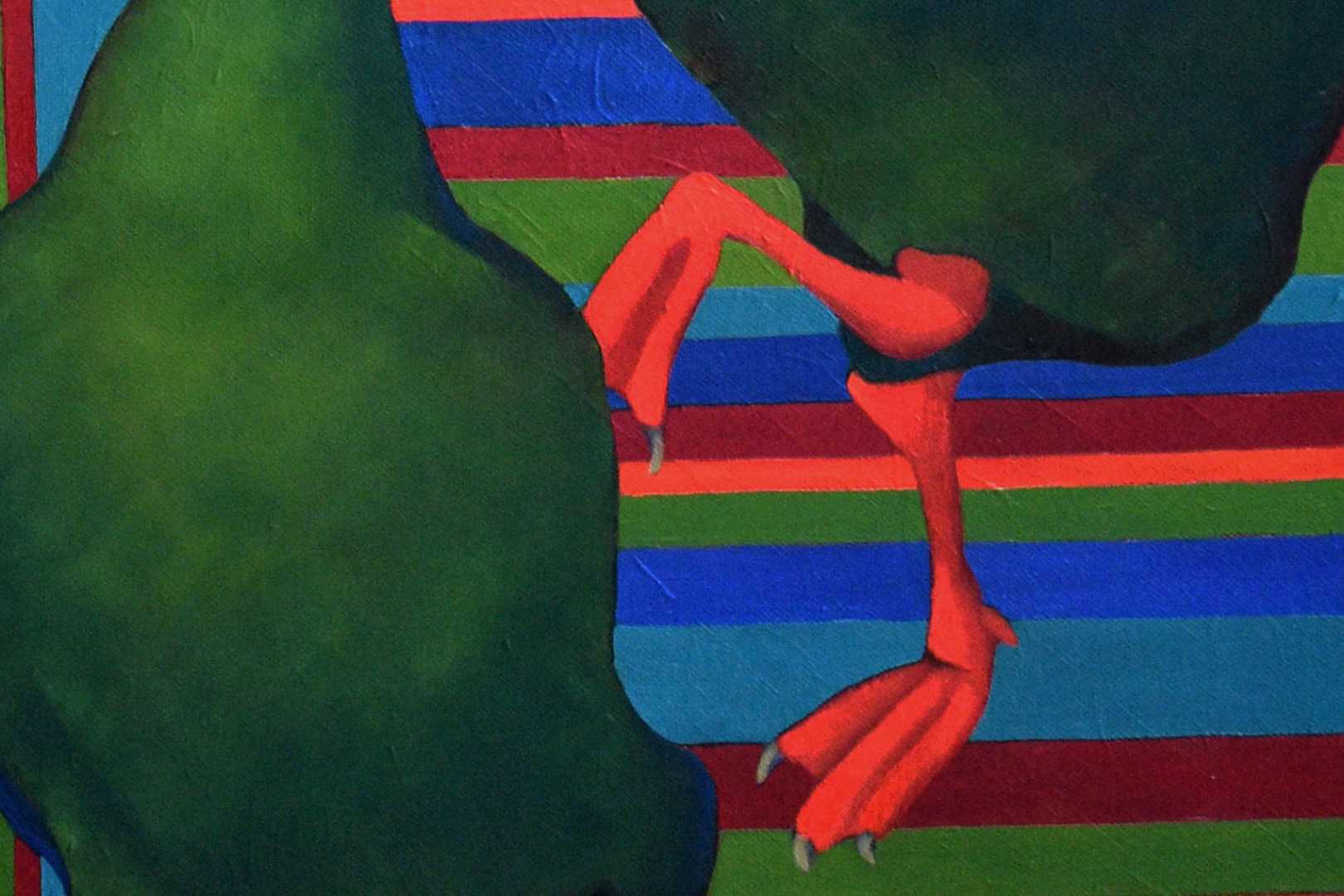 Яркий кораллово-красный фон, усыпанный яблоками, создаёт эффект ритма и повторения, почти гипнотический орнамент. Яблоки здесь — символ изобилия, искушения и игры. Они словно висят в воздухе, превращая сцену в театральную постановку. Контраст зелёных фигур и сочного фона усиливает динамику, а полосатая плоскость внизу добавляет современный графический нерв. Это диалог на стыке поп-арта и наивной экспрессии, где декоративность встречается с характером.