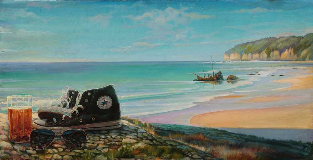 Картина «Идеальный пляж» — современный пейзаж с лёгким ироничным акцентом, передающий ощущение свободы, отдыха и личного пространства. На переднем плане — повседневные детали: кеды, солнцезащитные очки и стакан напитка, которые создают эффект присутствия и намёк на только что начавшееся или уже прож