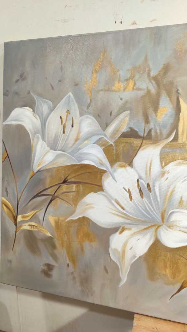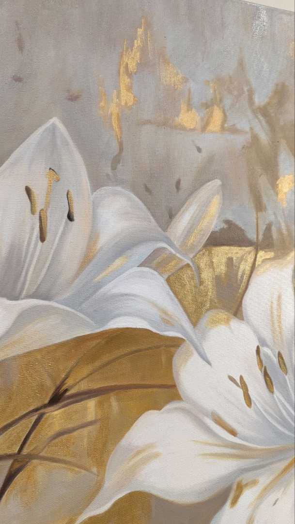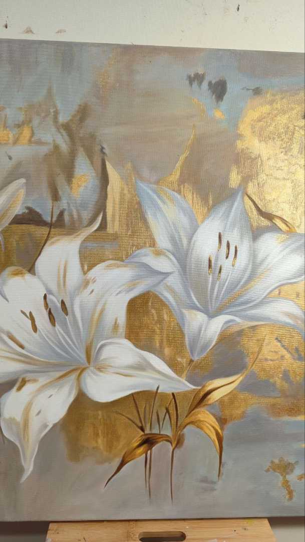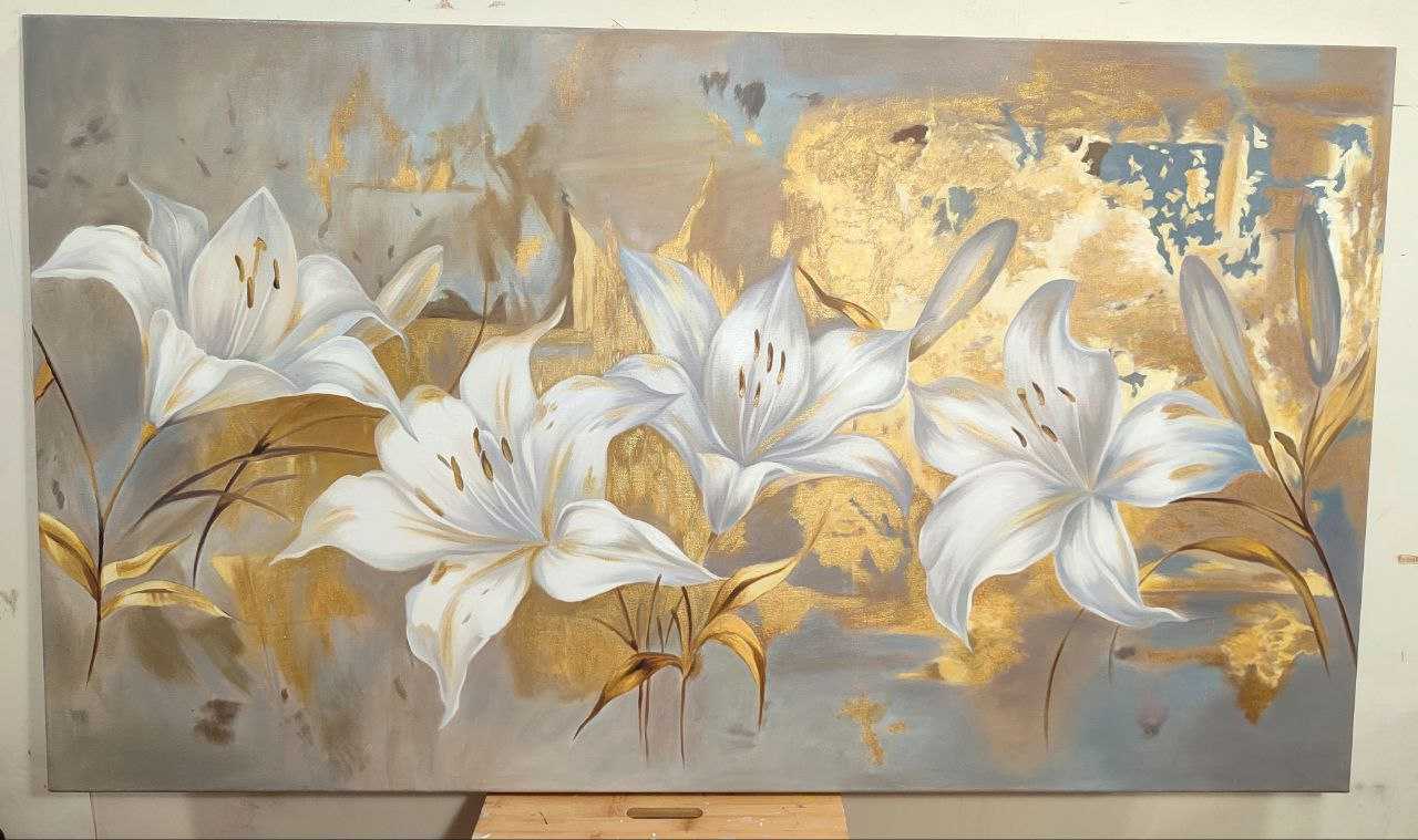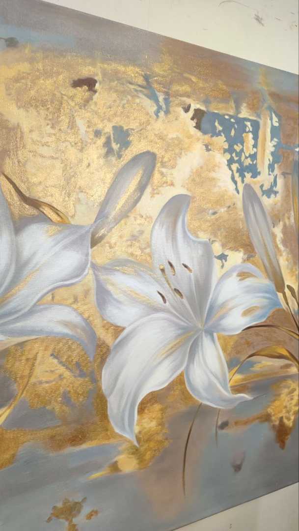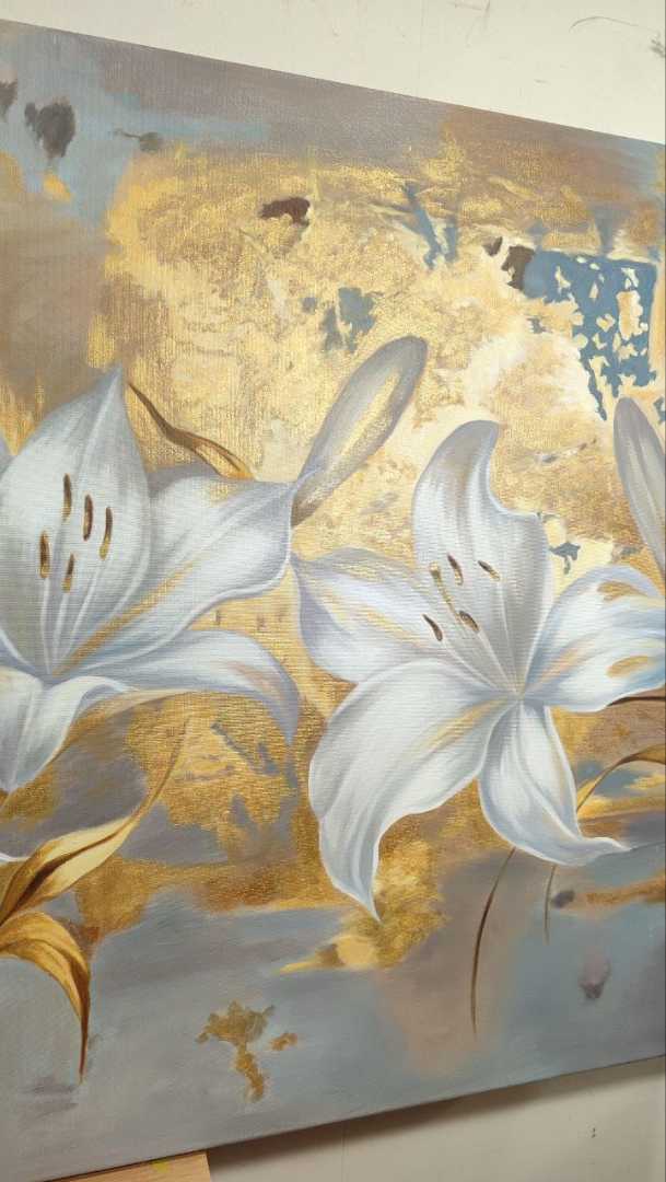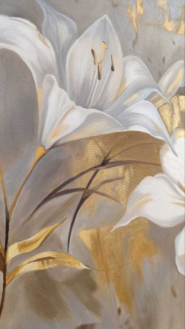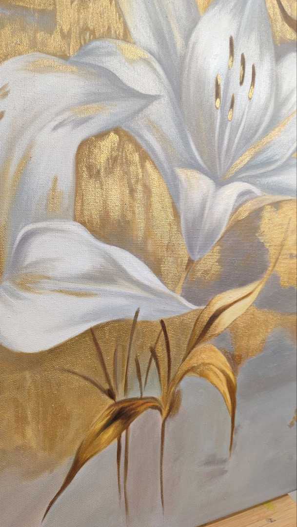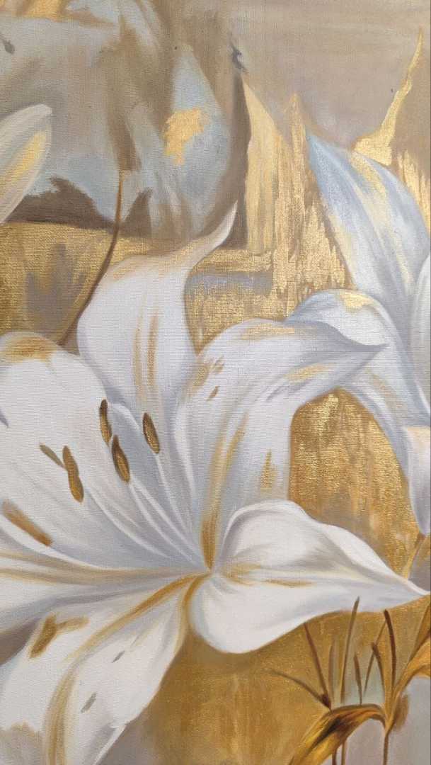 На полотне изображены белые лилии, сверкающие каплями утренней росы и обрамленные золотым светом. Эта картина создает атмосферу свежести и спокойствия, идеально вписываясь в любой интерьер. Она добавит вашему пространству нотку романтики и изыск