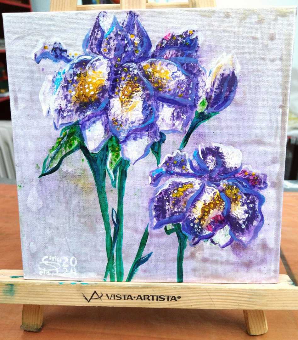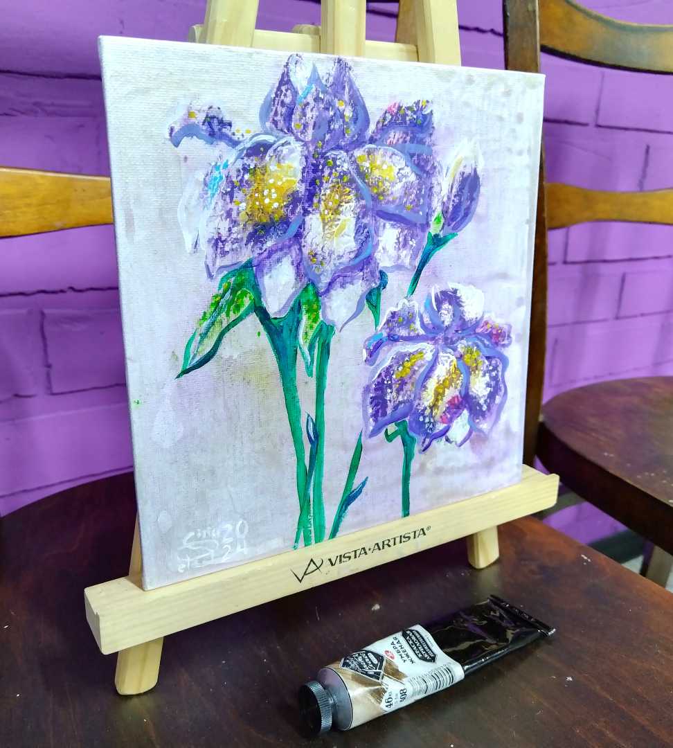Изящные стебли и нежные цветы ириса написанные в свободной импрессионистической манере.