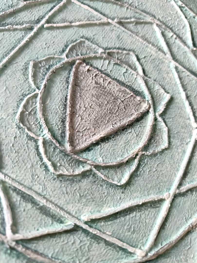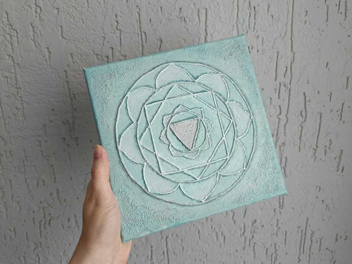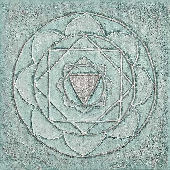 Картина изображает символ Анахаты – сердечной чакры, источника гармонии, любви и сострадания. В центре композиции – треугольник, направленный вниз, окруженный лотосом с двенадцатью лепестками и геометрическими фигурами, подчеркивающими баланс между духовным и материальным мирами. Мягкие оттенки зеле