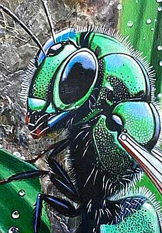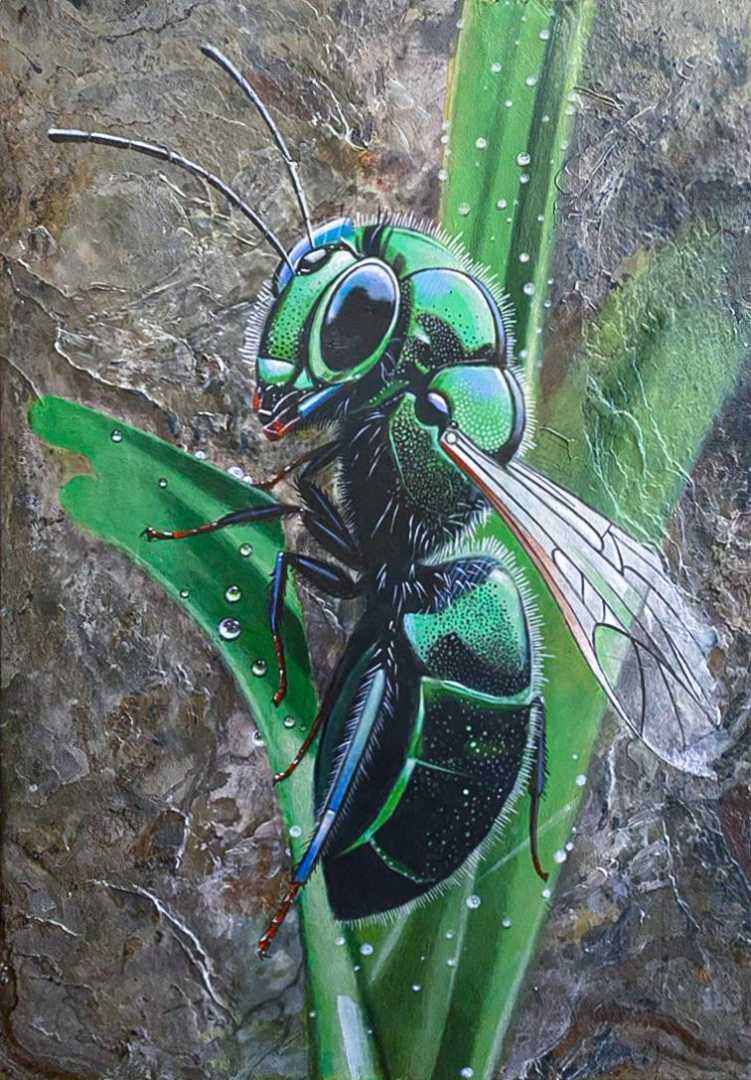 Картина выполнена в технике гиперреализма на шпоне натурального камня. Художник с ювелирной точностью передал блеск изумрудного насекомого, игру света на каплях росы и фактуру поверхности. Работа поражает вниманием к деталям и эффектом трёхмерности — кажется, что муха вот-вот оживёт.