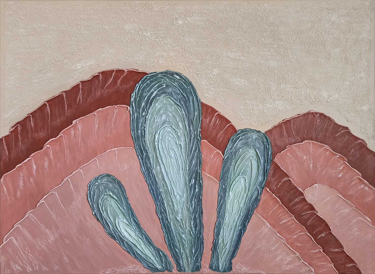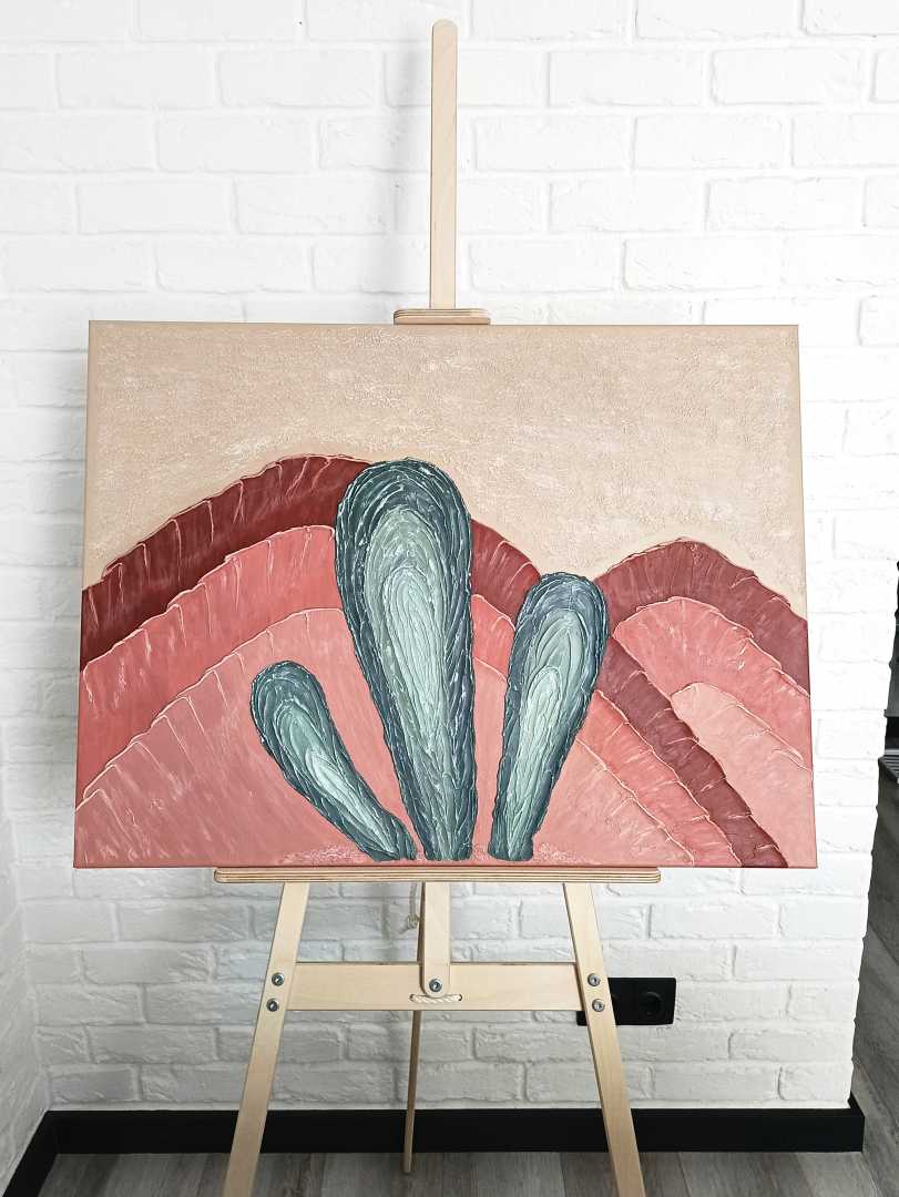 Абстрактная картина с изображением Мексиканского пейзажа с кактусами на фоне холмов на закате.