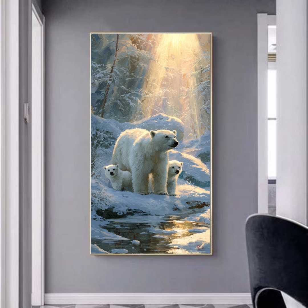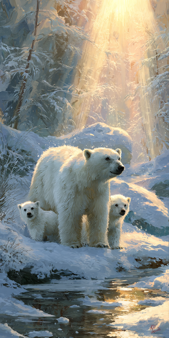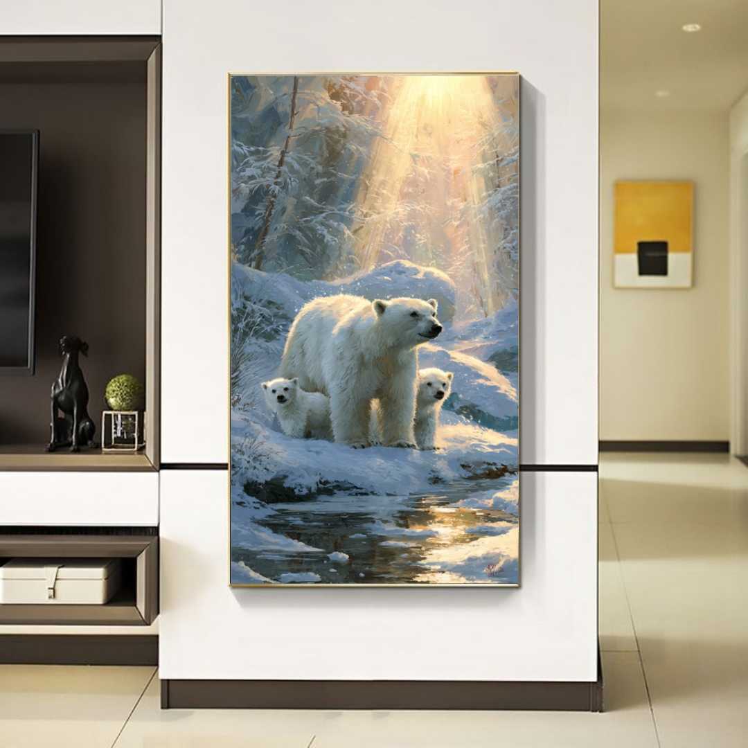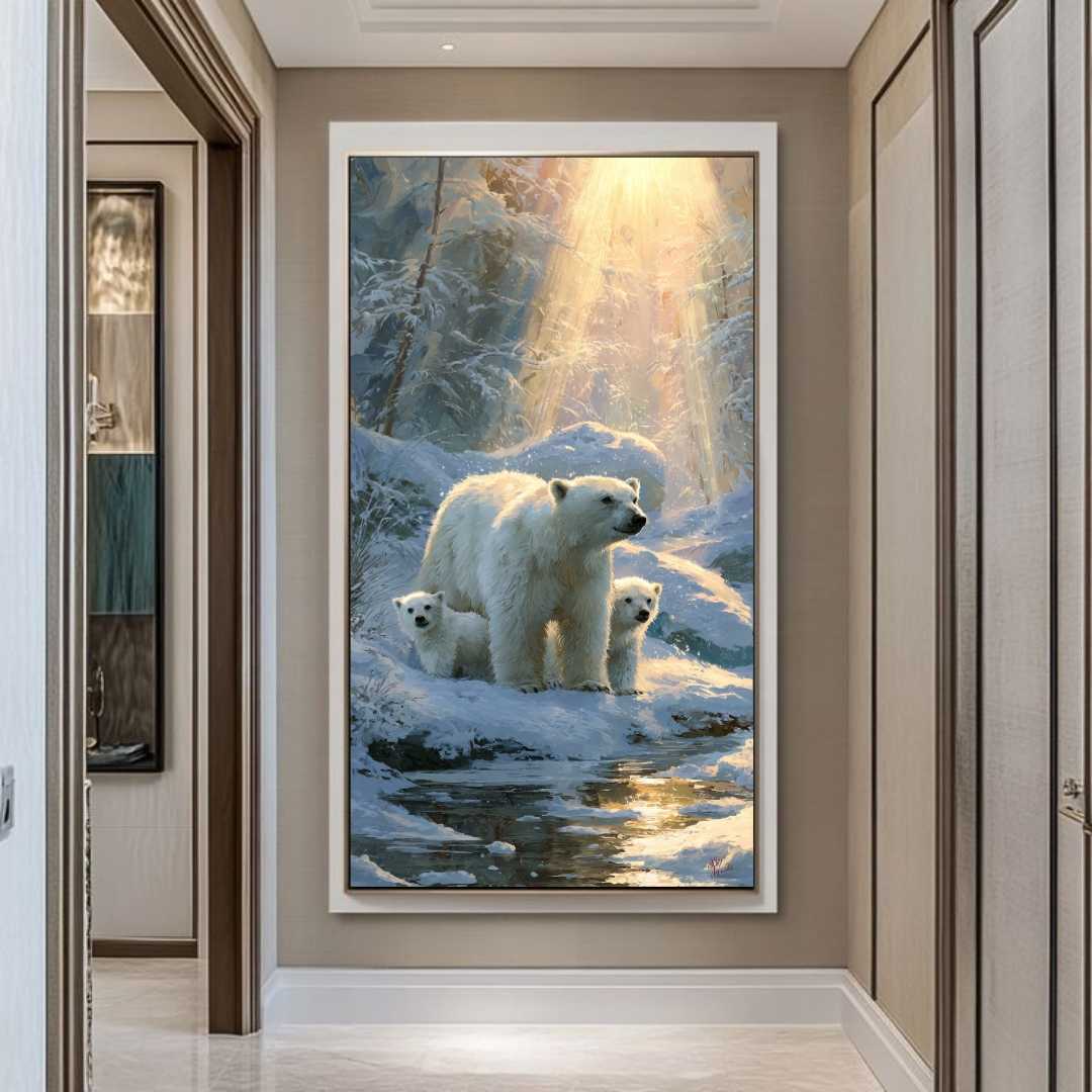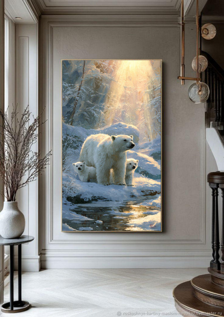 ой картиной маслом. На полотне запечатлена трогательная сцена — белая медведица с двумя милыми детенышами, исследующими заснеженный арктический пейзаж, залитый мягким солнечным светом. В каждом мазке отражается чистота и величие северных просторов, а природа кажется одновременно суровой и умиротворяющей.