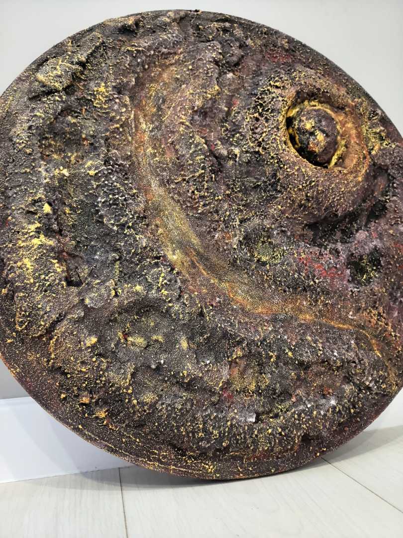 Перед вами круглое интерьерное панно, выполненное в технике текстурной живописи. Работа отличается выраженной рельефностью и насыщенной цветовой палитрой, создающей ощущение глубины и движения.