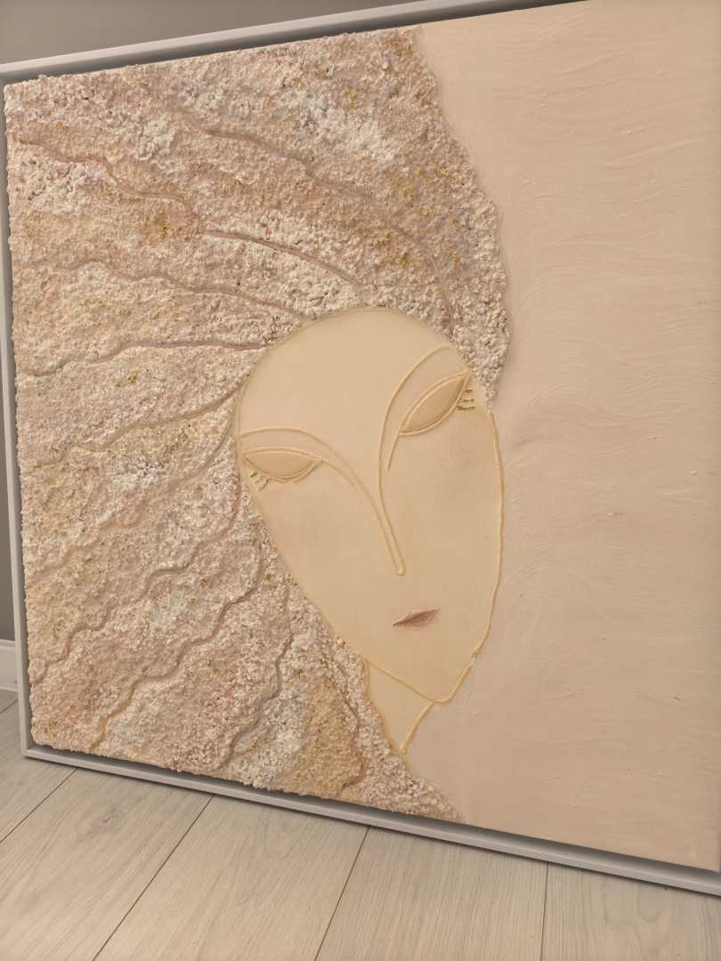 Перед вами авторская интерьерная картина в стиле абстрактного портрета. Композиция сочетает в себе элементы минимализма и текстурной живописи, создавая гармоничный баланс между простотой формы и глубиной фактуры.