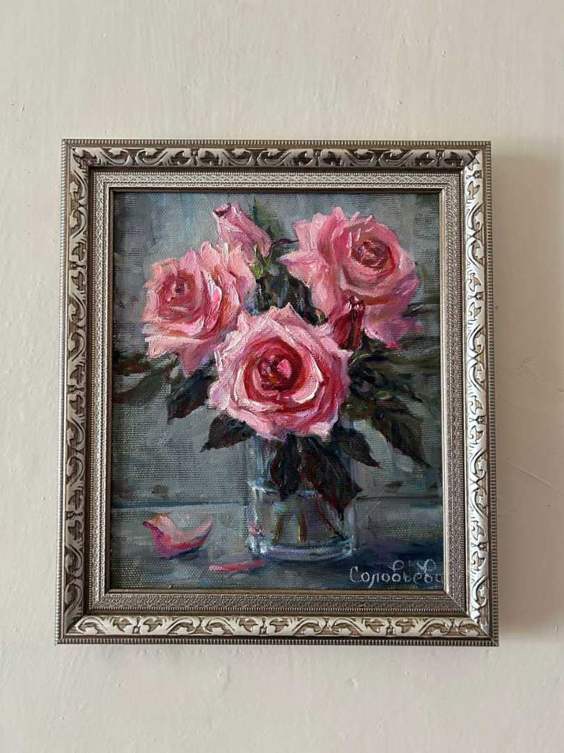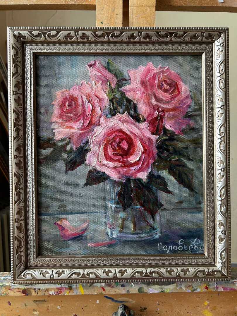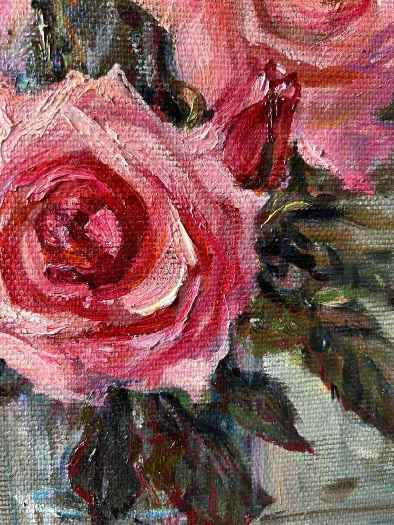 Нежный и утончённый натюрморт с пышными розами в стеклянной вазе. Бархатистые лепестки переливаются оттенками розового — от мягкой пудры до насыщенного кармина, создавая ощущение живого дыхания цветов. Лёгкие мазки подчёркивают фактуру масл