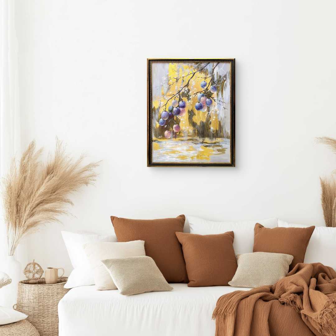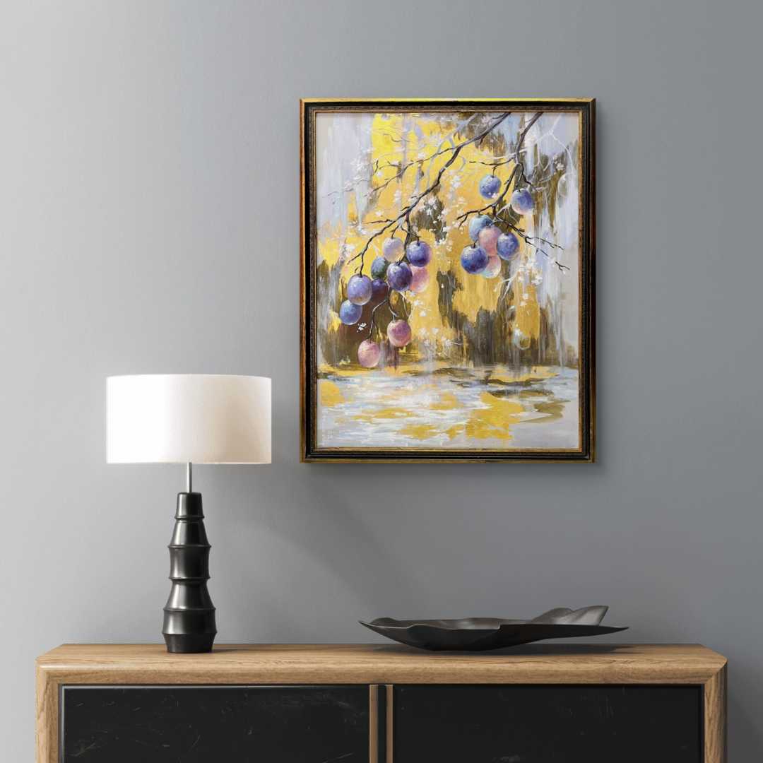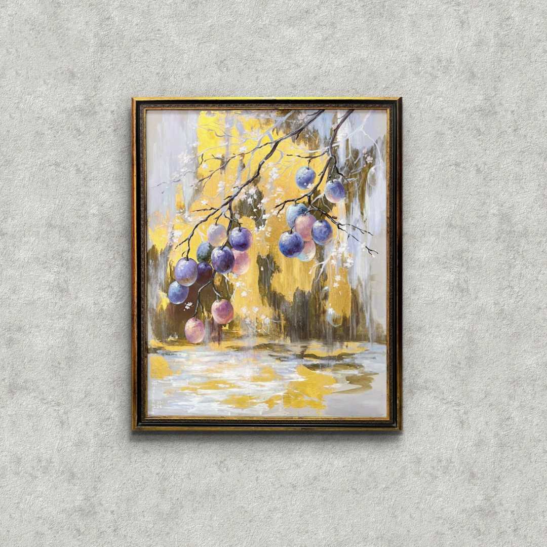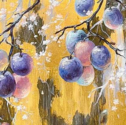 Лиловый дождь - тонкий, почти медитативный сюжет, где изящные линии ветвей сочетаются с почти прозрачными от сладости гроздьями слив. Это песня изобилия и спокойного отдыха в кругу самых близких и родных людей, где всегда тепло и уютно.