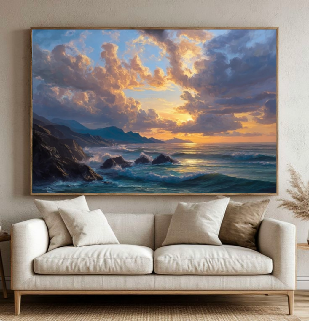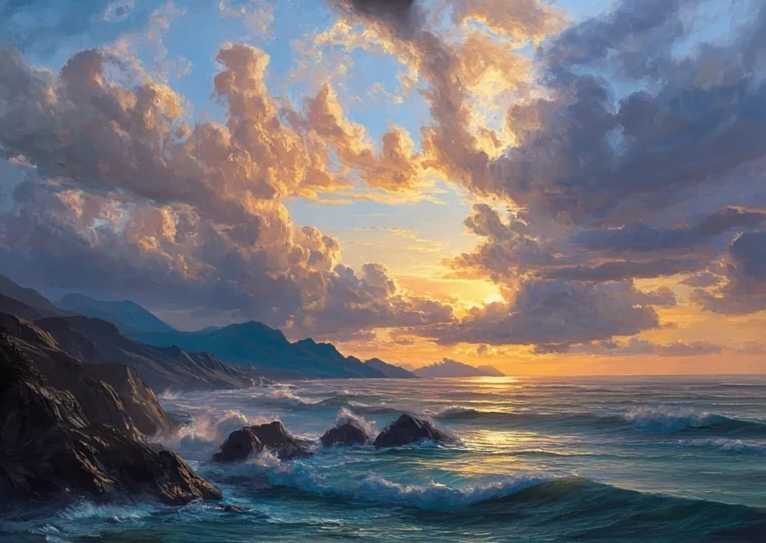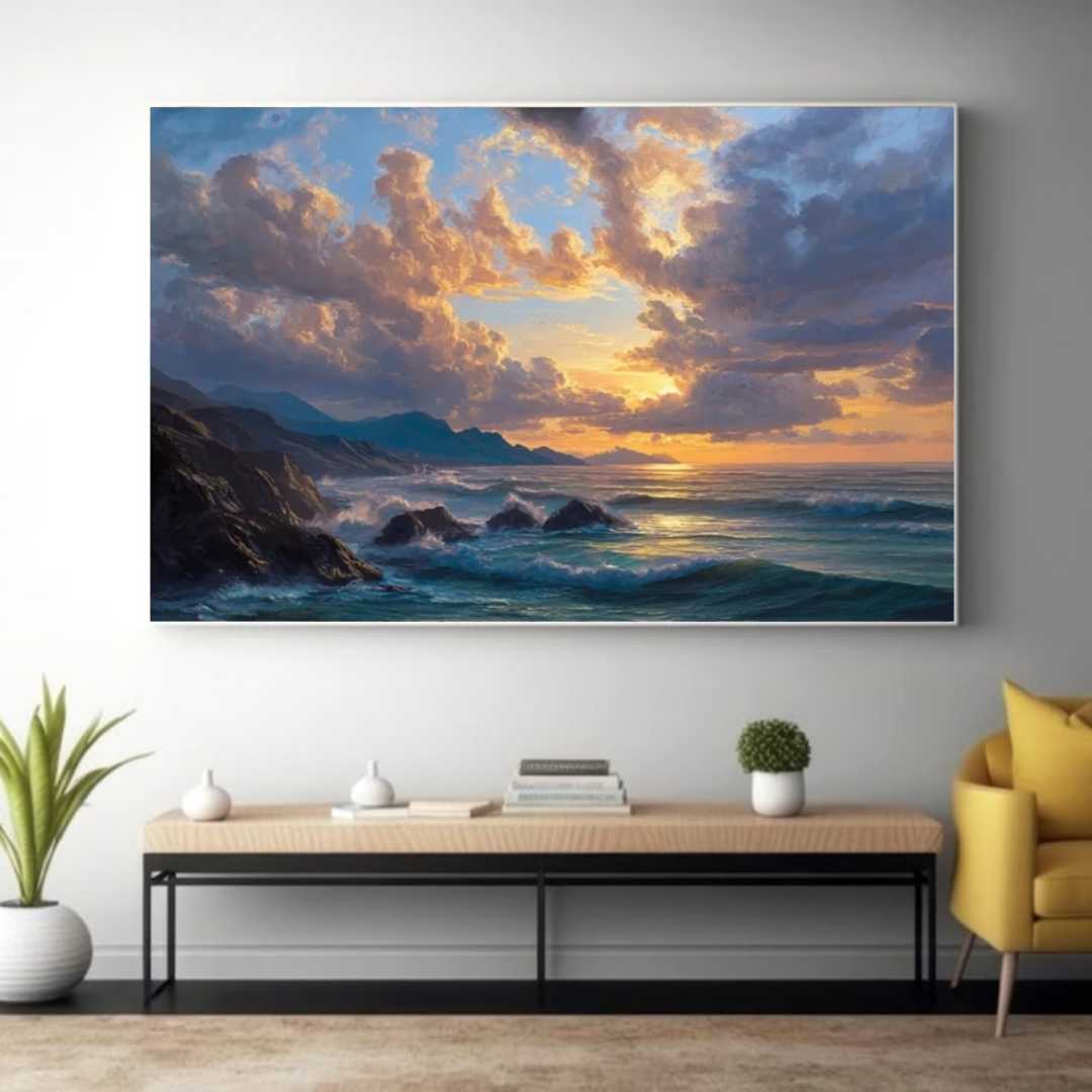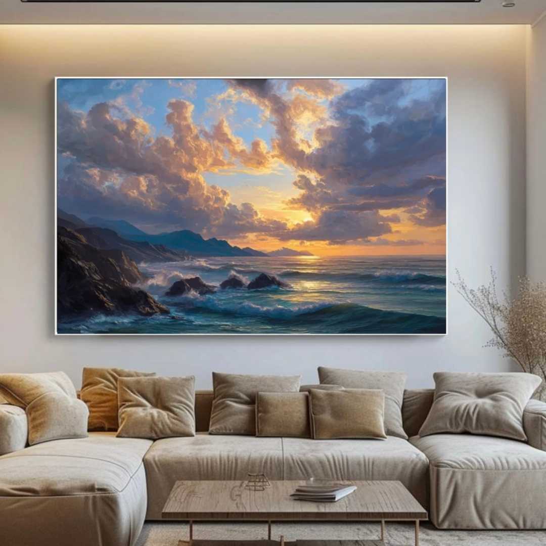 яное полотно переносит вас в мир спокойствия и красоты — живописный берег, устланный мягкими волнами и горными склонами, окутанными волшебным светом заката. Теплые оттенки неба сливаются с морской гладью, создавая атмосферу уюта, мечтаний и умиротворения. Идеальное произведение для тех, кто ценит природную гармонию и волшебство вечера у моря.