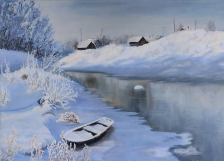 Картина маслом на холсте пейзаж зимний снежный Морозный день вертикальная для гостиной