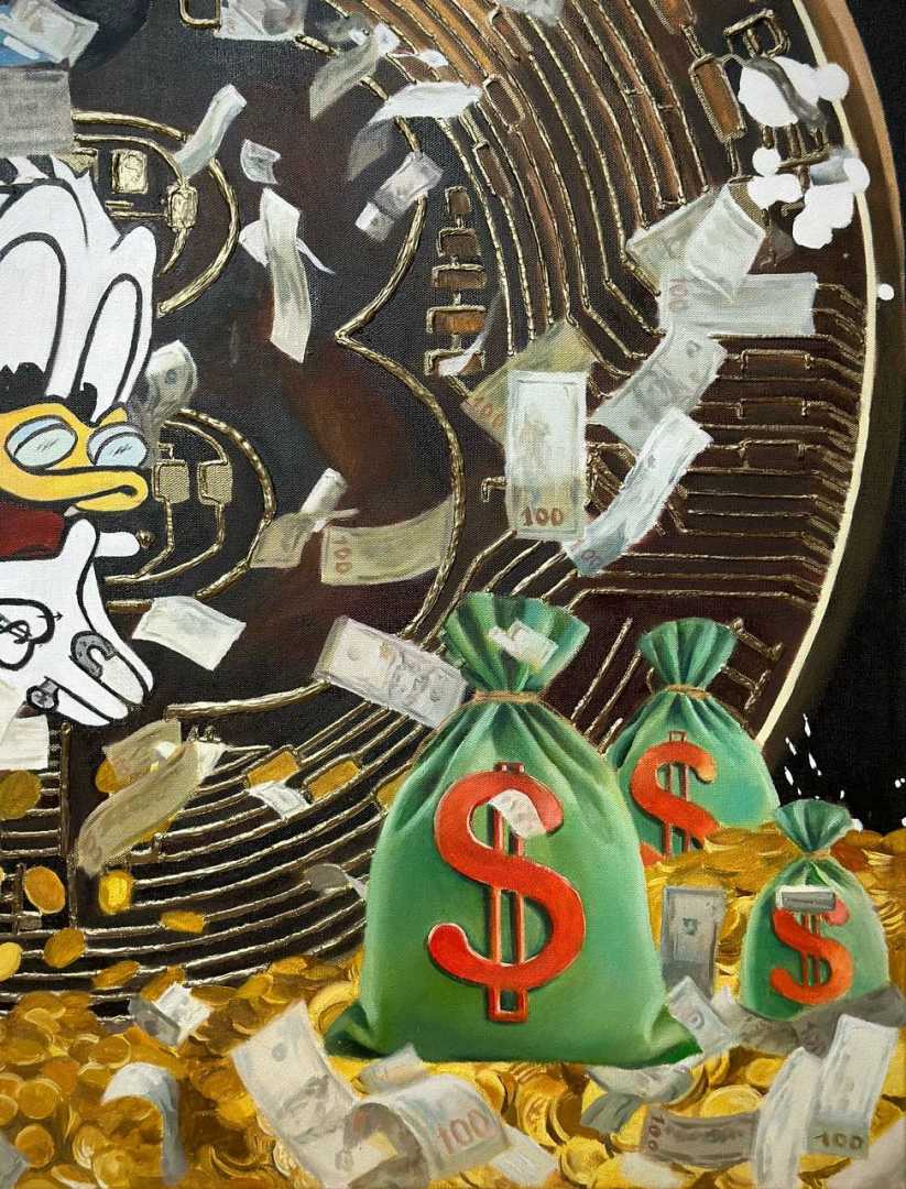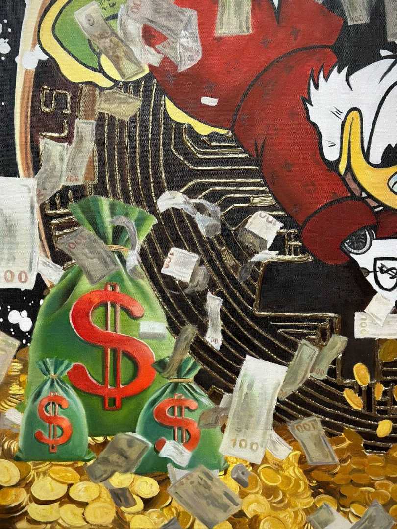 Картина, выполненная в современном стиле, изображает Скруджа, энергично прыгающего в море золотых монет. Рядом лежат большие мешки с золотом и разбросаны денежные банкноты, создавая атмосферу изобилия и финансового успеха. Яркие