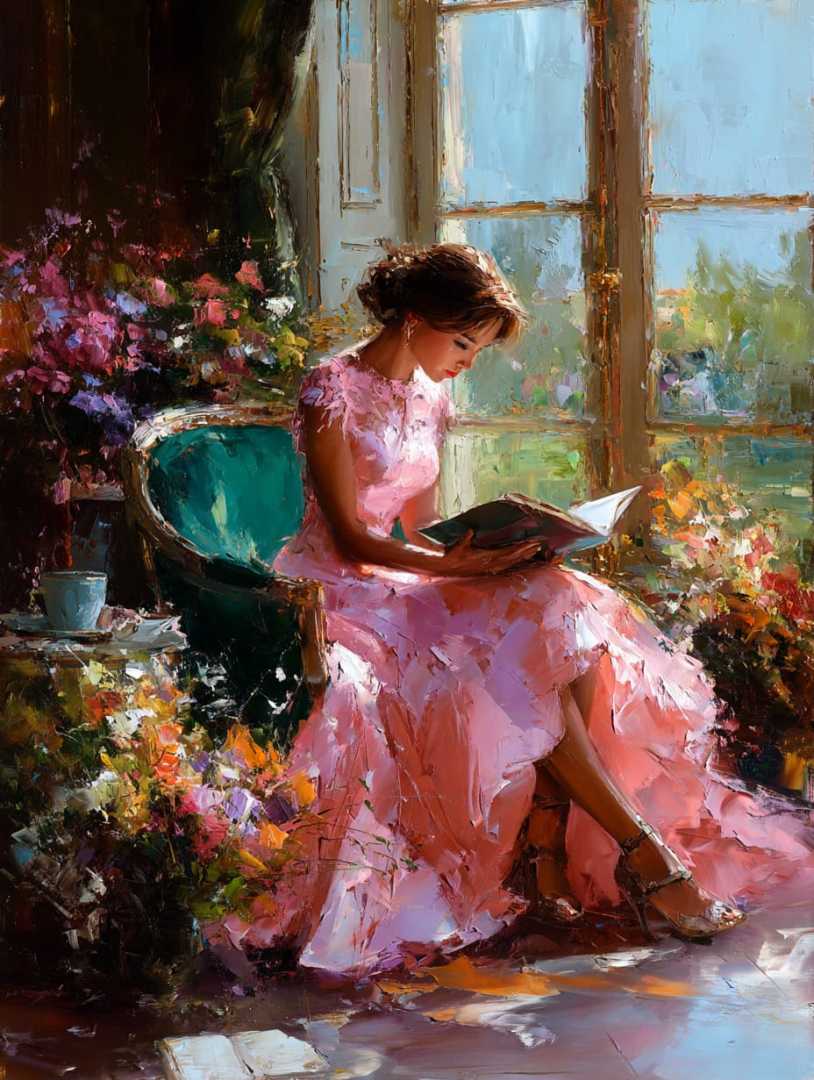 ЭКСКЛЮЗИВНАЯ картина маслом: «Женщина у окна с книгой» — это больше, чем просто изображение. Это ода гармонии, уюта и внутренней красоты.