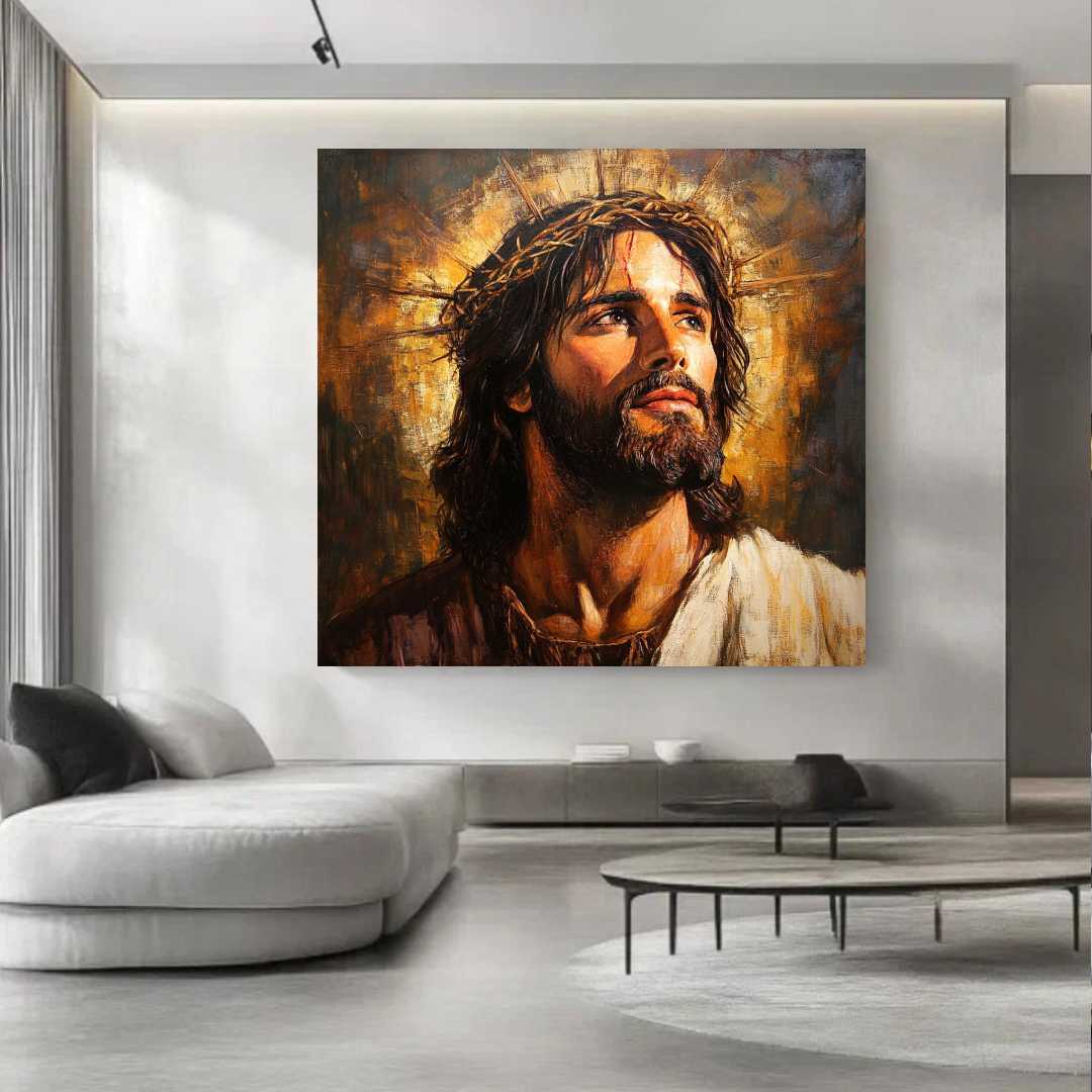 Восхититесь невероятной детализацией и эмоциональной глубиной этого шедевра, написанного маслом. В центре полотна - лик Иисуса, исполненный л