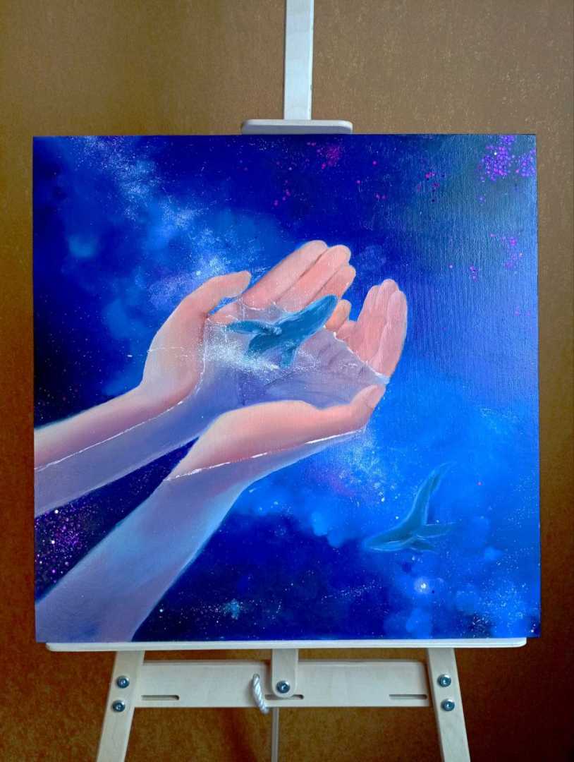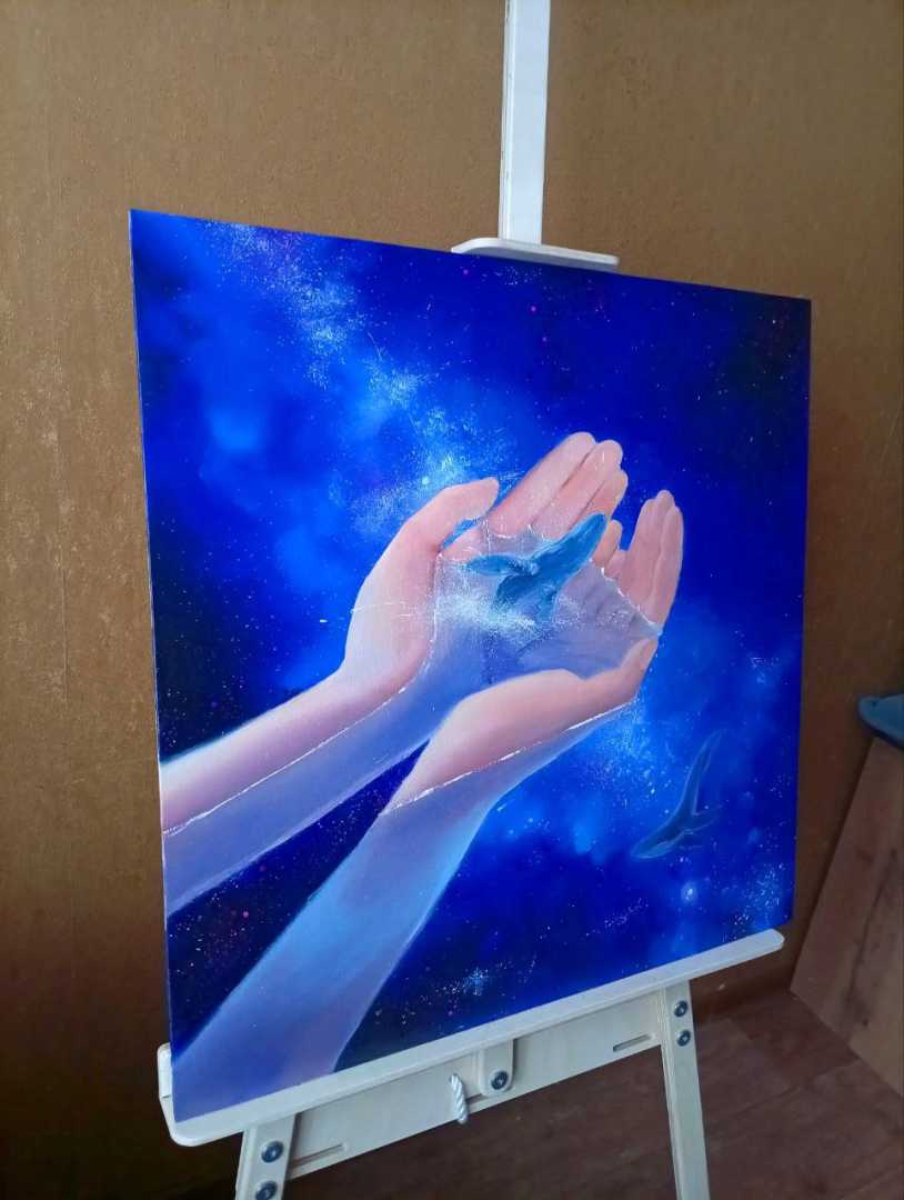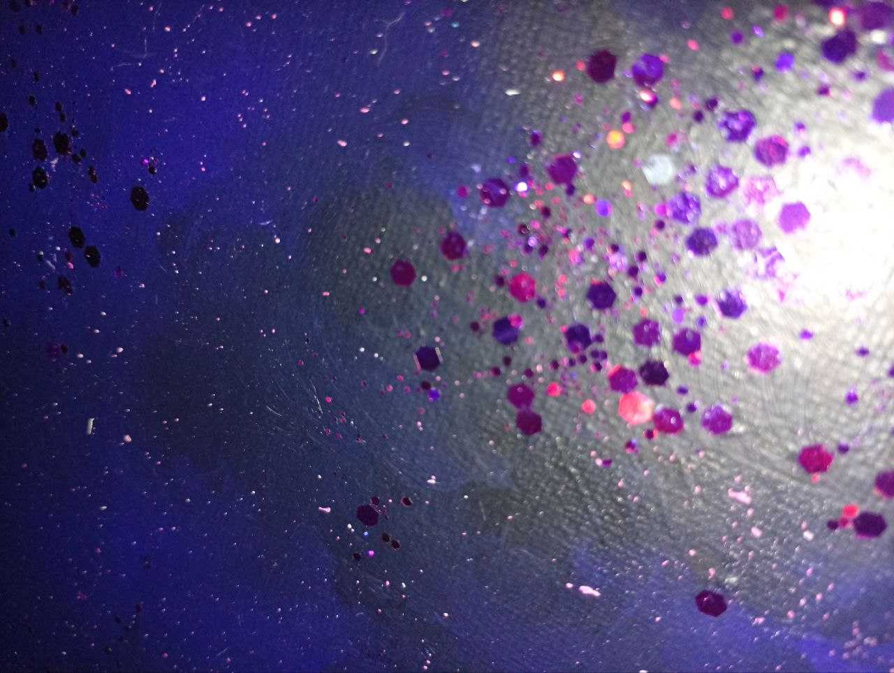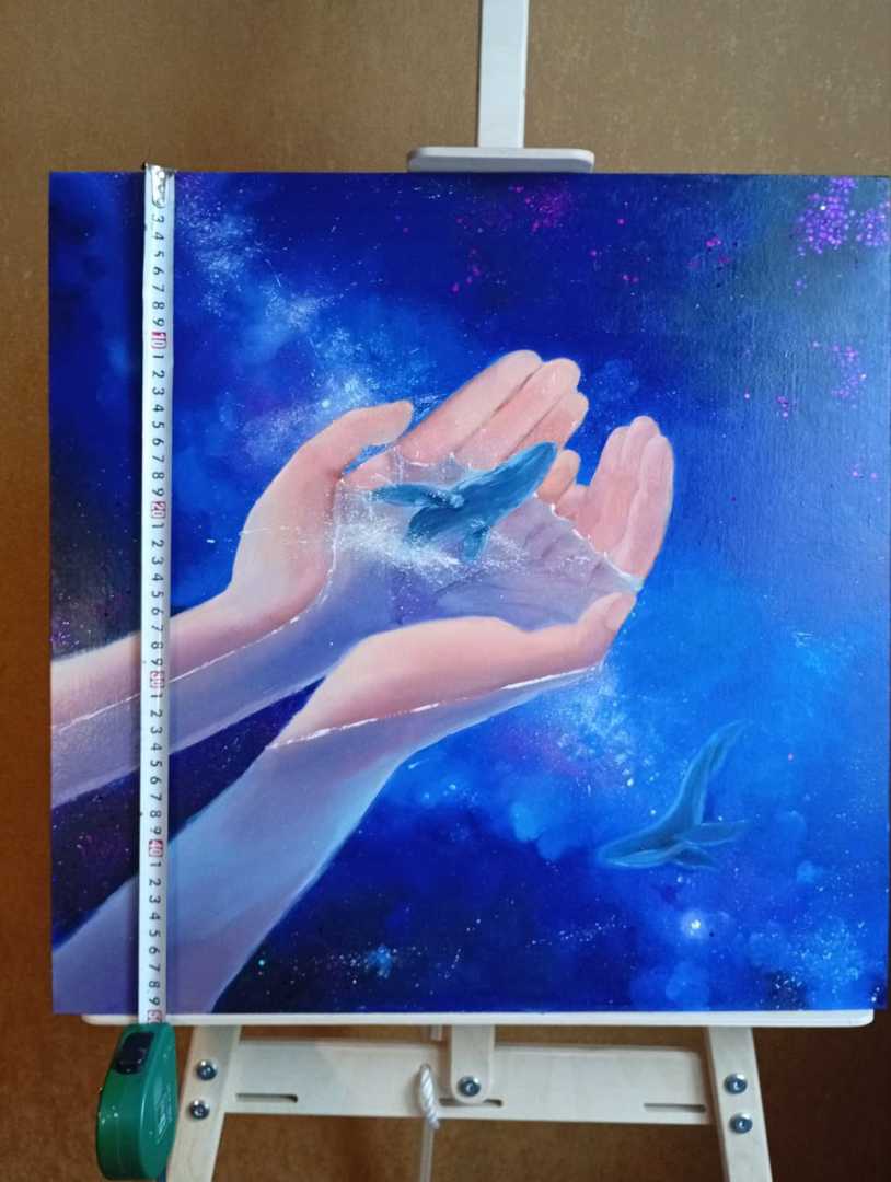 олста на картоне 50х50 см. Изначально холст был хорошо подготовлен к слою красок и качественно прогрунтован. Блестки, что есть в углах картины плотно держатся в слое краски, создавая иллюзию мерцания звезд. Картина не покрыта лаком. Будет отправлена в плотном картоне и зафиксирована слоем скотча.