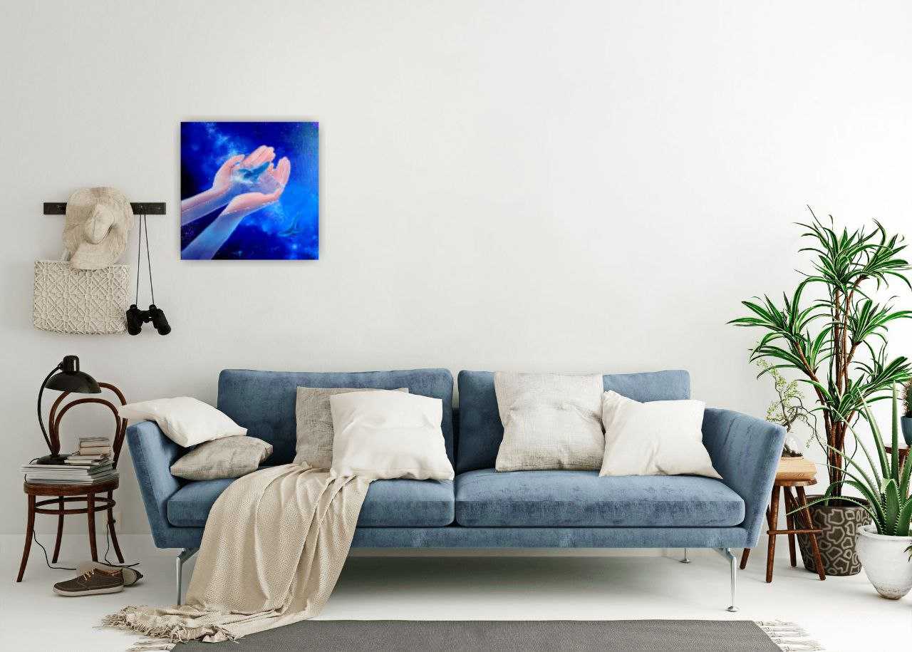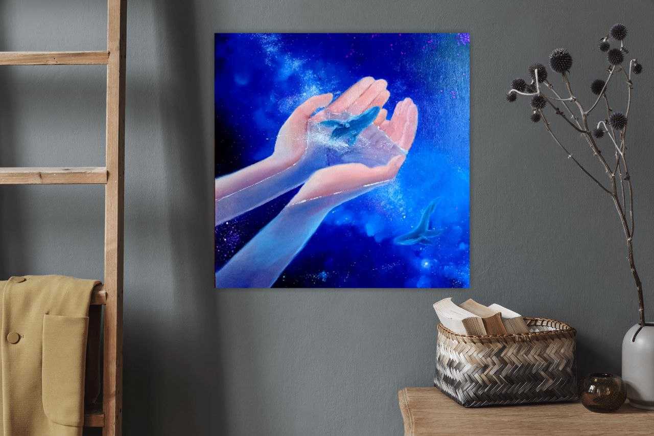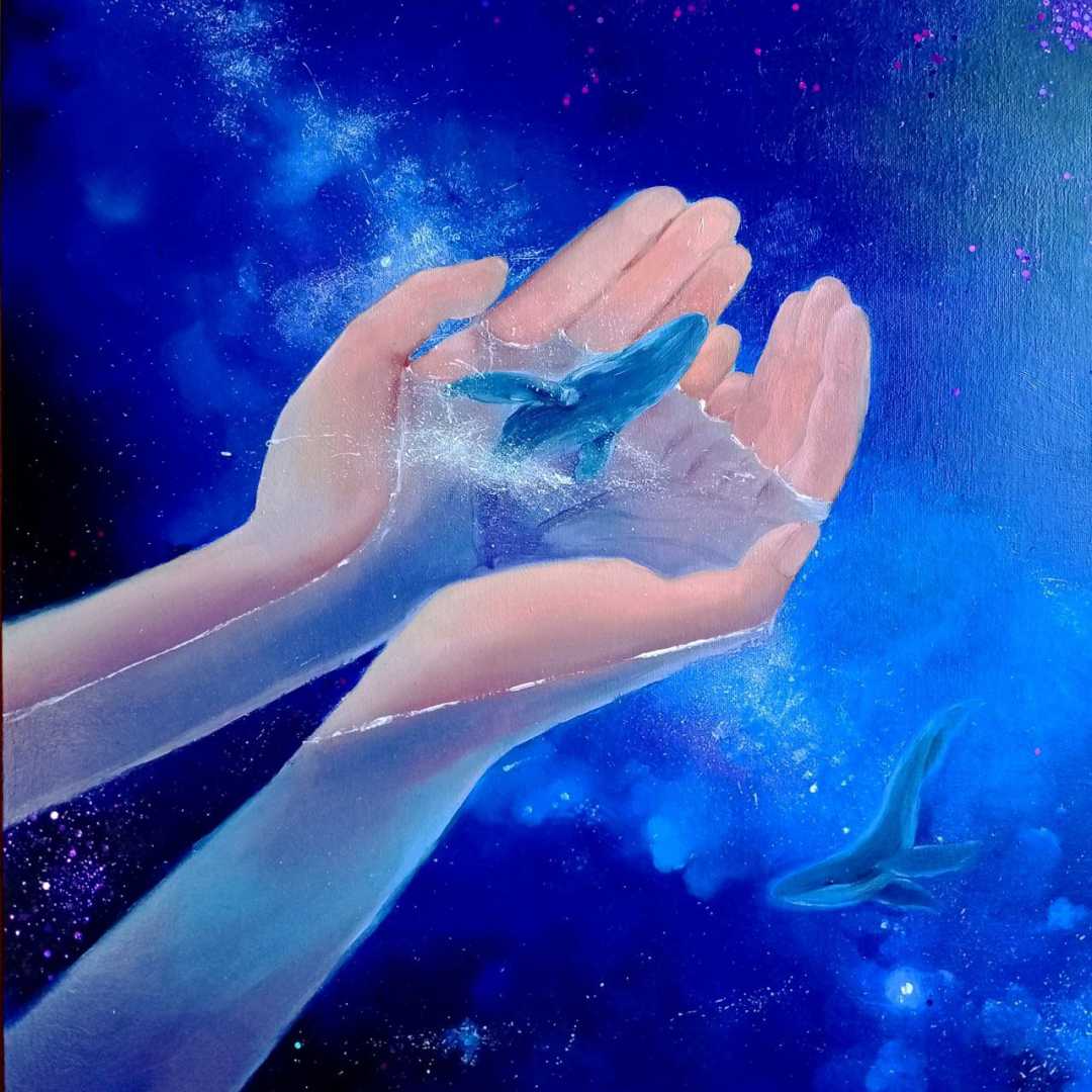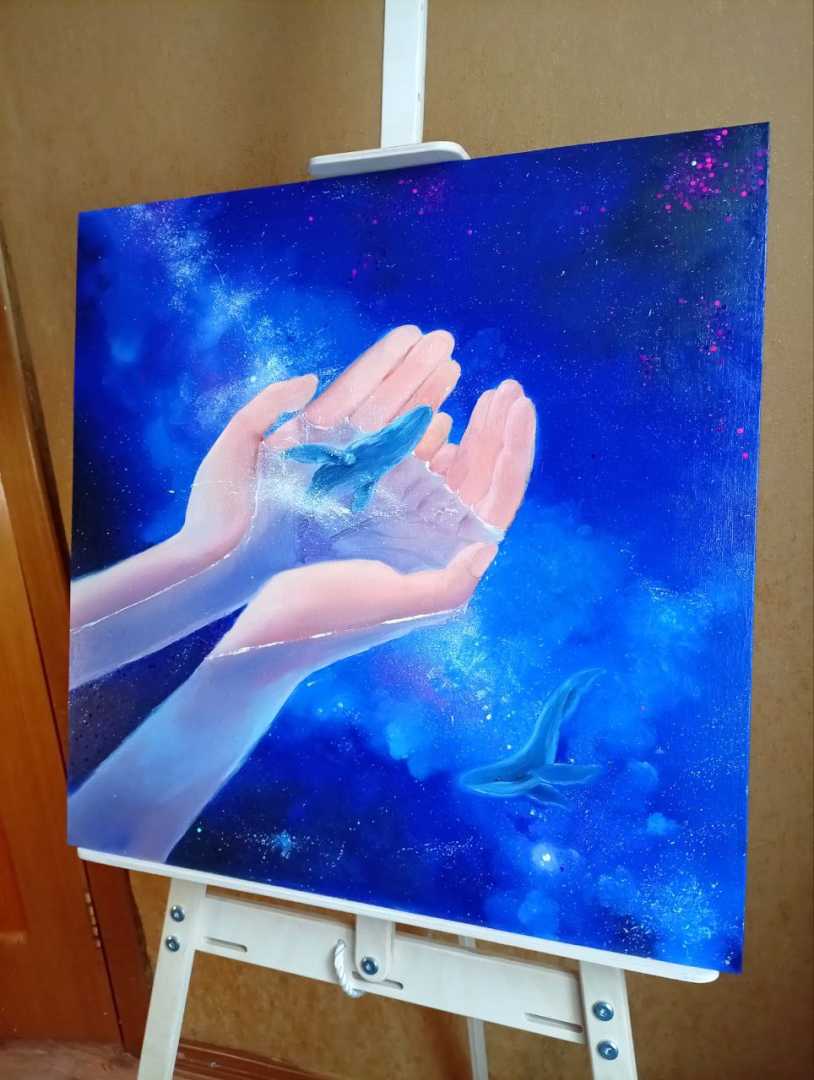 Картина для тех, кто ищет вдохновения и полета фантазии. Глядя на эту картину появляется ощущение сопричастности со звездами и космосом, а большие киты олицетворяют возможности человека, воля и желание которого, способны на многое. Картина дарит ощущение вдохновения и открытых возможностей. Размер х