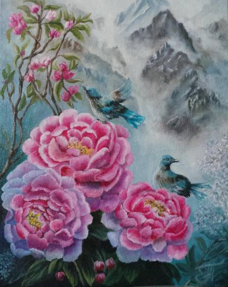 На фоне шелковистого белого холста расцветают тонкие ветви китайской сливы, покрытые деликатными розовыми и белыми цветами. Веточки изгибаются и плетутся, создавая ощущение гармонии и баланса. Птицы, воплощенные в традиционном китайском стиле, витают в воздухе среди цветов. Обе птицы пленяют внимани