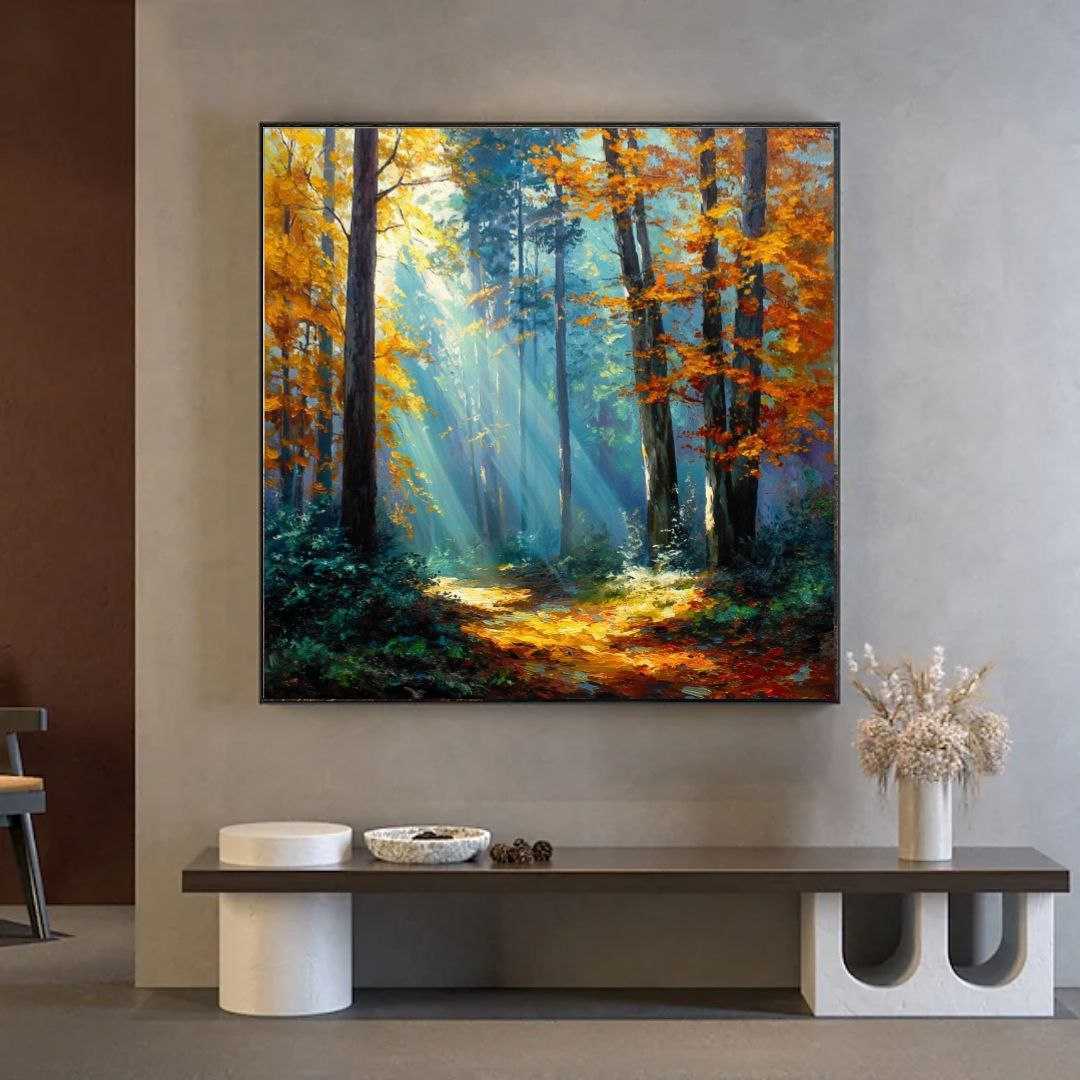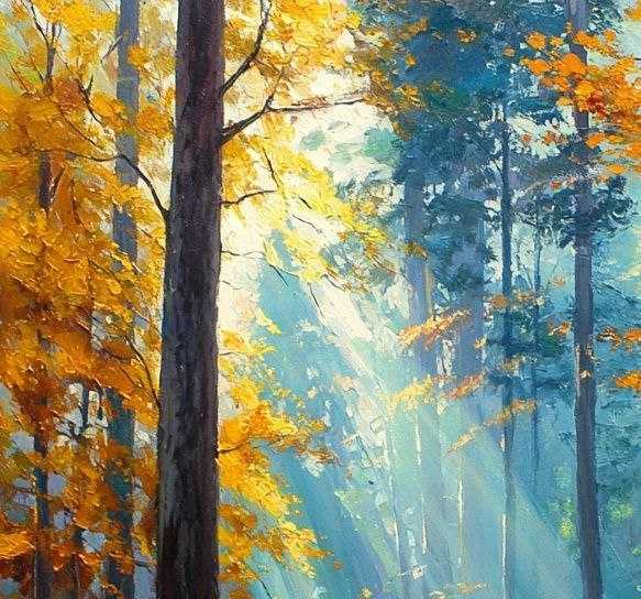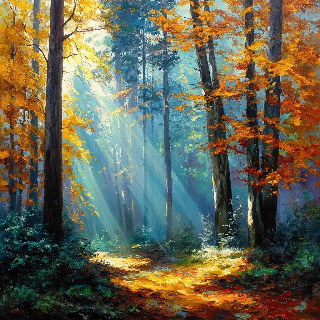 Эта картина передаёт магию осеннего леса, где мягкие солнечные лучи пробиваются сквозь густую листву, окрашенную в яркие желто-оранжевые оттенки. Контраст между тёмными стволами деревьев и светлым солнечным пятном создаёт атмосферу покоя и умиротворения.