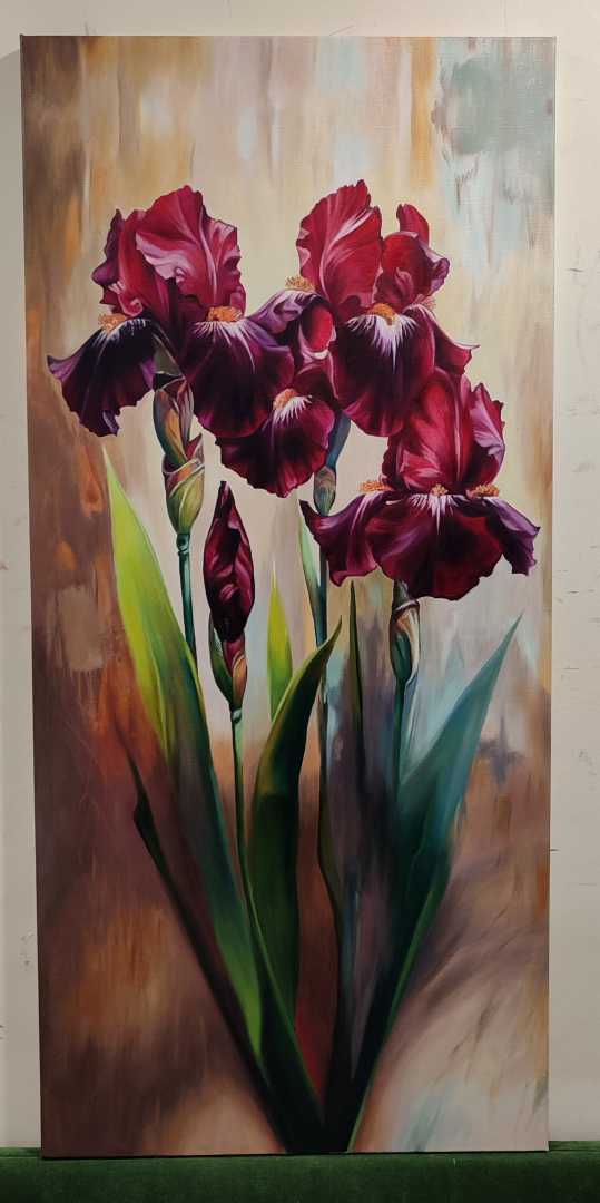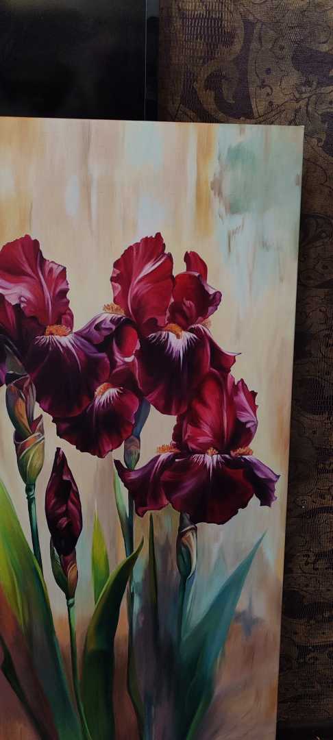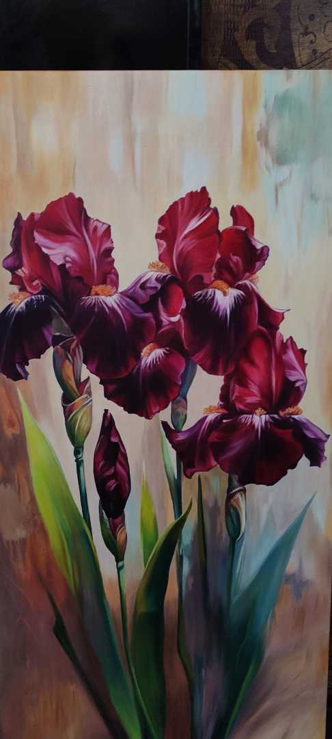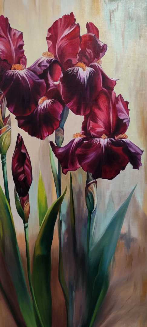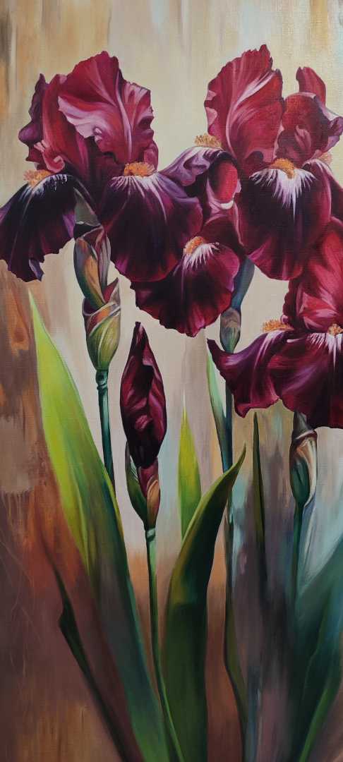 Эта картина написана вручную, без использования печати, каждой кисточкой я передала свою любовь и вдохновение. В процессе создания я чувствовала умиротворение и нежность, которые дарят бордовые ирисы, их глубокий цвет и изящная форма наполняли меня теплом и г