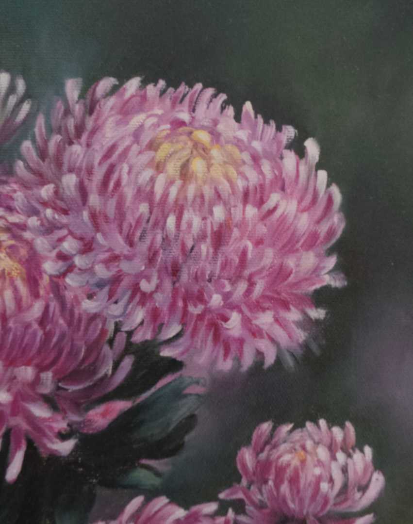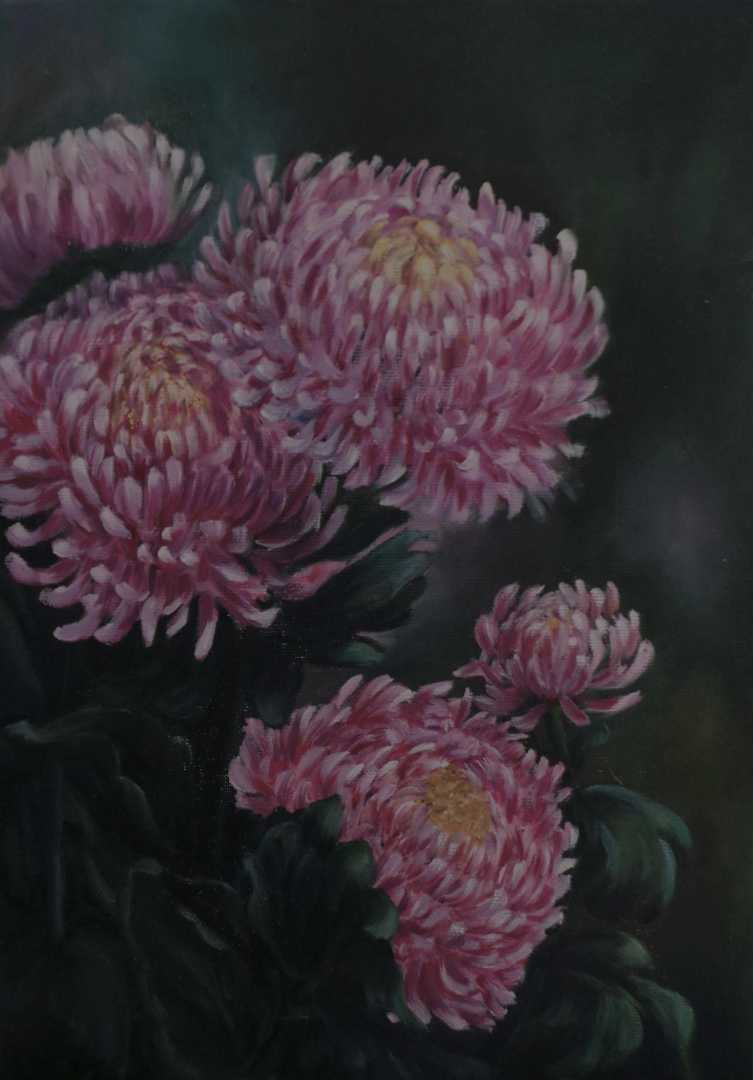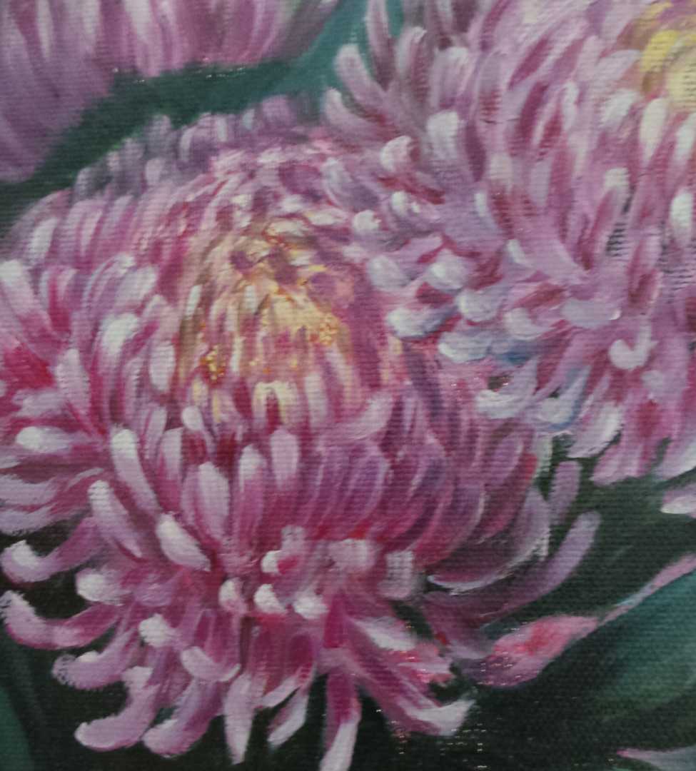 Хризантемы изображены крупным планом, позволяют рассмотреть изгибы лепестков, мягкие складки и тонкие прожилки. Это придаёт р