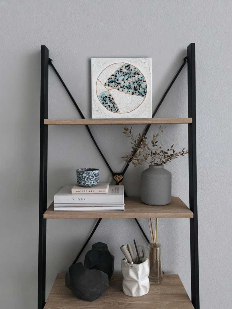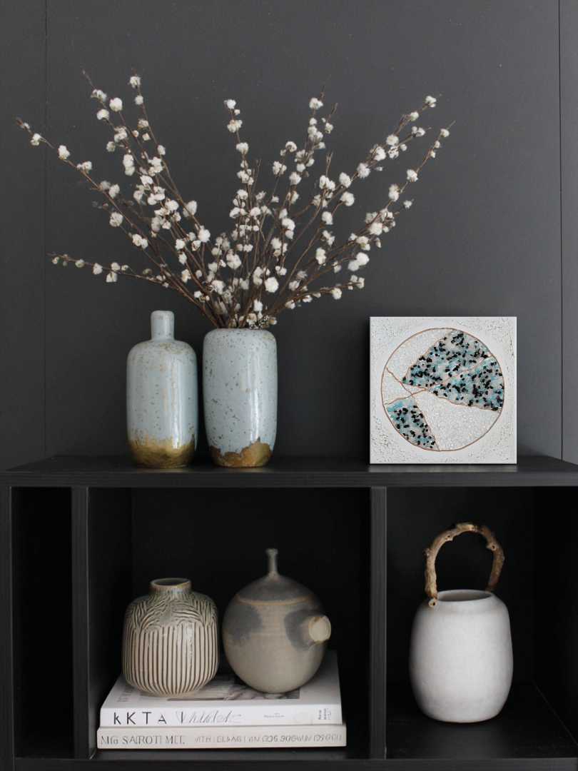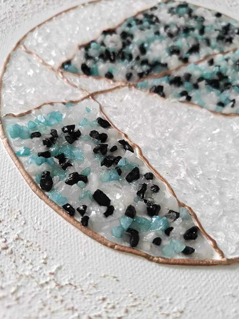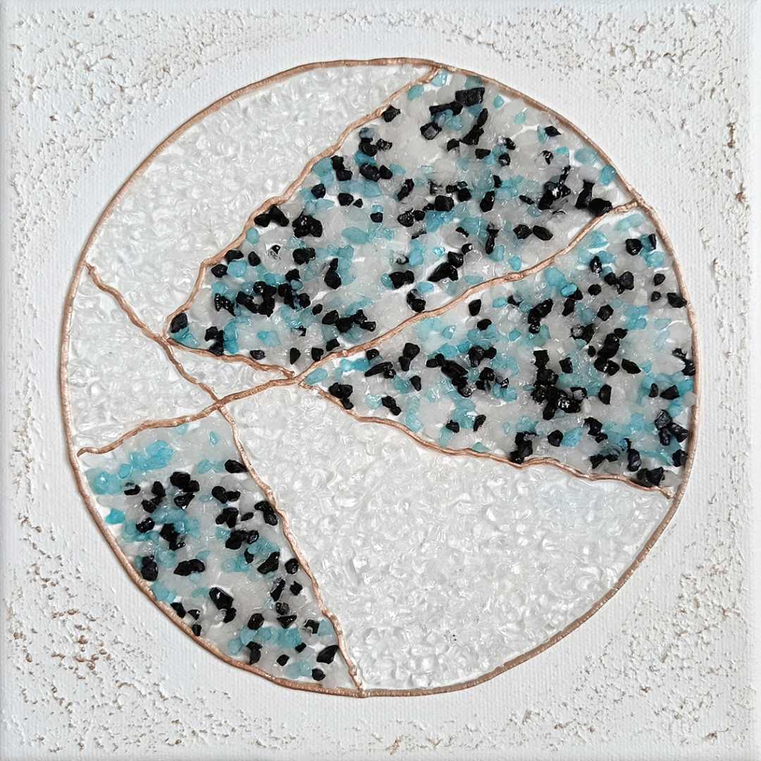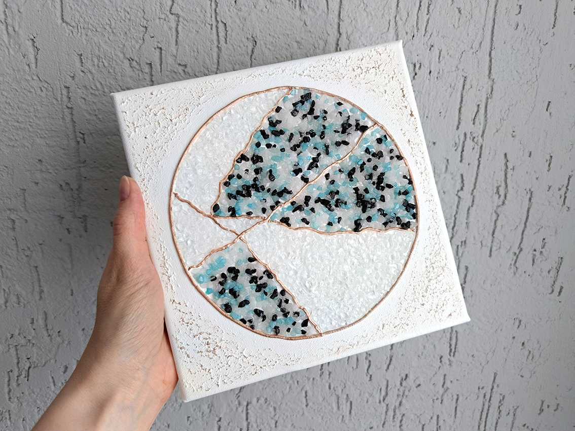 Картина вдохновлена японским искусством восстановления разбитой керамики с помощью золотых или серебряных линий, которые подчеркивают трещины вместо того, чтобы их скрывать. На полотне изображен круг, словно разбитый на несколько частей и вновь соединенный. Цветовая палитра – оттенки белого, голубог