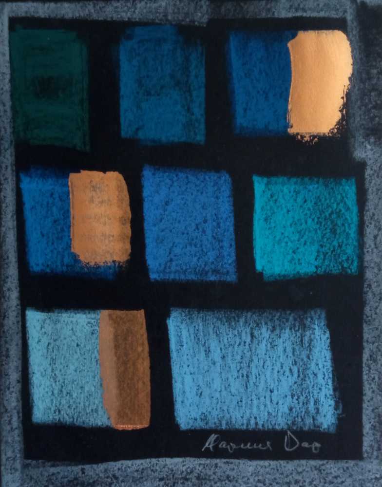 \Картина «Композиция „Море“» — абстрактная работа, построенная на сочетании глубоких синих, бирюзовых и тёплых золотистых оттенков. Геометрическая структура создаёт ритм и ощущение пространства, напоминая морскую гладь и игру света на воде. Контраст холодной палитры и тёплых акцентов усиливает глуби