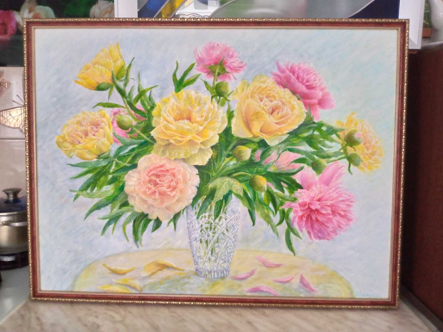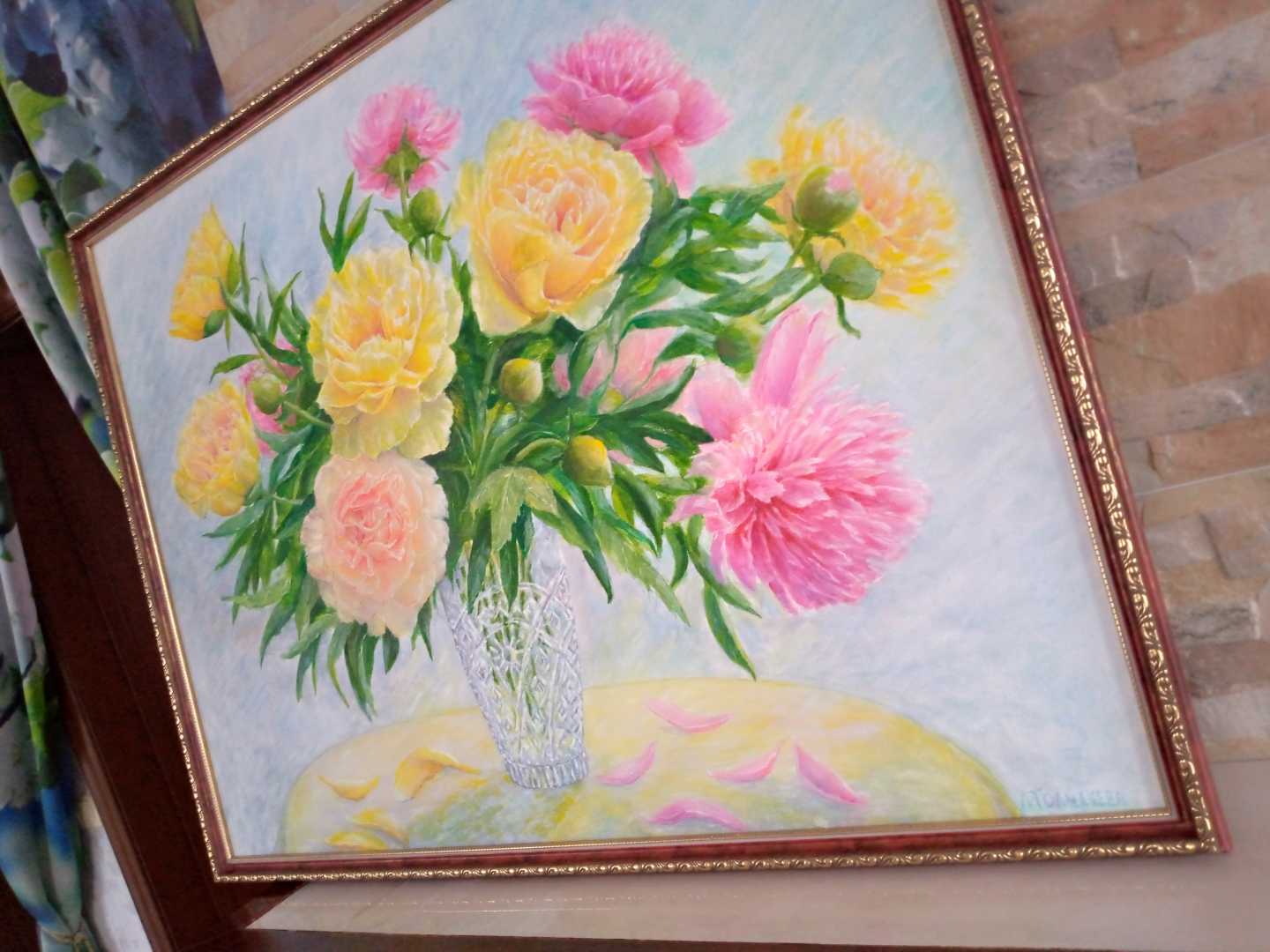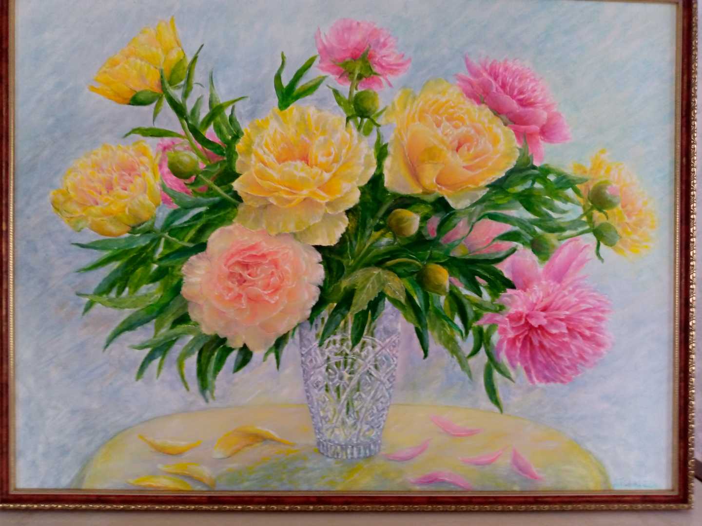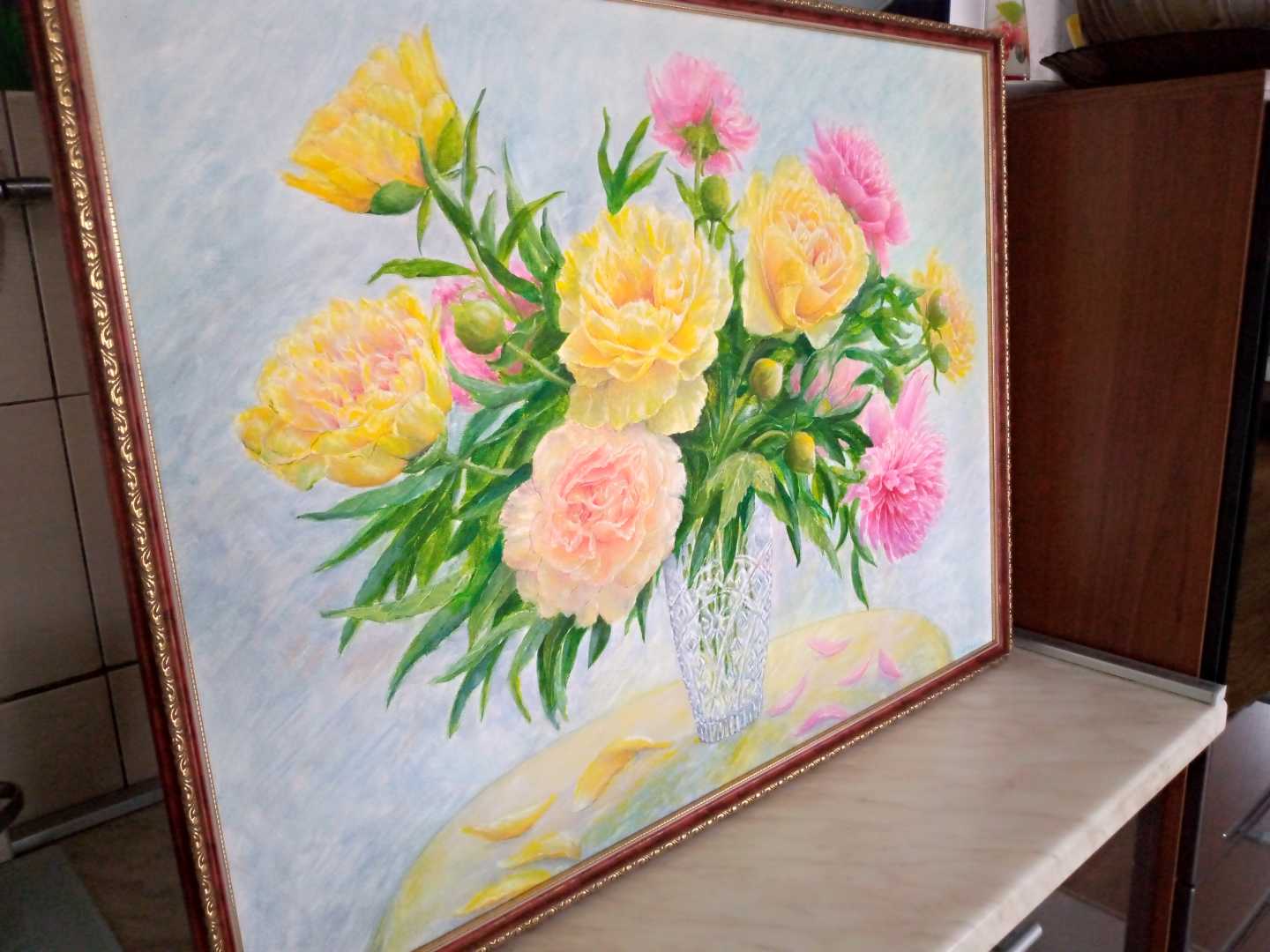 Картина маслом «Пионы в хрустальной вазе» — оригинальная работа в жанре флористической живописи.