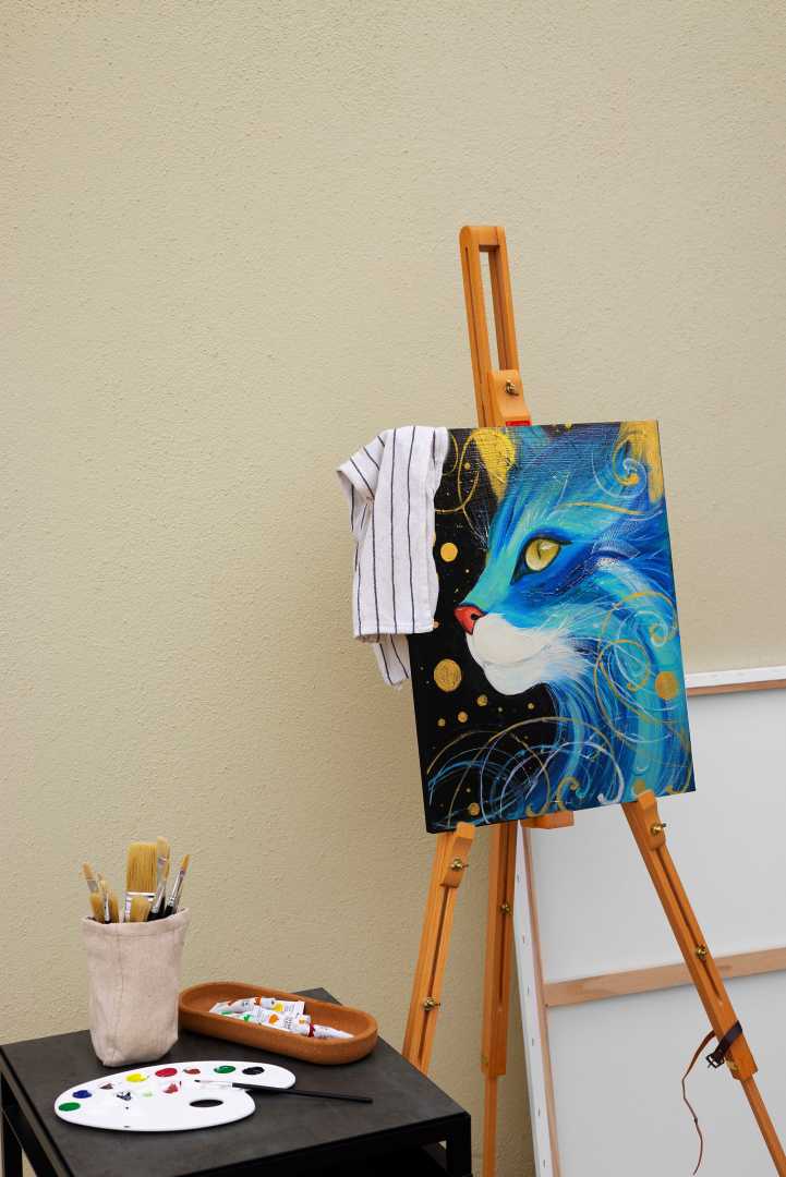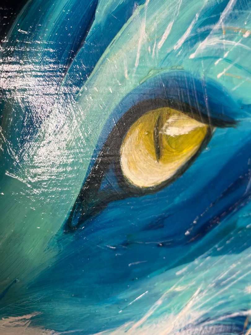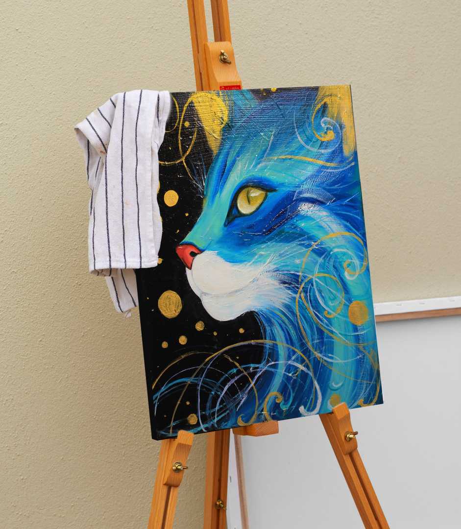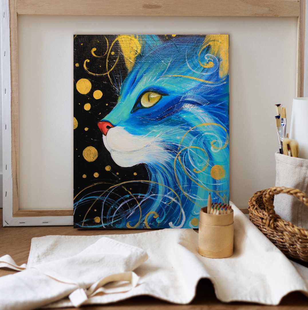 Яркая картина маслом с котом в насыщенных синих и золотых тонах.