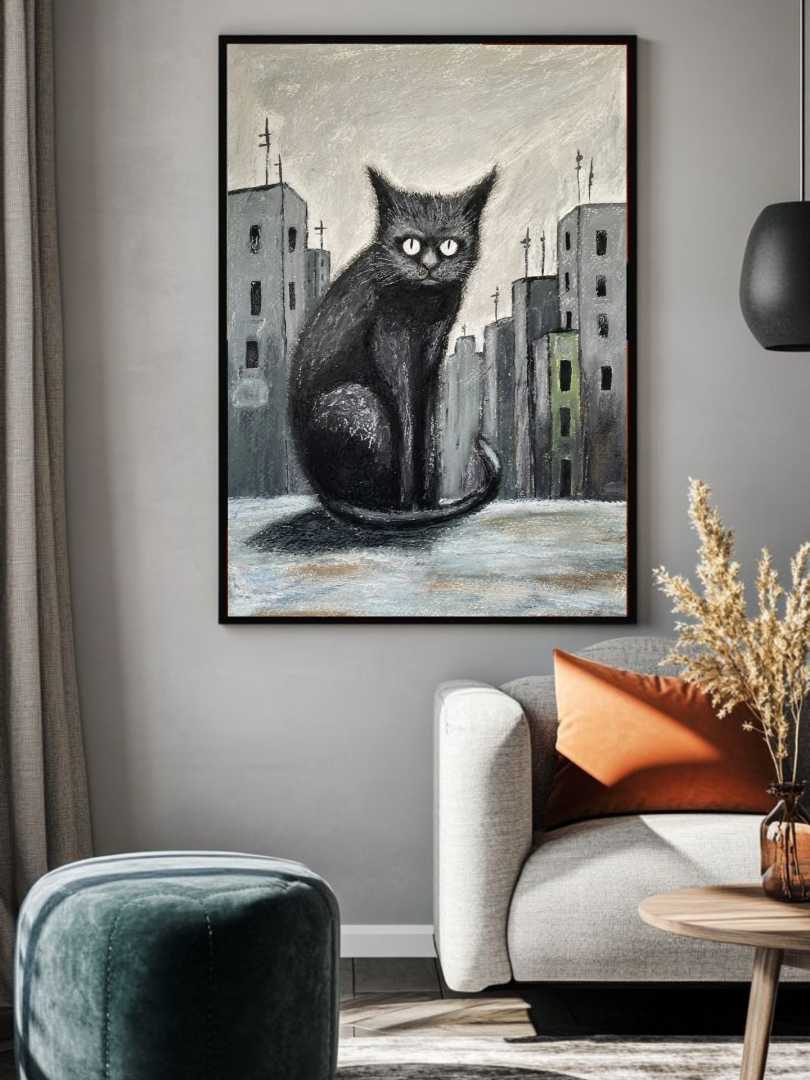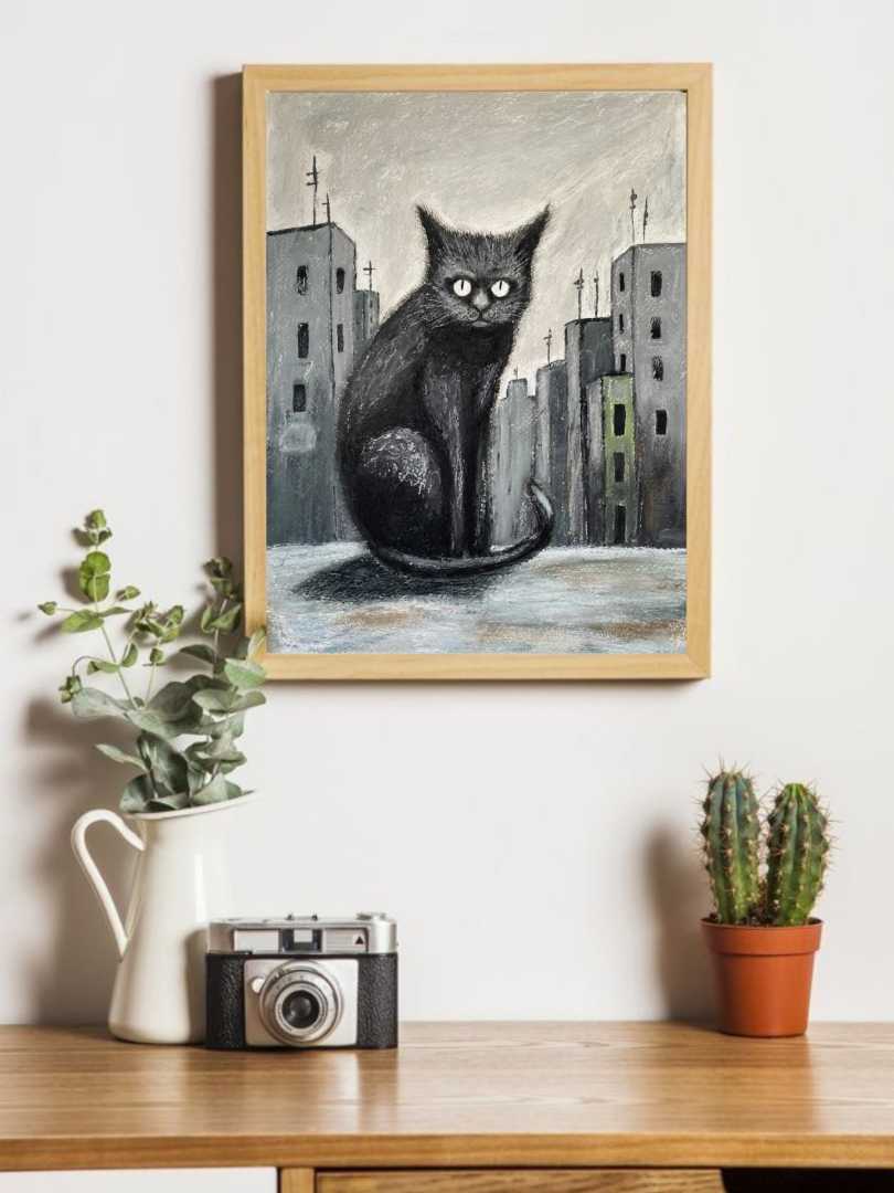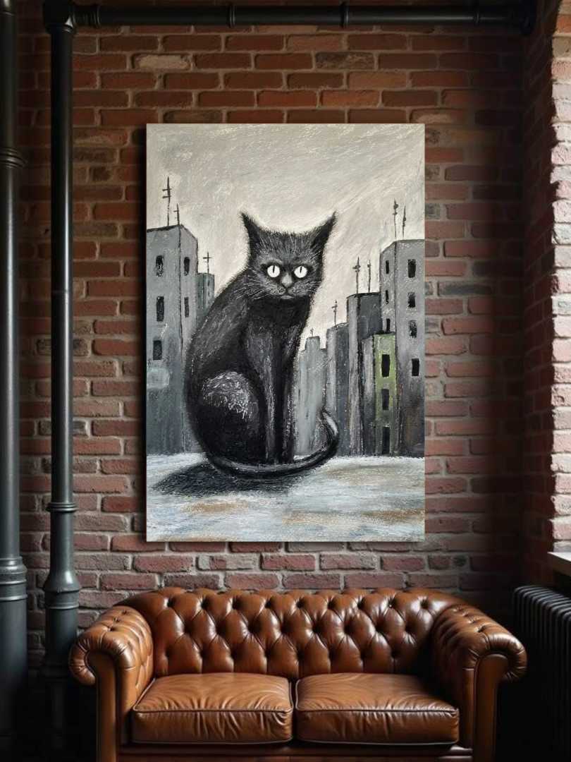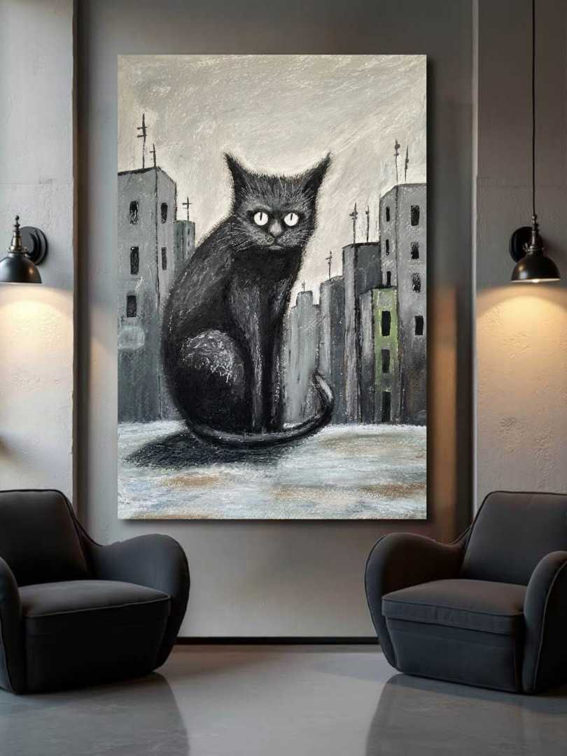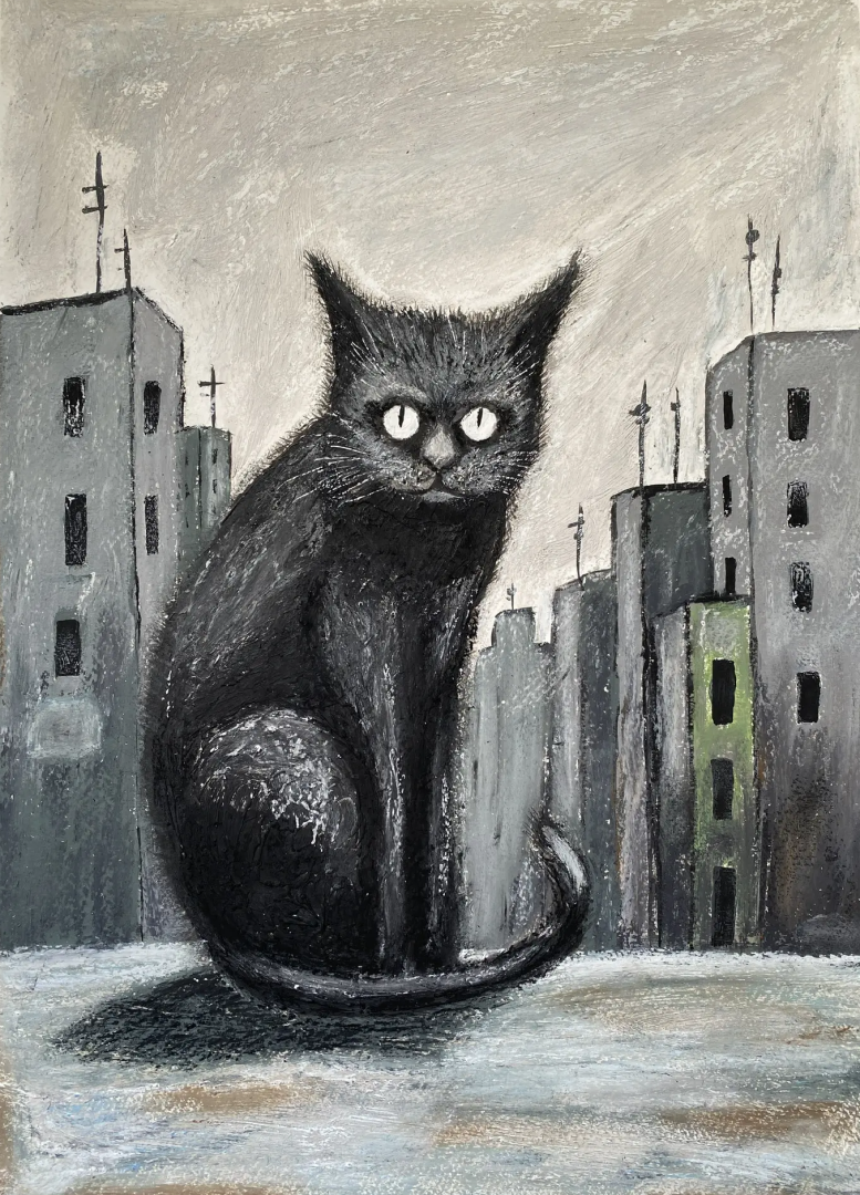 Работа подписана художником Теги:кот в городе, уличный кот, бездомные животные, черный кот, городской пейзаж, серая архитектура, одинокий кот, животные в городе, помощь приютам, благотворительность, живопись кот, современное искусство, реализм, городская тоска, выживание, уличная жизнь, кот на крыше, взгляд кота, иллюстрация животного, социальная тема, картина маслом, пастель, акрил