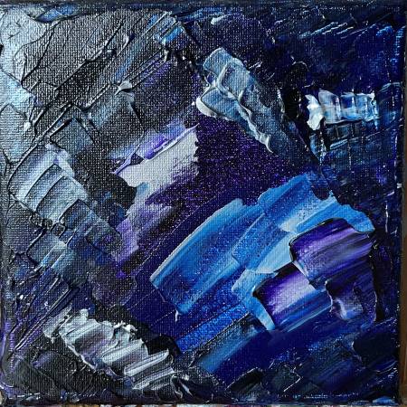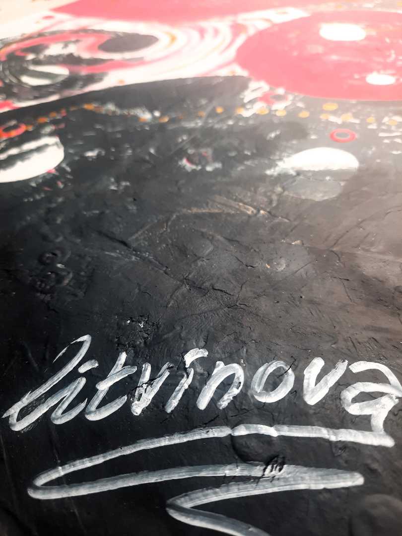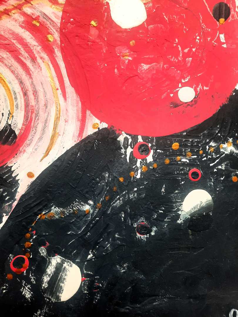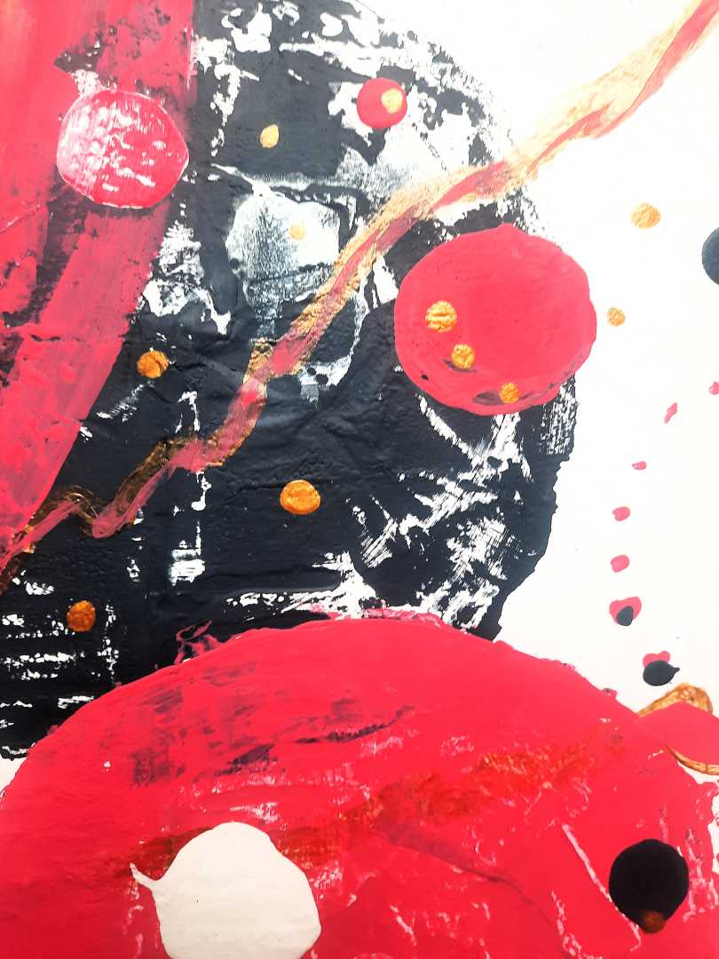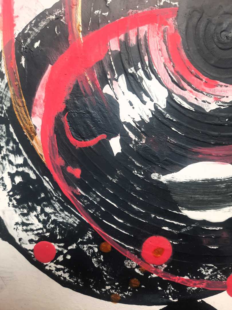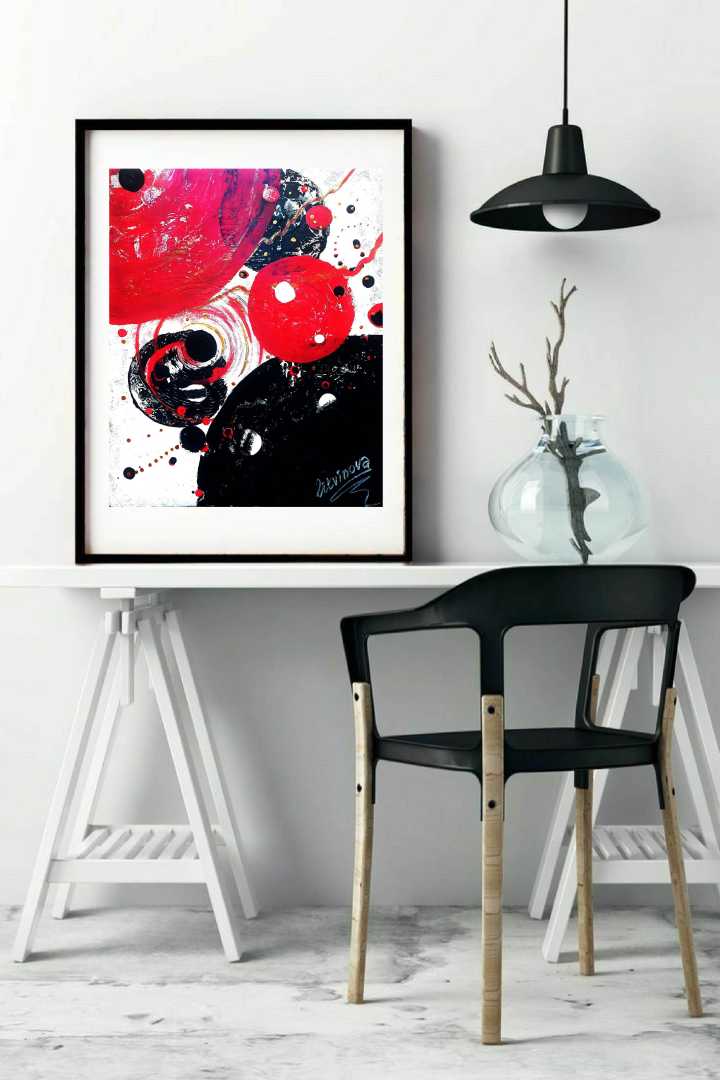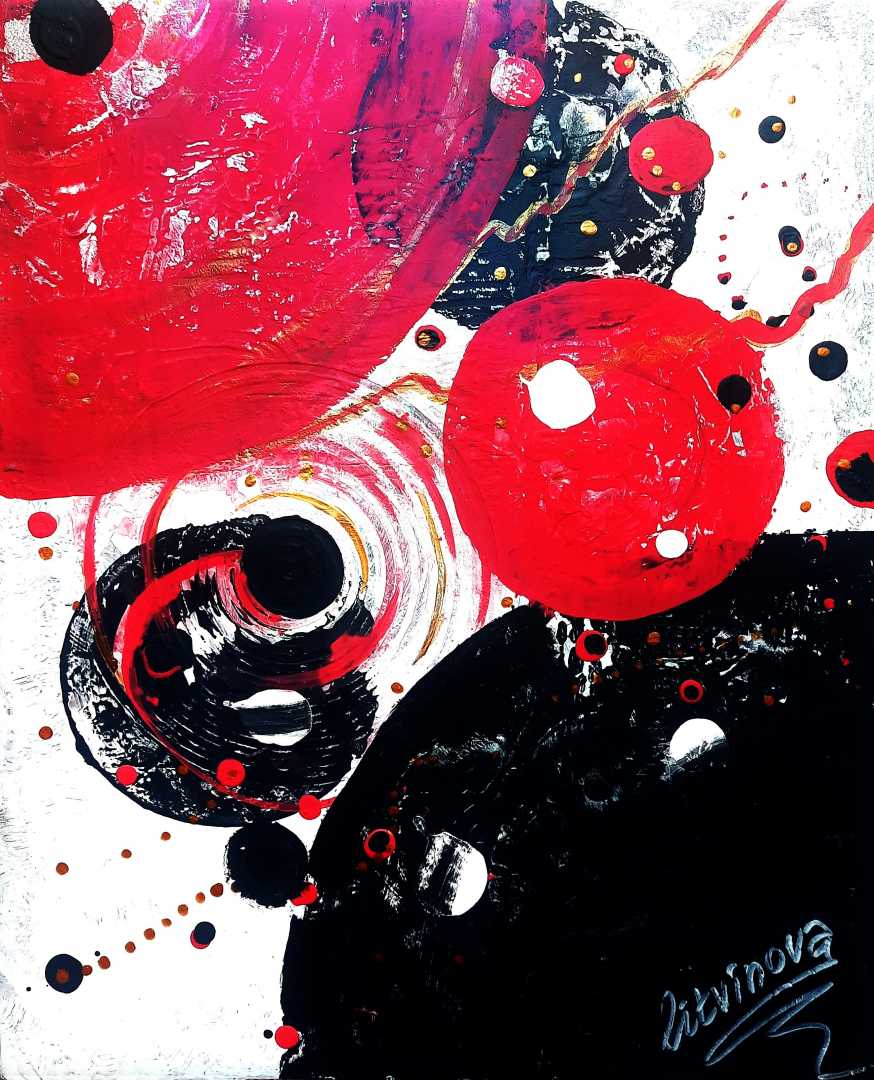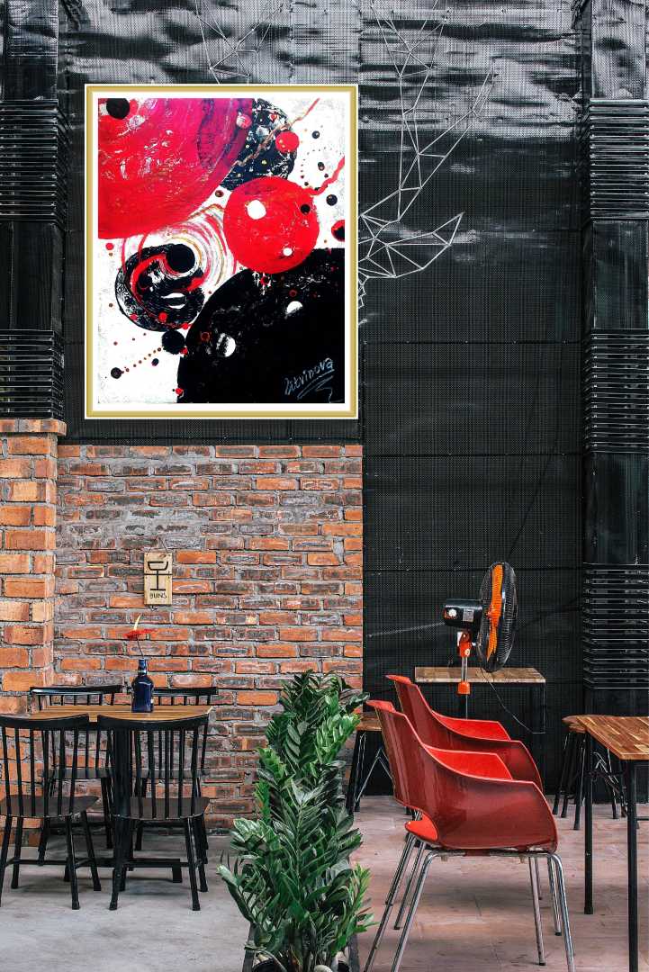 Это произведение выполнено техникой нанесения шпателем, сочетая насыщенные красные и черные оттенки в стилистике абстракционизма. Использовались текстурные слои, создавая уникальный визуальный рельеф. Картина подчеркивает использование контрастных цветов и геометрических форм, а также включает элеме