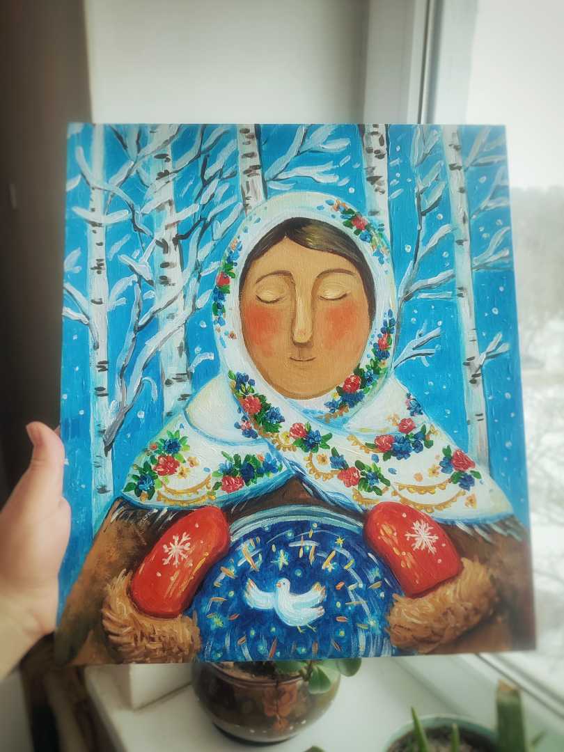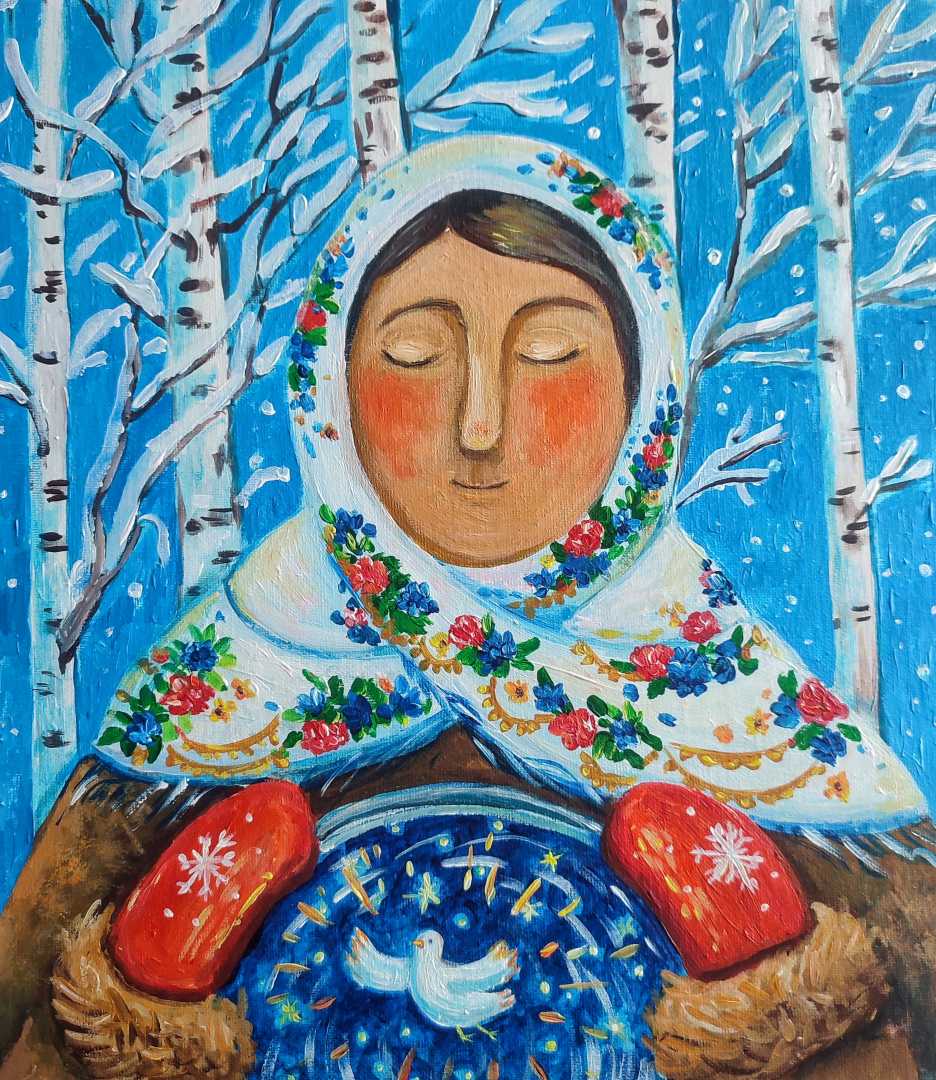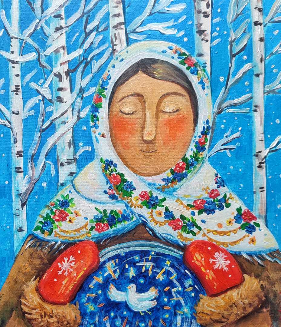 артина «Крещение» — символический образ, вдохновлённый духовной традицией и народной культурой. Женская фигура в белом платке с цветочным орнаментом изображена на фоне зимнего леса, среди берёз и падающего снега. В центре композиции — образ голубя как знак чистоты, света и духовного обновления. Ярка