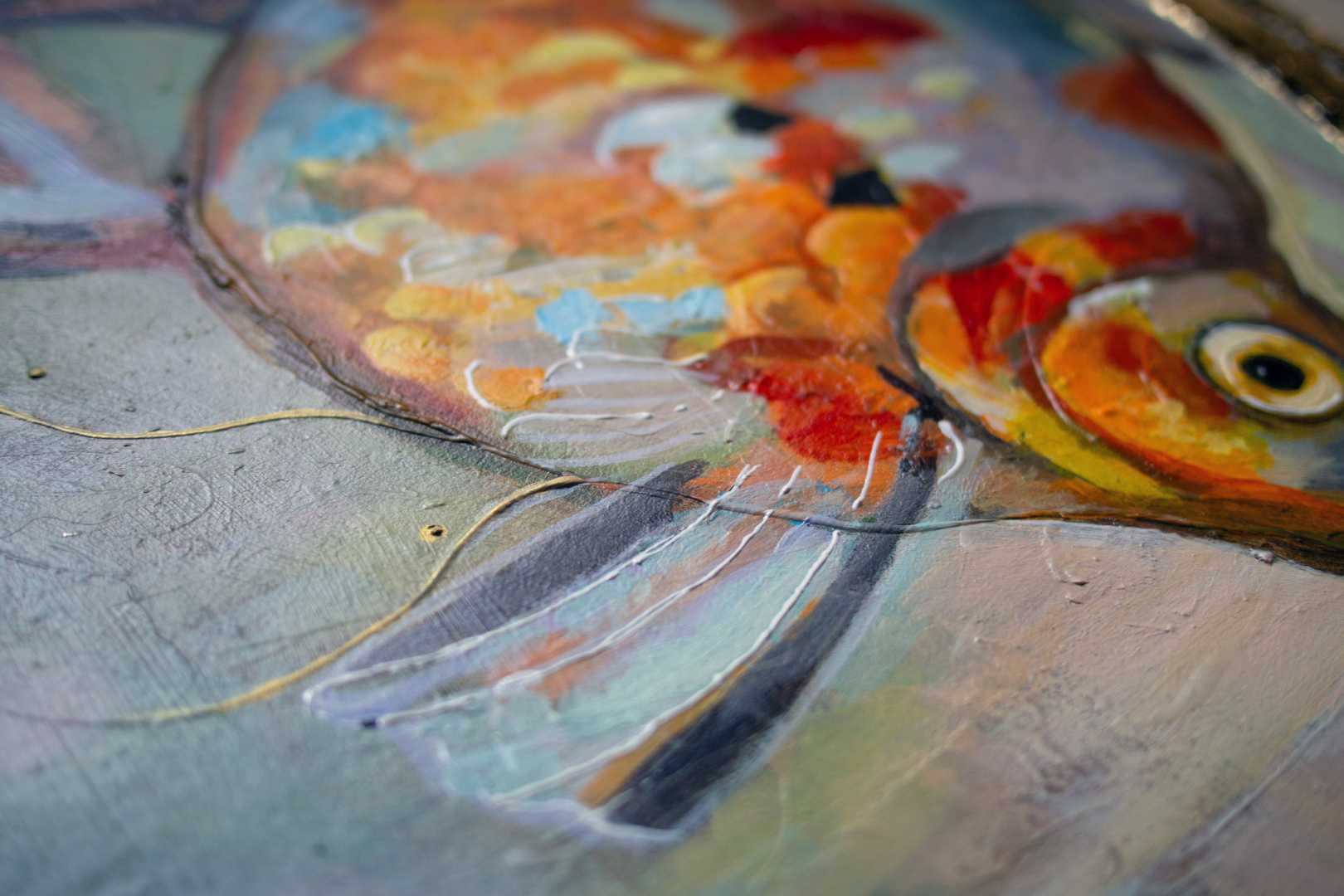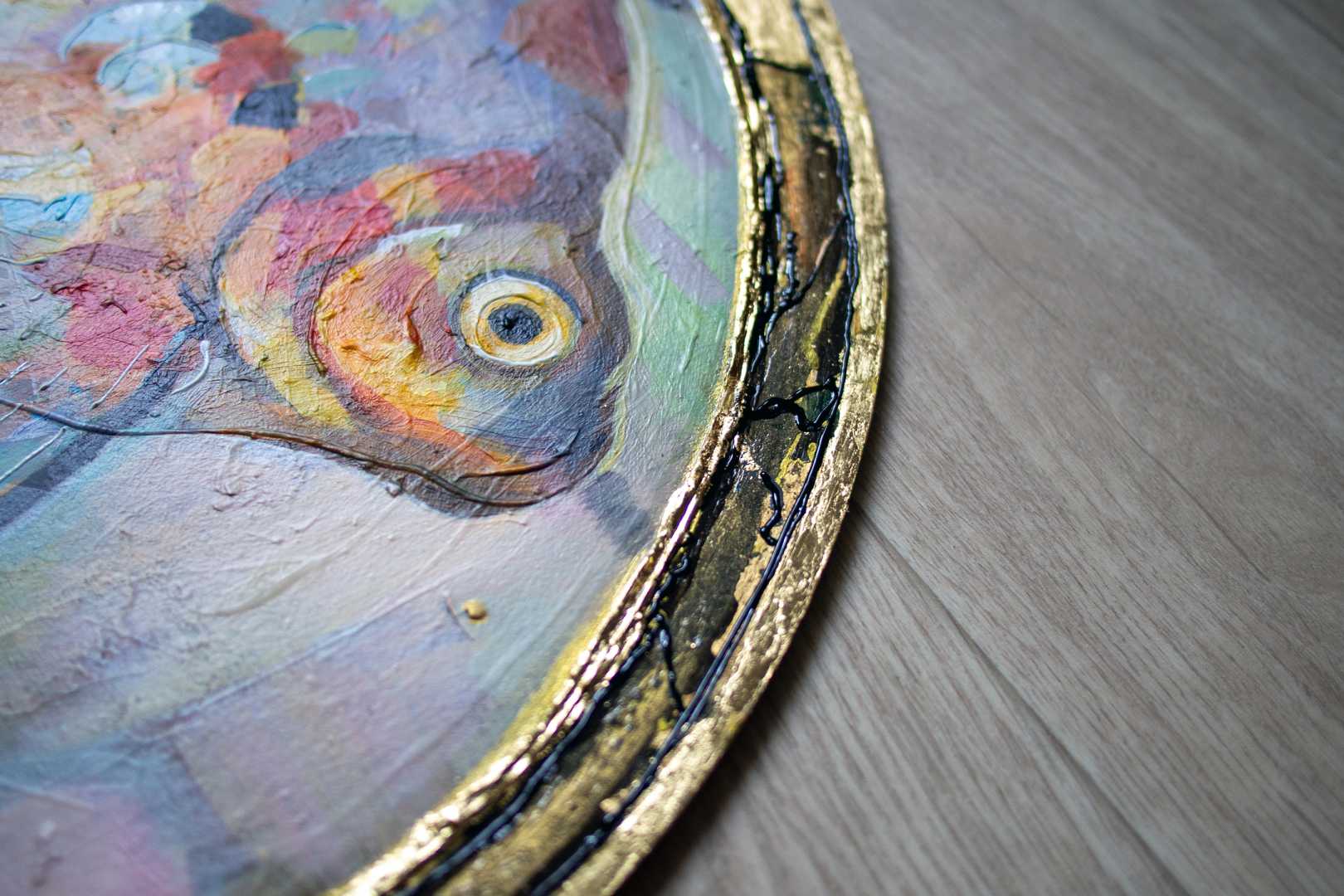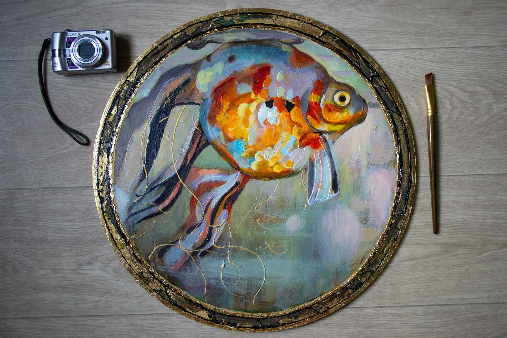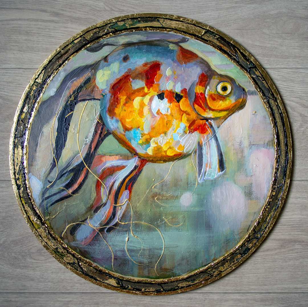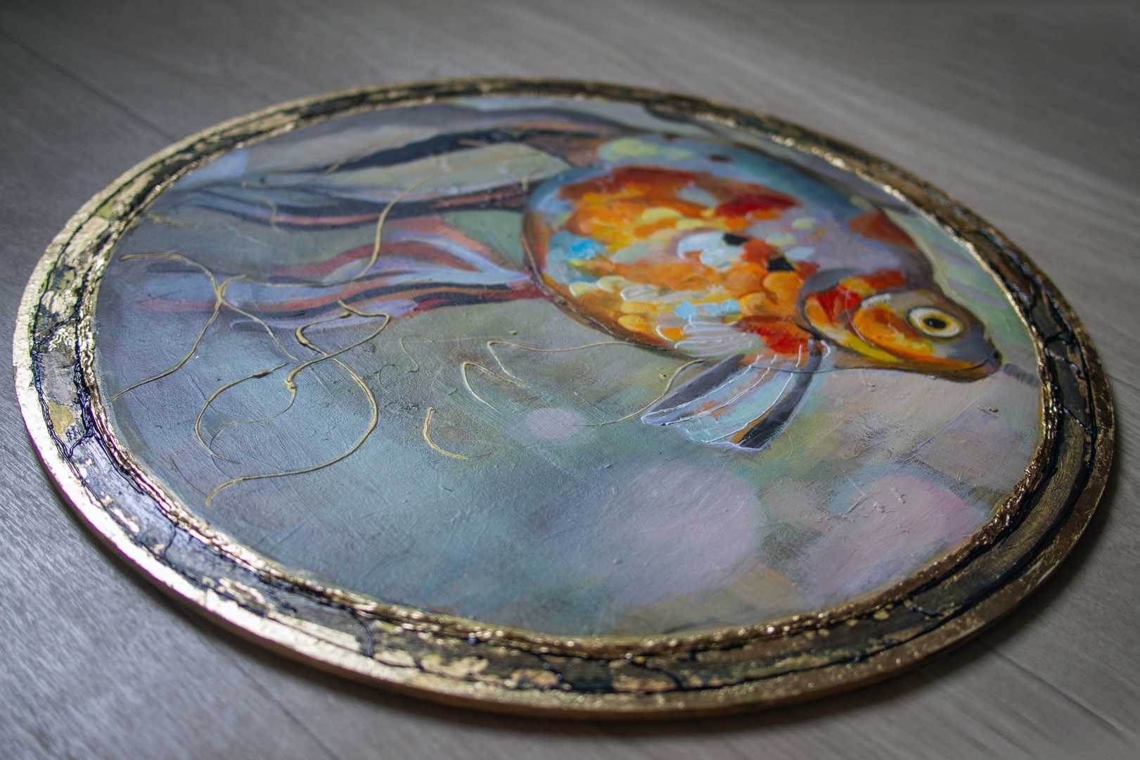 Арт-объект с изображением рыбки риукин, акцентная картина. Символика: Если вы верите в фэн-шуй, золотая рыбка - это символ богатства и удачи, поэтому ее можно разместить в зоне благосостояния (юго-восток квартиры). Подойдет для интерьера в стиле бохо, эклектика, современный, ар-деко, скандин