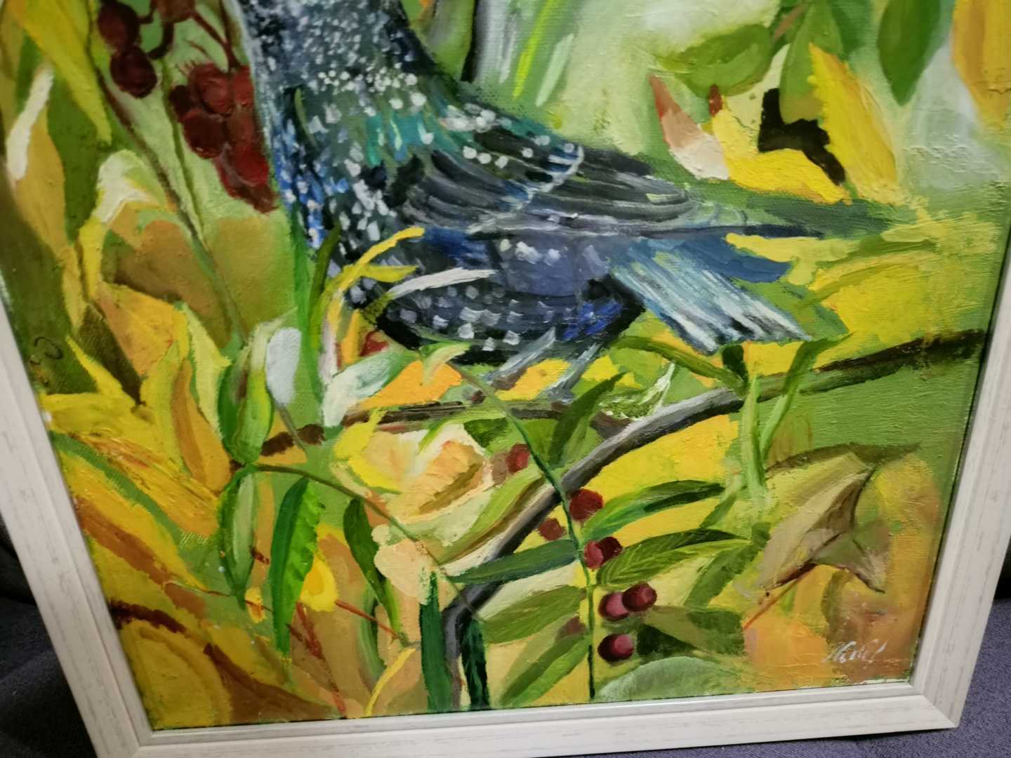 В центре картины изображена кукушка. Лес и ветки в размытом виде.
