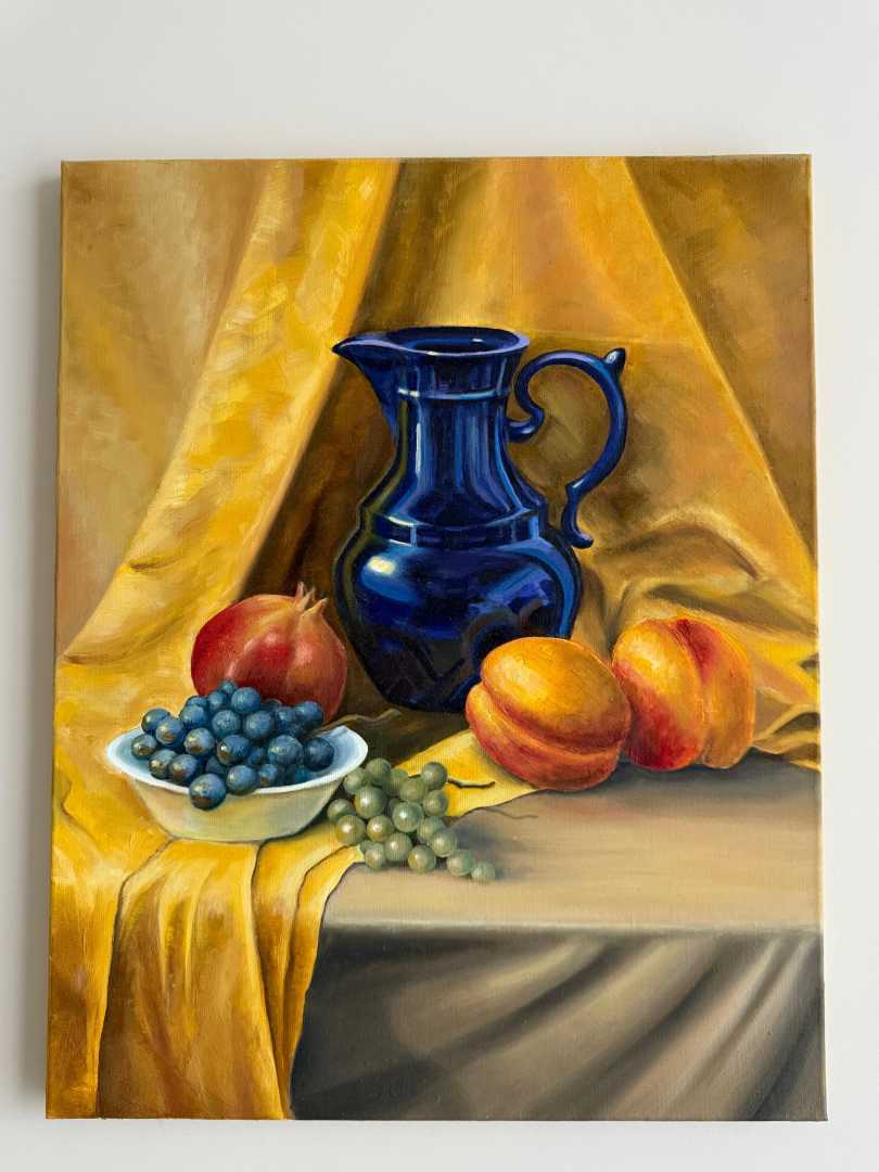 Главный герой полотна — матовый кувшин благородного сине-фиолетового оттенка. Его скульптурный объем и глухой цвет служат идеальным фоном для сочных плодов. Рядом с ним гранат, перс