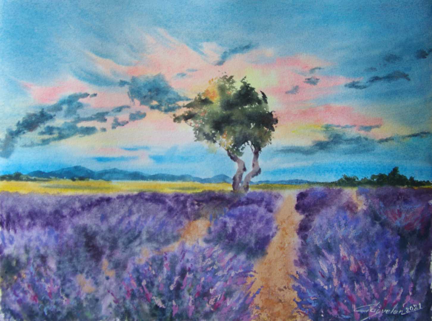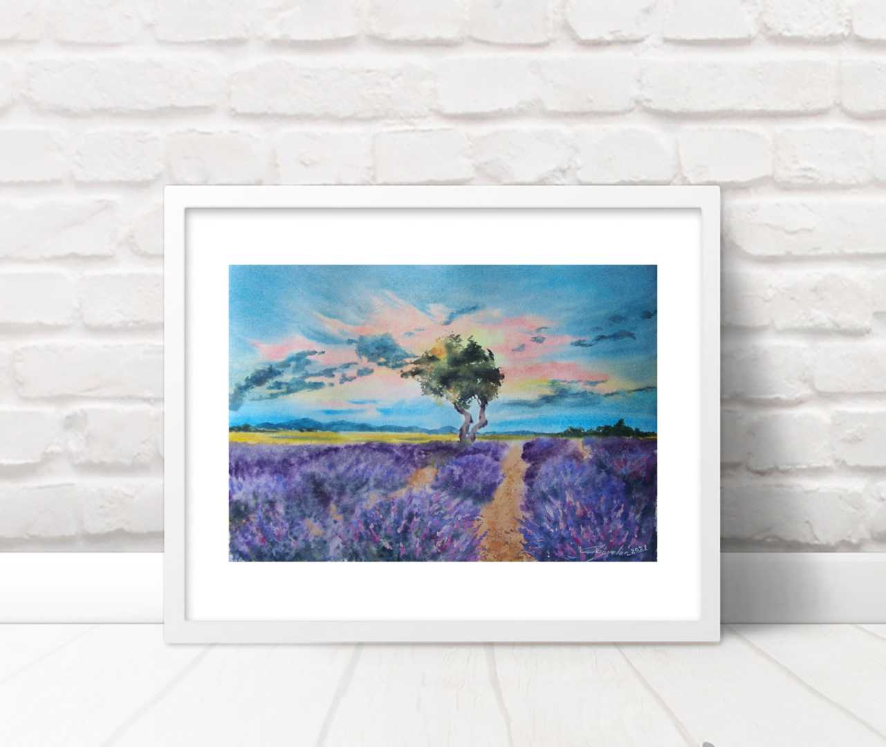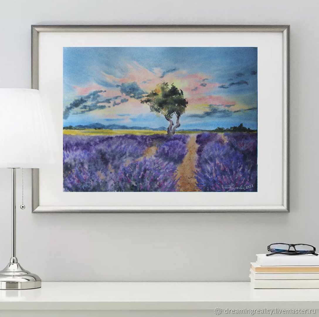 Оригинальная картина акварелью, сельский пейзаж, лаванда, лавандовые поля картина в подарок