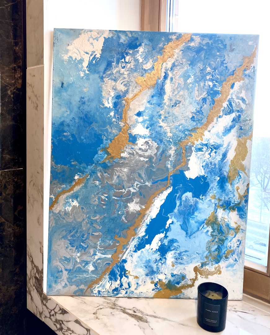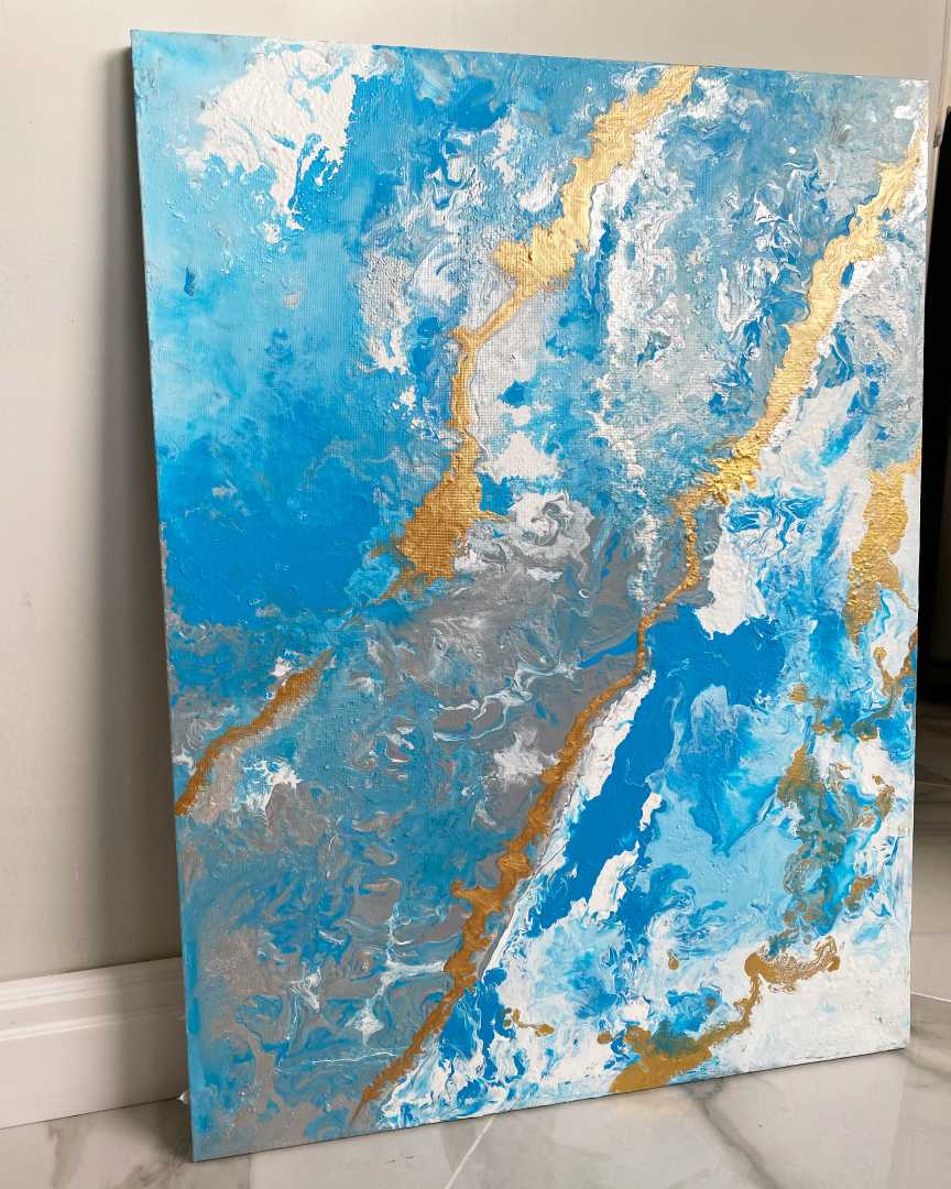 Привнесите в свой дом атмосферу спокойствия и изысканности. Эта абстрактная работа построена на гармонии глубокого синего, чистого белого и текстурного золотого акцента. Золотая нить, проходящая сквозь полотно, напоминает солнечный блик на воде или драгоценную жилу в горной породе.
