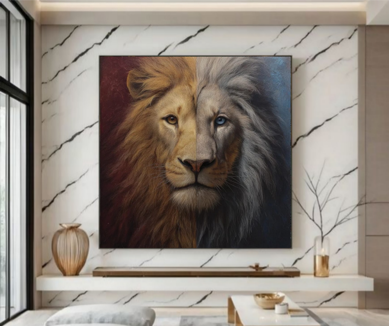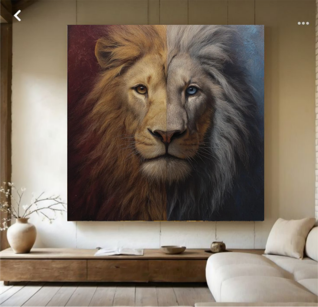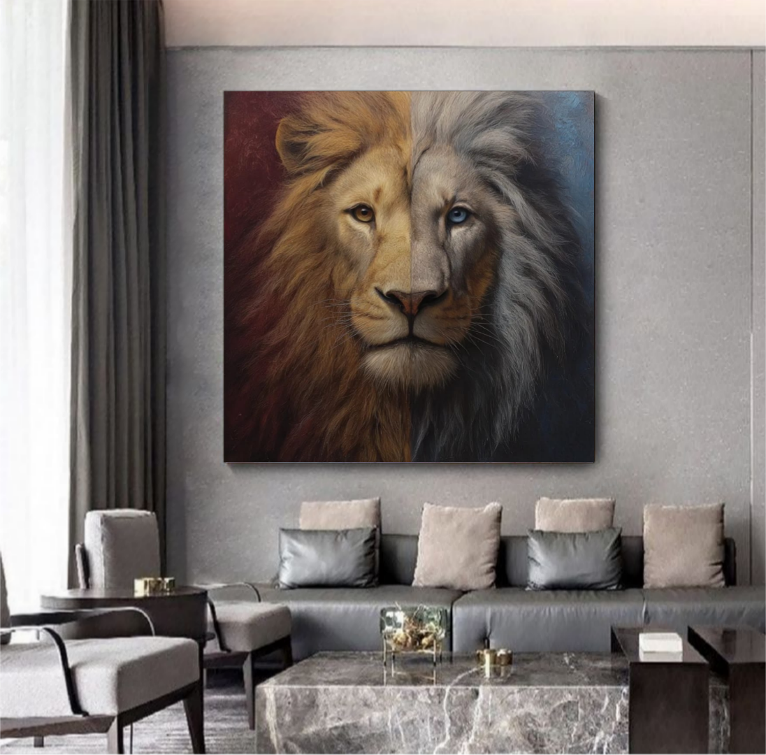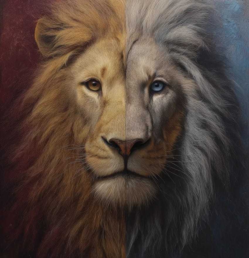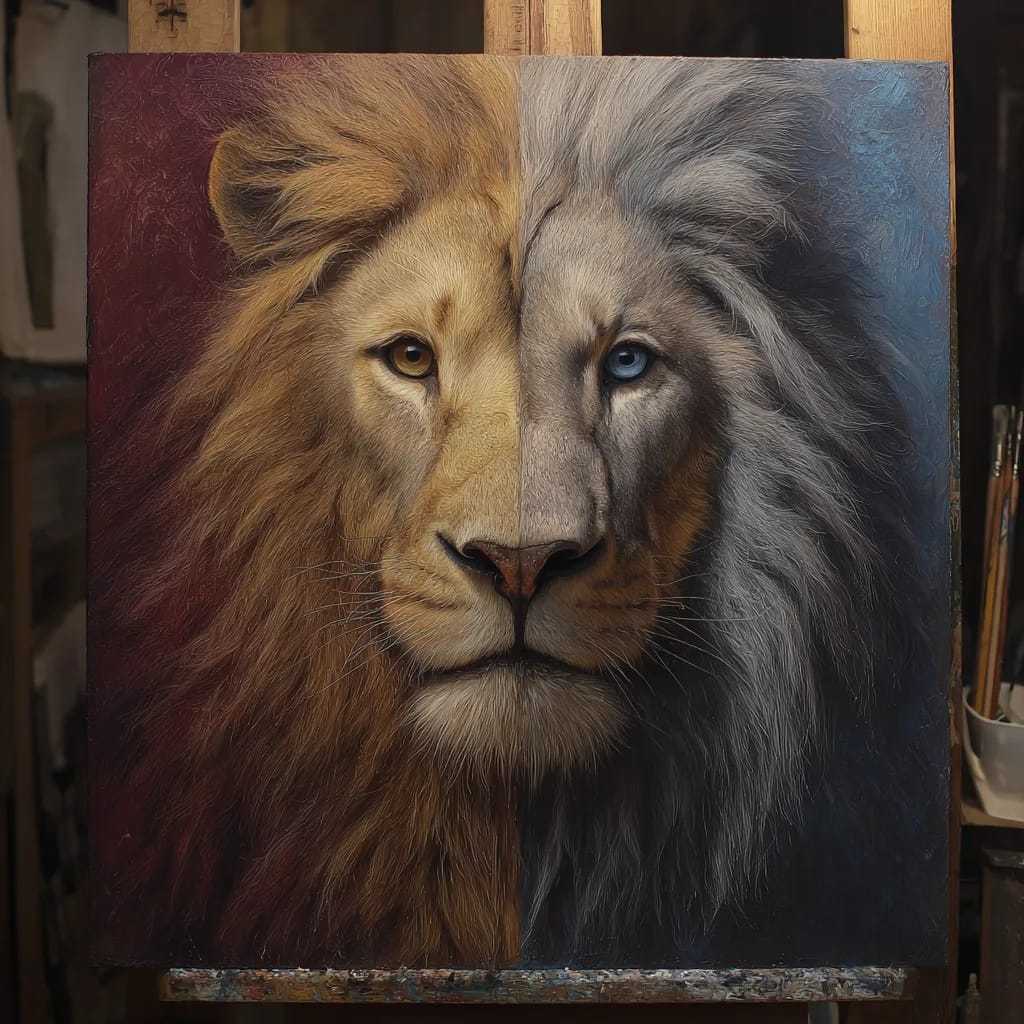 На холсте изображен могущественный лев, разделенный на две половины: одна — яркая, тепло-золотистая, символизирующая мощь, свет и страсть, а другая — холодная, серебристо-синяя, олицетворяющая спокойствие, мудрость и таинственно
