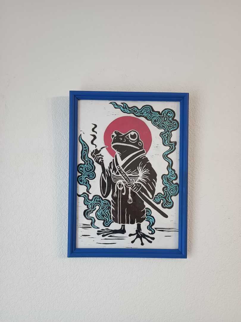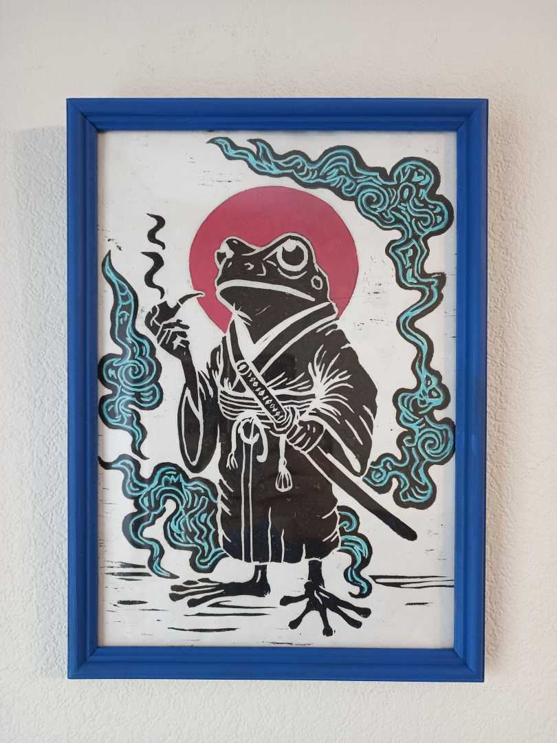 Линогравюра «Фрогги Самурай» — авторская работа ручного изготовления и печати. Образ самурая в виде лягушки выполнен в выразительной графической манере с элементами японской эстетики. Контраст чёрного силуэта, красного солнечного круга и бирюзовых акцентов создаёт динамичную и запоминающуюся компози