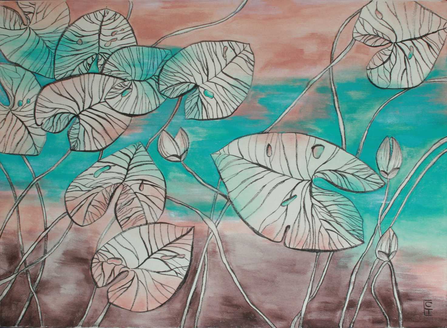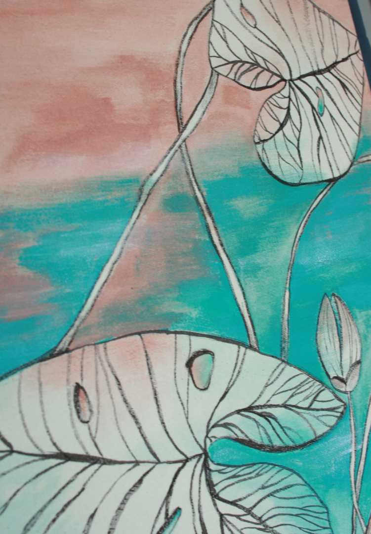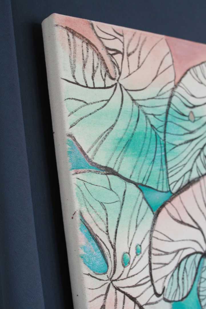 Нежный бирюзовый цвет плавно перетекает в теплые розово-коралловые оттенки сверху и приглушенные коричневые тона снизу. Детально прорисованные прожилки на л